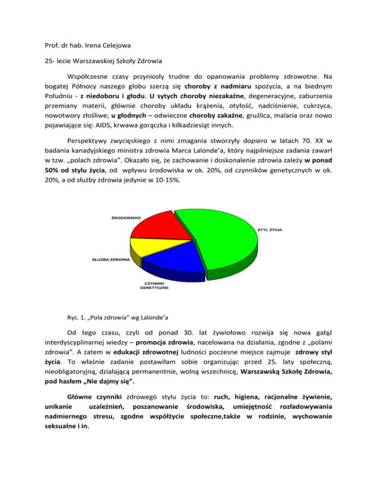 Prof. dr hab. Irena Celejowa 25- lecie Warszawskiej Szkoły Zdrowia Współczesne czasy przyniosły trudne do opanowania problemy zdrowotne. Na bogatej Północy naszego globu szerzą się choroby z nadmiaru spożycia, a na biednym Południu - z niedoboru i głodu. U sytych choroby niezakaźne, degeneracyjne, zaburzenia przemiany materii, głównie choroby układu krążenia, otyłość, nadciśnienie, cukrzyca, nowotwory złośliwe; u głodnych – odwieczne choroby zakaźne, gruźlica, malaria oraz nowo pojawiające się: AIDS, krwawa gorączka i kilkadziesiąt innych. Perspektywy zwycięskiego z nimi zmagania stworzyły dopiero w latach 70. XX w badania kanadyjskiego ministra zdrowia Marca Lalonde’a, który najpilniejsze zadania zawarł w tzw. „polach zdrowia”. Okazało się, że zachowanie i doskonalenie zdrowia zależy w ponad 50% od stylu życia, od wpływu środowiska w ok. 20%, od czynników genetycznych w ok. 20%, a od służby zdrowia jedynie w 10-15%. ŚRODOWISKO STYL ŻYCIA SŁUZBA ZDROWIA CZYNNIKI GENETYCZNE Ryc. 1. „Pola zdrowia” wg Lalonde’a Od tego czasu, czyli od ponad 30. lat żywiołowo rozwija się nowa gałąź interdyscyplinarnej wiedzy – promocja zdrowia, nacelowana na działania, zgodne z „polami zdrowia”. A zatem w edukacji zdrowotnej ludności poczesne miejsce zajmuje zdrowy styl życia. To właśnie zadanie postawiłam sobie organizując przed 25. laty społeczną, nieobligatoryjną, działającą permanentnie, wolną wszechnicę, Warszawską Szkołę Zdrowia, pod hasłem „Nie dajmy się”. Główne czynniki zdrowego stylu życia to: ruch, higiena, racjonalne żywienie, unikanie uzależnień, poszanowanie środowiska, umiejętność rozładowywania nadmiernego stresu, zgodne współżycie społeczne,także w rodzinie, wychowanie seksualne i in. Ryc.2. Czynniki zdrowego stylu życia Wytyczne dla zdrowego stylu życia stwarzają wyniki badań w licznych dyscyplinach naukowych. Wielkim atutem Warszawskiej Szkoły Zdrowia, w której wszyscy: i organizatorzy i wspaniali wykładowcy - są wolontariuszami – jest zyskiwanie współpracy specjalistów najwyższej rangi, profesorów, docentów, doktorów, często dyrektorów i kierowników najważniejszych instytucji naukowych i dydaktycznych w Polsce. Formą naszej pracy są wykłady i panele pt. „Biesiada o zdrowiu”. Nauczanie zdrowego stylu życia ma na celu zapobieganie przede wszystkim chorobom społecznym, których istota, leczenie i rehabilitacja są również tematem zajęć. W celu utrwalenia zdobytej wiedzy, prowadzimy działalność wydawniczą. Ukazały się dwa tomy monografii z wyborem wykładów z 10. lat oraz 11 tomów czasopisma „Roczniki Warszawskiej Szkoły Zdrowia”. Wszystkie wydawnictwa i różne materiały są rozprowadzane bezpłatnie. Dzięki takiej metodzie pracy cieszymy się niezmiennie wysoką frekwencją słuchaczy w zajęciach. W ciągu 25. lat działalności Warszawskiej Szkoły Zdrowia nie zawiódł nas żaden ze znakomitych wykładowców. Również przez to całe ćwierćwiecze osobiście prowadziłam wszystkie dotychczasowe zajęcia.