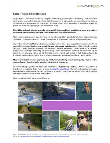 ` Kasia – czuję się szczęśliwa Dzięki diecie... zmieniłam całkowicie swój styl życia i czuję się szczęśliwa. Wcześniej - zero ruchu lub ewentualnie spacer, fast foody, słodycze, obiady kupowane w barze, jedzenie produktów (a nie potraw przyrządzanych własnoręcznie), mało snu. W pracy byłam mało asertywna i siedziałam długo po godzinach stresując się przy tym. Nie myślałam o sobie. Efekt 10kg nadwagi, wieczne wzdęcia, niepewność siebie, problemy z zajściem w ciążę oraz pakiet: Hashimoto, niedoczynność tarczycy, insulinooporność oraz hiperinsulemia. Momentem przełomowym była dla mnie wizyta u lekarza, który poradził znalezienie odpowiedniego dietetyka. I znalazłam - Iwonkę :) mimo że mieszkam w Warszawie, a Iwona przyjmuje w Opolu. Wyrobiłam sobie kartę Multisport i zaczęłam codziennie ćwiczyć - do pracy jeżdżę rowerem, chodzę na zajęcia fitness, basen. Czuję się, że uzależniłam się od nowego stylu życia. Jest mi źle bez jednego dnia ćwiczeń i mam wyrzuty sumienia po zjedzeniu czegoś słodkiego. Posiłki planuję w sobotęprzygotowuję jadłospis oraz listę zakupów. Dzięki temu nie marnuję jedzenia, co przekłada się na oszczędności. W pracy stałam się bardziej asertywna - nawet jeśli muszę zostać dłużej w biurze to wychodzę na godzinę na zajęcia fitness. Dzięki ćwiczeniom rozładowuję napięcie i lepiej sypiam. Moje wyniki badań również poprawiły się - TSH unormowało się, przeciwciała spadły, insulina jest w normie. Stałam się pełna życia, wesoła, a nie wiecznie zmęczona. W lipcu planuję wyjechać na wycieczkę rowerową 2 tygodniową - Łotwa, Estonia - 1000km w 2 tygodnie. A to wszystko dzięki Tobie Iwonka - czytając Twojego bloga, o Twoich podróżach rowerowych zainspirowałaś mnie i postanowiłam coś zmienić w swoim życiu. Czuję, że jestem coraz bliżej mojego marzenia - zajścia w ciążę i wiem, że to się uda! Kasia stosuje protokół autoimmunologiczny. Ajwen – dietetyk kliniczny i trener personalny - mgr Iwona Wierzbicka. Gabinet i Studio Treningu Personalnego: Opole, ul. Słowackiego 6/11. Tel. 796 122 070. www.ajwen.pl, email: [email protected]. www.ajwendieta.pl www.30-dniowe-wyzwanie.pl