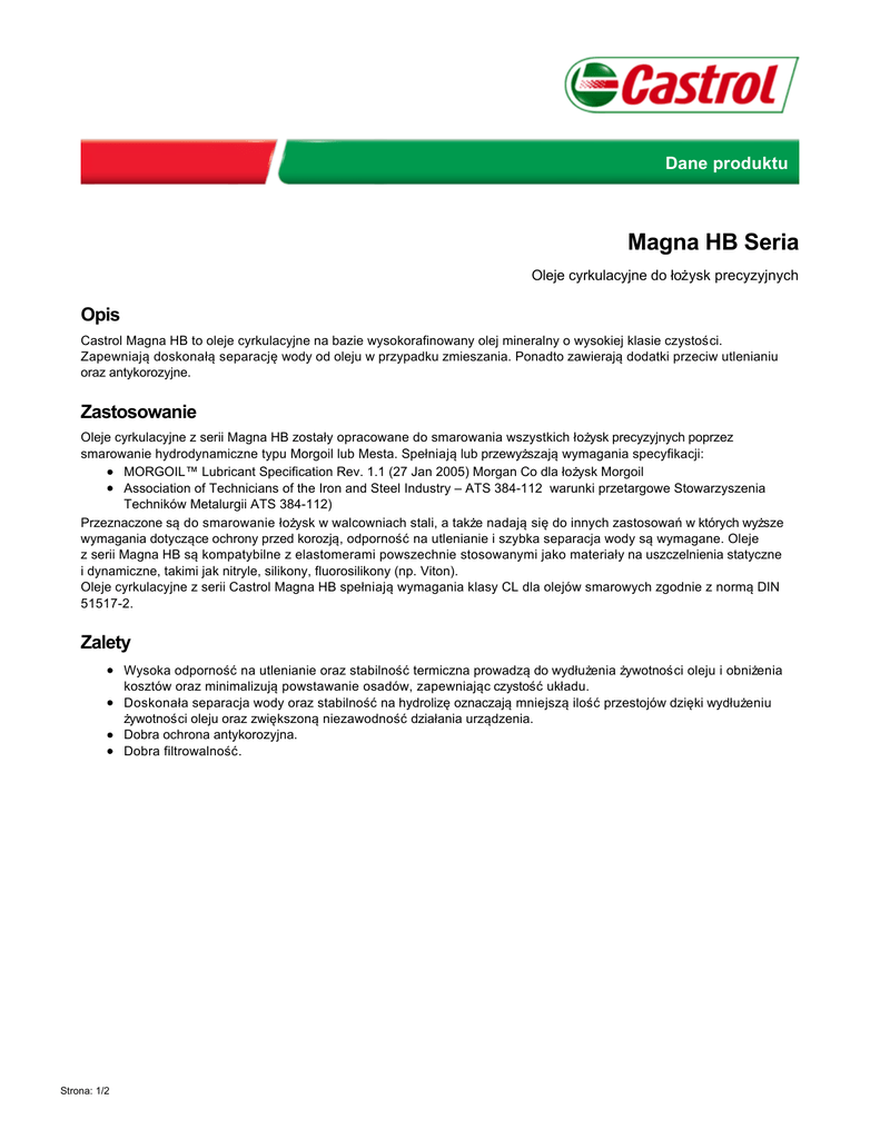 Dane produktu Magna HB Seria Oleje cyrkulacyjne do łożysk precyzyjnych Opis Castrol Magna HB to oleje cyrkulacyjne na bazie wysokorafinowany olej mineralny o wysokiej klasie czystości. Zapewniają doskonałą separację wody od oleju w przypadku zmieszania. Ponadto zawierają dodatki przeciw utlenianiu oraz antykorozyjne. Zastosowanie Oleje cyrkulacyjne z serii Magna HB zostały opracowane do smarowania wszystkich łożysk precyzyjnych poprzez smarowanie hydrodynamiczne typu Morgoil lub Mesta. Spełniają lub przewyższają wymagania specyfikacji: MORGOIL™ Lubricant Specification Rev. 1.1 (27 Jan 2005) Morgan Co dla łożysk Morgoil Association of Technicians of the Iron and Steel Industry – ATS 384-112 warunki przetargowe Stowarzyszenia Techników Metalurgii ATS 384-112) Przeznaczone są do smarowanie łożysk w walcowniach stali, a także nadają się do innych zastosowań w których wyższe wymagania dotyczące ochrony przed korozją, odporność na utlenianie i szybka separacja wody są wymagane. Oleje z serii Magna HB są kompatybilne z elastomerami powszechnie stosowanymi jako materiały na uszczelnienia statyczne i dynamiczne, takimi jak nitryle, silikony, fluorosilikony (np. Viton). Oleje cyrkulacyjne z serii Castrol Magna HB spełniają wymagania klasy CL dla olejów smarowych zgodnie z normą DIN 51517-2. Zalety Wysoka odporność na utlenianie oraz stabilność termiczna prowadzą do wydłużenia żywotności oleju i obniżenia kosztów oraz minimalizują powstawanie osadów, zapewniając czystość układu. Doskonała separacja wody oraz stabilność na hydrolizę oznaczają mniejszą ilość przestojów dzięki wydłużeniu żywotności oleju oraz zwiększoną niezawodność działania urządzenia. Dobra ochrona antykorozyjna. Dobra filtrowalność. Strona: 1/2 Dane Techniczne Nazwa Metoda Jednostka HB 150 HB 220 HB 320 HB 460 HB 680 Klasa wg ISO ISO 3448 - 150 220 320 460 680 Gęstość przy 15°C ASTM D1298 kg/m3 885 889 894 899 860 Lepkość kinematyczna przy 40°C ASTM D445 / ISO 3104 mm 2/s 150 220 320 460 680 Lepkość kinematyczna przy 100°C ASTM D445 / ISO 3104 mm 2/s 14,5 19 25,1 30,2 41 Wskaźnik lepkości ASTM D 2270 / ISO 2909 - >95 >95 >95 >95 >95 Temperatura płynięcia ISO 3016 / ASTM D 97 °C -12 -12 -12 -9 -9 Temperatura zapłonu (COC) ISO 2592 °C 220 226 226 232 265 Test na pienienie w 24°C ISO 6247 ml/ml 10/0 10/0 10/0 10/0 10/0 Demulgowanie wody przy 82°C ISO 6614 min 10 15 15 20 20 Korozja na miedzi (3 godz. przy 100°C) ISO 2160 - 1b 1b 1b 1b 1b Korozja na stali ISO 7120 - 0 0 0 0 0 Powyższe dane są typowymi wartościami uzyskiwanymi przy normalnych tolerancjach produkcyjnych i nie stanowią specyfikacji technicznych. Dodatkowe informacje MORGOIL jest znakiem firmowym Morgan Construction Company. Składowanie Wszystkie opakowania powinny być składowanie w pomieszczeniach zamkniętych. W przypadku magazynowania na zewnątrz budynku beczki należy składować w pozycji horyzontalnej, aby uniknąć przedostania się wody oraz zamazania oznakowania na beczkach. Produktów nie należy przechowywać w temperaturze powyżej 60°C, wystawiać na działanie promieni słonecznych lub mrozu. Magna HB Seria 12 Nov 2013 Castrol, i zwi¹zane z nimi znaki, s¹ znakami towarowymi Castrol Limited, ui s¹ wykorzystywane na podstawie licencji. Prawne wylaczenie Karta produktu i informacje w niej zawarte sa aktualne w momencie jej tworzenie i wydruku. Jednakze , nie dajemy gwarancji ze prezentowane wyrazenia lub zasugerowane zwroty , sa dokladne, precyzyjne i kompletne. Dane zawarte sa oparte na testach wykonanych w warunkach laboratoryjnych i nalezy je traktowac jako wskazówke i ogólna informacje. Uzytkownikom radzimy upewnic sie ze korzystaja z najnowszej wersji karty danych. Uzytkownicy sa odpowiedzialni za bezpieczne uzycie produktu , zgodnie z zastosowaniem i odpowiednim doborem , stosujac sie do wszystkich odpowiednich regulacji i wymagan prawnych. Karta bezpieczenstwa produktu SDS jest dostepna dla wszystkich produktów i powinna byc wykorzystana dla odpowiedniego skladowania, bezpiecznego zastosowania, oraz usuwania , utylizacji produktu. BP , jej filie oraz podmioty wspólpracujace nie ponosza odpowiedzialnosci za jakiekolwiek szkody , zniszczenia i urazy bedace rezultatem nieodpowiedniego uzycia produktu , za jakiekolwiek awarie powstale w wyniku zastosowania niezgodnie z rekomendacja produktu oraz za zagrozenia wlasciwe dla natury i srodowiska . Wszystkie produkty , serwis , obsluga i informacje sa dostarczane zgodnie z standardowymi warunkami sprzedazy. Jesli wymagane sa dodatkowe informacje nalezy sie skontaktowac z lokalnym przedstawicielem sprzedazy. BP Europa SE, Oddzial w Polsce, Skrytka pocztowa nr 126, 00-961 Warszawa, Poland Tel: +48 22 3077777 www.castrol.pl Strona: 2/2