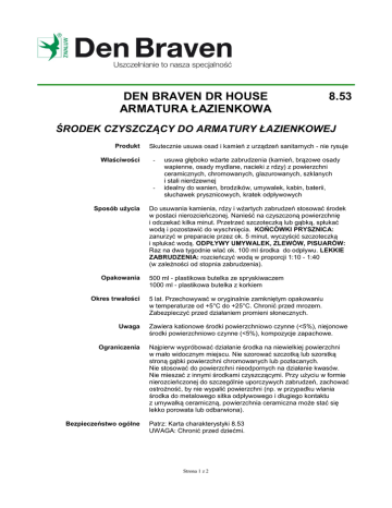 DEN BRAVEN DR HOUSE ARMATURA ŁAZIENKOWA 8.53 ŚRODEK CZYSZCZĄCY DO ARMATURY ŁAZIENKOWEJ Produkt Właściwości Skutecznie usuwa osad i kamień z urządzeń sanitarnych - nie rysuje - Sposób użycia Opakowania Okres trwałości usuwa głęboko wżarte zabrudzenia (kamień, brązowe osady wapienne, osady mydlane, nacieki z rdzy) z powierzchni ceramicznych, chromowanych, glazurowanych, szklanych i stali nierdzewnej idealny do wanien, brodzików, umywalek, kabin, baterii, słuchawek prysznicowych, kratek odpływowych Do usuwania kamienia, rdzy i wżartych zabrudzeń stosować środek w postaci nierozcieńczonej. Nanieść na czyszczoną powierzchnię i odczekać kilka minut. Przetrzeć szczoteczką lub gąbką, spłukać wodą i pozostawić do wyschnięcia. KOŃCÓWKI PRYSZNICA: zanurzyć w preparacie przez ok. 5 minut, wyczyścić szczoteczką i spłukać wodą. ODPŁYWY UMYWALEK, ZLEWÓW, PISUARÓW: Raz na dwa tygodnie wlać ok. 100 ml środka do odpływu. LEKKIE ZABRUDZENIA: rozcieńczyć wodą w proporcji 1:10 - 1:40 (w zależności od stopnia zabrudzenia). 500 ml - plastikowa butelka ze spryskiwaczem 1000 ml - plastikowa butelka z korkiem 5 lat. Przechowywać w oryginalnie zamkniętym opakowaniu w temperaturze od +5°C do +25°C. Chronić przed mrozem. Zabezpieczyć przed działaniem promieni słonecznych. Uwaga Zawiera kationowe środki powierzchniowo czynne (<5%), niejonowe środki powierzchniowo czynne (<5%), kompozycje zapachowe. Ograniczenia Najpierw wypróbować działanie środka na niewielkiej powierzchni w mało widocznym miejscu. Nie szorować szczotką lub szorstką stroną gąbki powierzchni chromowanych lub pozłacanych. Nie stosować do powierzchni nieodpornych na działanie kwasów. Nie mieszać z innymi środkami czyszczącymi. Przy użyciu w formie nierozcieńczonej do szczególnie uporczywych zabrudzeń, zachować ostrożność, by nie wypalić powierzchni (np. w przypadku wlania środka do metalowego sitka odpływowego i długiego kontaktu z umywalką ceramiczną, powierzchnia ceramiczna może stać się lekko porowata lub odbarwiona). Bezpieczeństwo ogólne Patrz: Karta charakterystyki 8.53 UWAGA: Chronić przed dziećmi. Strona 1 z 2 DEN BRAVEN DR HOUSE ARMATURA ŁAZIENKOWA, 8.53 Odpowiedzialność: Podane informacje są wynikiem badań i doświadczeń Den Braven Sealants, co jest podstawą ich rzetelności i wiarygodności. Producent nie mógł przewidzieć jednak wszystkich możliwości zastosowania swoich produktów, a ponieważ sposób użycia produktów jest całkowicie poza jego kontrolą, użytkownik bierze na siebie odpowiedzialność za właściwy wybór i zastosowanie produktu. Producent nie bierze na siebie odpowiedzialności za występujące uszkodzenia lub zły stan podłoża, które mogą być wynikiem czynników atmosferycznych, przygotowania wstępnego lub wad konstrukcyjnych. 12/03/2012 Strona 2 z 2