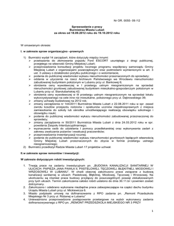 Nr OR. 0055- 09 /12 Sprawozdanie z pracy Burmistrza Miasta Lubań za okres od 18.09.2012 roku do 19.10.2012 roku W omawianym okresie: I. w zakresie spraw organizacyjno –prawnych 1) Burmistrz wydał 14 zarządzeń, które dotyczyły między innymi: przekazania do złomowania pojazdu Ford ESCORT usuniętego z drogi publicznej, przejętego na własność Gminy Miejskiej Lubań; przeprowadzenia konsultacji projektu rocznego programu współpracy samorządu Gminy Miejskiej Lubań z organizacjami pozarządowymi oraz podmiotami wymienionymi w art. 3 ust. 3 ustawy o działalności pożytku publicznego i o wolontariacie, podania do publicznej wiadomości wykazu nieruchomości przeznaczonych do sprzedaży; oddania w użyczenie na rzecz Archiwum Państwowego we Wrocławiu nieruchomości zabudowanej budynkiem położonym w Lubaniu przy ul. Bankowej 6; obniżenia ceny wywoławczej w I przetargu ustnym nieograniczonym na sprzedaż nieruchomości gruntowej zabudowanej budynkiem mieszkalno-gospodarczym położonym w Lubaniu przy ul. Starolubańskiej 42; obniżenia ceny wywoławczej w III przetargu ustnym nieograniczonym na sprzedaż lokalu wykorzystywanego na cele inne niż mieszkalne, położonego przy ul. Dąbrowskiego 39; zmiany uchwały budżetowej na 2012 rok; zmiany zarządzenia nr 144/2011 Burmistrza Miasta Lubań z 22.08.2011 roku w spr. zasad zwrotu kosztów przejazdu rodziców i opiekunów uczniów niepełnosprawnych z miejsca zamieszkania do szkoły lub ośrodka umożliwiającego realizację obowiązku szkolnego i obowiązku nauki; podania do publicznej wiadomości wykazu nieruchomości zabudowanej przeznaczonej do sprzedaży; zmiany zarządzenia nr 50/2011 Burmistrza Miasta Lubań z dnia 24.03.2012 roku w spr. powołania Zespołu Interdyscyplinarnego; wyznaczenia osób do udzielania I pomocy przedlekarskiej oraz wykonywania zadań z zakresu zwalczania pożarów i ewakuacji pracowników; przeprowadzenia inwentaryzacji rocznej; podania do publicznej wiadomości wykazu nieruchomości gruntowych będących własnością Gminy Miejskiej Lubań przeznaczonych do zbycia w formie przetargu ustnego nieograniczonego; 2) Burmistrz przedłożył Radzie Miasta Lubań 17 projektów uchwał. II. w zakresie spraw remontów i inwestycji: W zakresie dotyczącym robót inwestycyjnych: 1. Trwają prace na zadaniu inwestycyjnym pn. „BUDOWA KANALIZACJI SANITARNEJ W ULICACH: PAPIEŻA JANA PAWŁA II, PASTELOWEJ, TĘCZOWEJ, BŁĘKITNEJ, MIODOWEJ I WRZOSOWEJ W LUBANIU”. W chwili obecnej zakończono prace związane z budową kanalizacji sanitarnej w ulicach: Pastelowej, Błękitnej, Miodowej, Tęczowej i Wrzosowej. Na ukończeniu są również prace budowy przyłączy do poszczególnych posesji zlokalizowanych przy tych ulicach. Termin zakończenia całości robót ustalono do dnia 30.11.br i powinien zostać dotrzymany. 2. Zakończono i odebrano wykonane niezbędne praca zabezpieczające na części dachu budynku Urzędu Miasta Lubań przy ul. Mickiewicza 6. 3. Miasto podpisało umowę na dofinansowanie z RPO zadania pn. „Remont Przedszkola Miejskiego Nr 3 przy ul. Różanej w Lubaniu” 4. Unieważniono przeprowadzone postępowanie przetargowe na wybór wykonawcy zadania dofinansowywanego z RPO pn. „REMONT PRZEDSZKOLA MIEJSKIEGO NR 3 PRZY 1 UL. RÓŻANEJ W LUBANIU”, gdyż oferowana cena za wykonanie robót każdej z 5 złożonych ofert przekraczała kwotę jaką zamawiający przeznaczył na realizację robót. Planuje się ponowne przeprowadzenie postępowania przetargowego, a termin otwarcia ofert drugiego przetargu ustalono na dzień 06 listopada br. Prace remontowe prowadzone będą w latach 2012 – 2013 z terminem ich zakończenia do 05.07. 2013 roku. 5. Kontynuowane są roboty drogowe związane z „Przebudową części dróg gminnych ulicy Spacerowej i ulicy Polnej w Lubaniu”. Zaawansowanie prac wynosi ok. 80 %.Termin zakończenia całości prac ustalony został do dnia 31.10.br. i powinien zostać dotrzymany. Roboty związane z utrzymaniem i zapewnieniem bezpieczeństwa ruchu na drogach gminnych i wewnętrznych – ulicach administrowanych przez Burmistrza Miasta Lubań: 1. Zagrożenia dla ruchu drogowego spowodowane uszkodzeniami (zapadliskami) w nawierzchniach jezdni, z uwagi na ograniczoną możliwość wydatków przyznanych w budżecie miasta na ten cel środków, są do chwili obecnej jedynie zabezpieczane stosownymi urządzeniami zabezpieczającymi przez pracowników Wydziału IGK. 2. W związku z przyznaniem z rezerwy kryzysowej środków przeprowadzono uproszczone postępowanie na wybór wykonawcy naprawy muru oporowego przy ul. Łużyckiej. Remont ma być wykonany do 31.10. br a jego koszt wyniesie 22.100,00 złotych. Zadania związane z utrzymaniem kanalizacji deszczowej i elementów odwodnienia w drogach gminnych i wewnętrznych: 1. Przeprowadzono 2 postępowania związane z technicznymi warunkami przyłączenia obiektu do miejskiej sieci kanalizacji deszczowej. 2. Dokonano odbioru 2 przyłączy do miejskiej sieci kanalizacji deszczowej. 3. Zabezpieczono miejsce w zapadlisku jezdni ul. Granicznej spowodowane prawdopodobnie awarią kanalizacji deszczowej oraz miejsca skradzionych wpustów żeliwnych studzienek ściekowych. Z uwagi na brak środków w budżecie miasta nie podjęto prac naprawczych tych elementów dróg. Zadania związane z oświetleniem drogowym: 1. Występujące na terenie miasta awarie i wymiana spalonych źródeł światła usuwane są na bieżąco przez konserwatora oświetlenia drogowego w ramach zawartej umowy. 2. W związku z licznymi prośbami użytkowników kompleksu garażowego obejmującego ok. 200 garaży, a zlokalizowanego na terenie Osiedla Piast II w Lubaniu (kompleks w okolicy kotłowni PEC) rozpoczęto procedurę pozwalającą na doświetlenie tego terenu. Wystąpiono do Tauron S.A. Rejon w Lubaniu o wydanie technicznych warunków podłączenia do sieci energetycznej. Dalszym etapem będzie wykonanie projektu budowlanego doświetlenia terenu. Realizacj