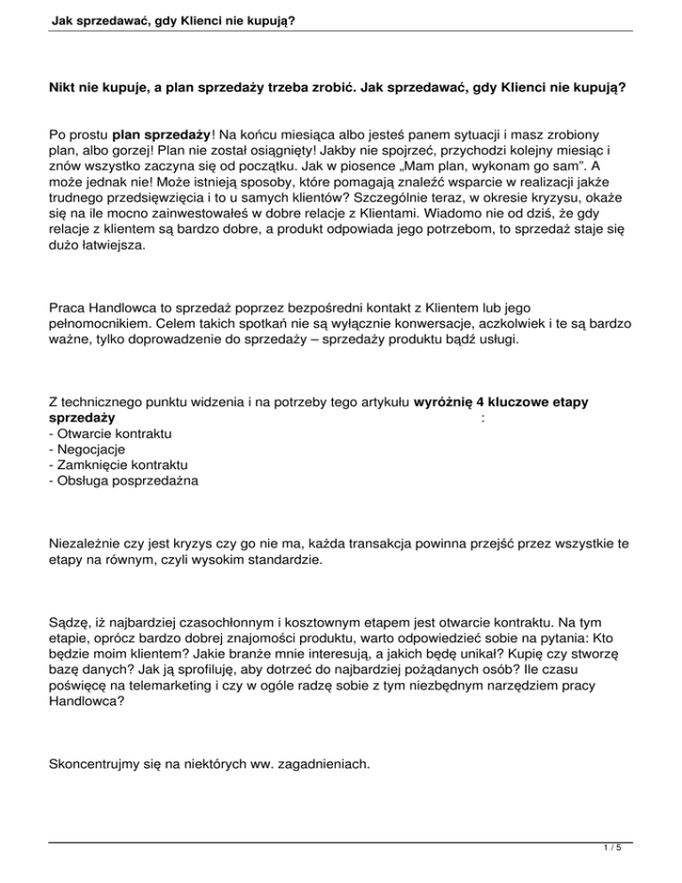 Jak sprzedawać, gdy Klienci nie kupują? Nikt nie kupuje, a plan sprzedaży trzeba zrobić. Jak sprzedawać, gdy Klienci nie kupują? Po prostu plan sprzedaży! Na końcu miesiąca albo jesteś panem sytuacji i masz zrobiony plan, albo gorzej! Plan nie został osiągnięty! Jakby nie spojrzeć, przychodzi kolejny miesiąc i znów wszystko zaczyna się od początku. Jak w piosence „Mam plan, wykonam go sam”. A może jednak nie! Może istnieją sposoby, które pomagają znaleźć wsparcie w realizacji jakże trudnego przedsięwzięcia i to u samych klientów? Szczególnie teraz, w okresie kryzysu, okaże się na ile mocno zainwestowałeś w dobre relacje z Klientami. Wiadomo nie od dziś, że gdy relacje z klientem są bardzo dobre, a produkt odpowiada jego potrzebom, to sprzedaż staje się dużo łatwiejsza. Praca Handlowca to sprzedaż poprzez bezpośredni kontakt z Klientem lub jego pełnomocnikiem. Celem takich spotkań nie są wyłącznie konwersacje, aczkolwiek i te są bardzo ważne, tylko doprowadzenie do sprzedaży – sprzedaży produktu bądź usługi. Z technicznego punktu widzenia i na potrzeby tego artykułu wyróżnię 4 kluczowe etapy sprzedaży : - Otwarcie kontraktu - Negocjacje - Zamknięcie kontraktu - Obsługa posprzedażna Niezależnie czy jest kryzys czy go nie ma, każda transakcja powinna przejść przez wszystkie te etapy na równym, czyli wysokim standardzie. Sądzę, iż najbardziej czasochłonnym i kosztownym etapem jest otwarcie kontraktu. Na tym etapie, oprócz bardzo dobrej znajomości produktu, warto odpowiedzieć sobie na pytania: Kto będzie moim klientem? Jakie branże mnie interesują, a jakich będę unikał? Kupię czy stworzę bazę danych? Jak ją sprofiluję, aby dotrzeć do najbardziej pożądanych osób? Ile czasu poświęcę na telemarketing i czy w ogóle radzę sobie z tym niezbędnym narzędziem pracy Handlowca? Skoncentrujmy się na niektórych ww. zagadnieniach. 1/5 Jak sprzedawać, gdy Klienci nie kupują? 1. Zwiększaj intensywność telemarketingu W przypadku relacji B2B uważam, iż bezcenną wartością jest telemarketing robiony bezpośrednio przez handlowca. Jeśli tylko pokonamy w sobie strach przed odmową, to dobrze wykonany telemarketing stanie się naszym największym przyjacielem. Jest trudny, nielubiany, ale dobrze wykonany jest szalenie skuteczny. Już na tym etapie należy skoncentrować się na umówieniu spotkania z osobą decyzyjną, bądź współdecyzyjną. Mnożenie spotkań z sekretarkami jest po prostu marnotrawieniem czasu. Często jest jednak też tak, że sekretarka może być „preludium” do kolejnego, owocnego spotkania już z osobą decyzyjną. Inaczej sprawa wygląda, gdy dany Klient sam zwrócił się do nas z zapytaniem o ofertę. Należy pamiętać, że w odróżnieniu od telemarketingu, możemy mieć do czynienia ze stosunkowo doświadczonym negocjatorem, który mógł się już wcześniej zwrócić z zapytaniem do innych firm. Sytuacja nie jest wobec tego ani łatwiejsza, ale też nie trudniejsza. Każdy sposób nawiązania kontaktu ma po prostu inną specyfikę. Celowo pomijam mailing i inne techniki aktywizacji sprzedaży, gdyż w rozumieniu artykułu nie wchodzi to w kompetencje handlowca. 2. Odejdź od akwizycji – bądź Konsultantem Klienta Pamiętajmy o podstawowych elementach pierwszego spotkania. Przygotuj się! Poznaj Klienta, odwiedź jego stronę, pamiętaj o tym, że pierwsze chwile decydują o tym, jak będziesz odbierany. Strój Handlowca powinien być oficjalny, gdyż dzięki niemu masz szansę pokazać Klientowi, że ma do czynienia nie np. z akwizytorem (z całym szacunkiem dla tego zawodu), ale z Konsultantem. Należy pamiętać, aby mieć notatnik pod ręką. 2/5 Jak sprzedawać, gdy Klienci nie kupują? 3. Dokładnie badaj potrzeby Klienta Na umówionym spotkaniu, w przypadku, gdy mamy kontakt z osobą decyzyjną, zaczynamy od krótkiego tzw. otwieracza. Inaczej - następuje zwykłe przełamanie lodów (kilku minutowa rozmowa na temat np. aktualnej sytuacji w kraju, ostatniego meczu naszej drużyny, itp). Następnie przechodzimy do części oficjalnej badania potrzeb klienta. Zaczynamy od pytań otwartych, powoli przechodząc do pytań zamkniętych. Tworzymy tak zwany „lejek sprzedażowy”. Innymi słowy - od szczegółu do ogółu. To ciężki proces i wymaga ciągłego skupienia. Może się okazać, że już na tym etapie na dzień dzisiejszy nic nie mamy Klientowi do zaoferowania. Warto w takiej sytuacji pozostawić po sobie pozytywne wrażenie. 4. Bądź partnerem – nie manipuluj Odradzam stosowanie metod NLP i innych technik manipulacji oraz wywierania presji. Klient prędzej czy później zorientuje się, że został zmanipulowany i poczuje się przez Ciebie oszukany. 5. Jeśli możesz, zaprezentuj ofertę osobiście. Najlepiej byłoby, gdyby udało się Tobie umówić na kolejne spotkanie, na którym zaprezentujesz ofertę. Często dzieje się tak, że Klienci proszą o przesłanie oferty mailem. Jest to całkowicie zrozumiałe w dobie społeczeństwa informatycznego. Zyskujesz jednak, gdy przedstawiasz ofertę osobiście. Po pierwsze: możesz bezpośrednio zobaczyć, jaka jest reakcja klienta na twoją propozycje. Po drugie: już na spotkaniu możesz doprecyzować szczegóły, rozwiać wątpliwości i odeprzeć zastrzeżenia. Negocjacja to sztuka sama w sobie i ze względu na rozmiary tego artykułu nie będę rozwijał tego tematu. W każdym bądź razie ten etap jest rajem dla osób, które mają pozytywne nastawienie, empatię, odwagę, precyzyjnie myślą, wykazują się cierpliwością i są obdarzone intuicją. 3/5 Jak sprzedawać, gdy Klienci nie kupują? 6. Dobrze przygotowana BATNA i FORECAST to solidny grunt w negacjach W wielkim skrócie i wybiórczo. Pamiętaj o rabatach. Bądź ostrożny w ich udzielaniu. Skonstruuj tak ofertę, abyś miał pole manewru. Lepiej dawać częściej mniejsze upusty, niż jeden, ale większy. Klient, który dostaje łatw