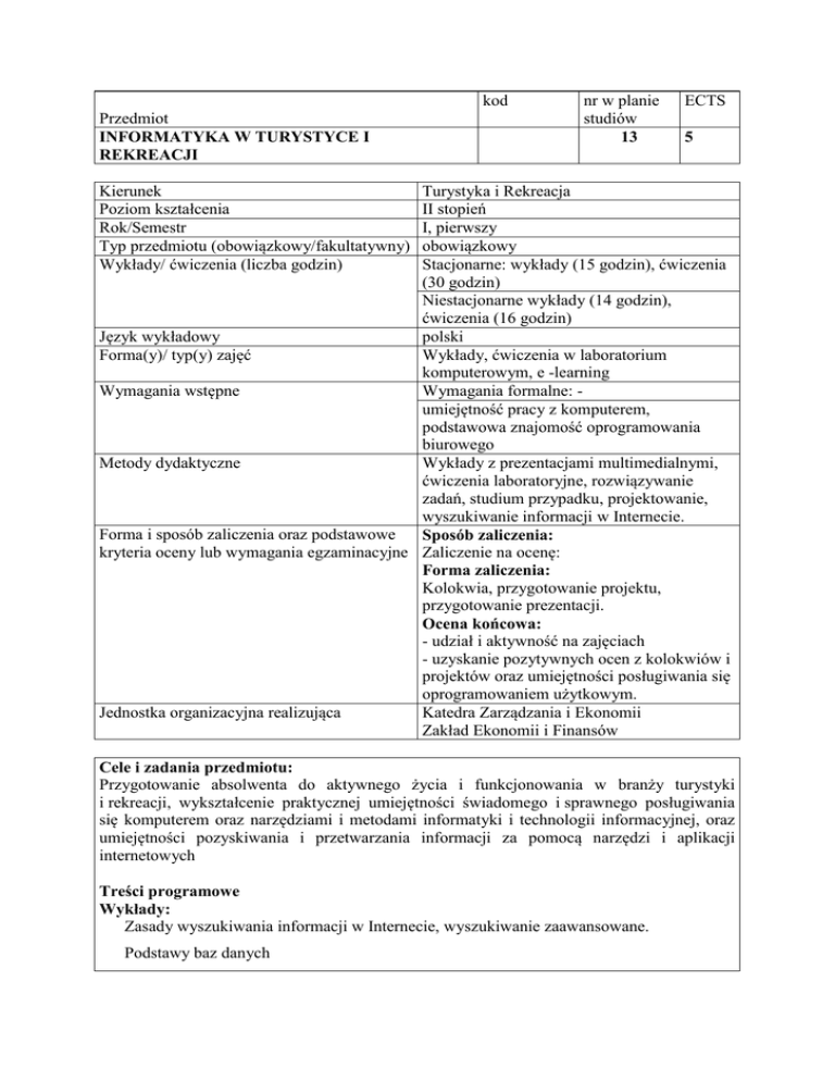 kod Przedmiot INFORMATYKA W TURYSTYCE I REKREACJI nr w planie studiów 13 ECTS 5 Kierunek Poziom kształcenia Rok/Semestr Typ przedmiotu (obowiązkowy/fakultatywny) Wykłady/ ćwiczenia (liczba godzin) Turystyka i Rekreacja II stopień I, pierwszy obowiązkowy Stacjonarne: wykłady (15 godzin), ćwiczenia (30 godzin) Niestacjonarne wykłady (14 godzin), ćwiczenia (16 godzin) Język wykładowy polski Forma(y)/ typ(y) zajęć Wykłady, ćwiczenia w laboratorium komputerowym, e -learning Wymagania wstępne Wymagania formalne: umiejętność pracy z komputerem, podstawowa znajomość oprogramowania biurowego Metody dydaktyczne Wykłady z prezentacjami multimedialnymi, ćwiczenia laboratoryjne, rozwiązywanie zadań, studium przypadku, projektowanie, wyszukiwanie informacji w Internecie. Forma i sposób zaliczenia oraz podstawowe Sposób zaliczenia: kryteria oceny lub wymagania egzaminacyjne Zaliczenie na ocenę: Forma zaliczenia: Kolokwia, przygotowanie projektu, przygotowanie prezentacji. Ocena końcowa: - udział i aktywność na zajęciach - uzyskanie pozytywnych ocen z kolokwiów i projektów oraz umiejętności posługiwania się oprogramowaniem użytkowym. Jednostka organizacyjna realizująca Katedra Zarządzania i Ekonomii Zakład Ekonomii i Finansów Cele i zadania przedmiotu: Przygotowanie absolwenta do aktywnego życia i funkcjonowania w branży turystyki i rekreacji, wykształcenie praktycznej umiejętności świadomego i sprawnego posługiwania się komputerem oraz narzędziami i metodami informatyki i technologii informacyjnej, oraz umiejętności pozyskiwania i przetwarzania informacji za pomocą narzędzi i aplikacji internetowych Treści programowe Wykłady: Zasady wyszukiwania informacji w Internecie, wyszukiwanie zaawansowane. Podstawy baz danych - Grafika cyfrowa. Podstawowe pojęcia, grafika wektorowa i rastrowa, oprogramowanie graficzne, przygotowanie obrazu do publikacji elektronicznej. Graficzne programy komercyjne i wolne - Wykorzystanie komputera w Turystyce. Oprogramowanie dostępne w sieci, Promocja turystyki w Internecie. - Internetowe biura podróży. Linie lotnicze. Hotele. Globalne systemy rezerwacyjne. - Systemy informacyjne i rezerwacyjne w turystyce. Internetowe źródła informacji turystycznej. Geolokalizatory i globusy wirtualne. - Źródła aktów prawnych dostępne w Internecie. - Serwisy pogodowe Ćwiczenia: Wykorzystywanie specjalistycznych funkcji arkusza kalkulacyjnego w turystyce i rekreacji. Projektowanie relacyjnej bazy danych, z wykorzystaniem formularzy, kwerend i raportów. Praca w chmurze, korzystanie z dysków wirtualnych i aplikacji sieciowych, opracowywanie wirtualnych ankiet. Pozyskiwanie, analizowanie, selekcja i wykorzystywanie informacji turystycznych z Internetu. Tworzenie projektów cyfrowej grafiki wektorowej i rastrowej. Praca w systemach rezerwacyjnych w hotelarstwie – studium przypadku. Umiejętność korzystania z internetowego biura podróży - studium przypadku. Rozliczenia punktów ECTS: Kalkulacja nakładu pracy studenta – 1 punkt ECTS – 25 -30h Studia stacjonarne Rodzaj aktywności Studia niestacjonarne Liczba Punkty Liczba Punkty godzin ECTS godzin ECTS Godziny kontaktowe wykłady 15 0,5 14 0,5 Godziny kontaktowe - ćwiczenia 30 1 16 0,5 Praca w czytelni 30 15 15 1 0,5 0,5 Praca w Internecie Praca z literaturą Przygotowanie prac semestralnych, projektów, raportów Przygotowanie do egzaminu/ zaliczenia 30 15 15 45 1,5 60 150 5 Razem 150 Liczba punktów ECTS realizowanych w ramach zajęć praktycznych: 2,5 75 godzin zajęć praktycznych – 2,5 ECTS Zajęcia e-learningowe (treści programowe): Internetowe źródła aktów prawnych Serwisy pogodowe Literatura podstawowa: Google. Kompletny przewodnik. PC World Extra, Warszawa 2013. Pawlicz A. E-Turystyka. Wyd. PWN, Warszawa 2012. 1 0,5 0,5 2 5 Podrecki P., Okoń Z. i in., Prawo Internetu, wydanie 2 ISBN: 83-7334-693-7 Warszawa 2007. Bedrychowski J. Informatyka w turystyce i rekreacji. Almamer, Warszawa 2006. Nalazek M., Moskała J. i in. Internet w turystyce i hotelarstwie, Informatyka w hotelarstwie, PZH, Warszawa 2003. Literatura uzupełniająca: Pawlicz A. E-turystyka Ekonomiczne problemy implementacji technologii cyfrowych w sektorze turystycznym, Wyd. PWN 2012. Chmielowski W. Systemy informacji i rezerwacji w turystyce. Ćwiczenia z przedmiotu, Akademia Frycza Modrzewskiego, Kraków 2008. Gajewski J., Janiak J., Kosmol A., Kostyra W., Polkowski T., Podstawy informatyki, część II, Wydawnictwa Akademii Wychowania Fizycznego, Warszawa 2002. witryny internetowe i portale poświęcone turystyce i rekreacji Efekty kształcenia: Student, który zaliczył przedmiot Zamierzone efekty kształcenia /EK/ Ma pogłębioną wiedzę na temat gospodarowania przestrzenią i zagospodarowania terenów cennych dla turystyki i rekreacji ze względu na wartości przyrodnicze, kulturowe lub funkcjonalne. Ma wiedzę na temat miejsca turystyki i rekreacji w systemie nauk oraz zna metody badań w turystyce i rekreacji. Potrafi dobrać lub stworzyć odpowiednie narzędzia, przeprowadzić badania empiryczne na próbie reprezentatywnej i dokonać ich statystycznego opisu. Posiada umiejętność pracy badawczej w zakresie turystyki i rekreacji i prezentacji jej wyników, zgodnie z przyjętymi zasadami Potrafi gromadzić niezbędne zasoby informacji rynkowych, Forma zajęć / metoda kształcenia Sposób weryfikacji EK Odniesienie do EK kierunkowych Odniesienie do EK obszaru wykład kolokwium K_W09 M2_W08 S2A_W05 wykład kolokwium K_W10 M2_W09 S2A_W01 S2A_W06 ćwiczenia projekt K_U13 M2_U06 S2A_U08 ćwiczenia projekt K_U14 M2_U08 S2A_U08 ćwiczenia projekt K_U10 K_U12 M2_U06 M2_K05 tworzyć odpowiednie bazy danych, analizować je i przewidywać koniunkturę na usługi turystyczne i rekreacyjne określonego rodzaju w różnych perspektywach czasowych. Potrafi posługiwać się specjalistycznymi programami wspomagającymi prowadzenie przedsiębiorstwa turystycznego, w tym centralnymi systemami 