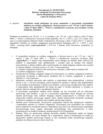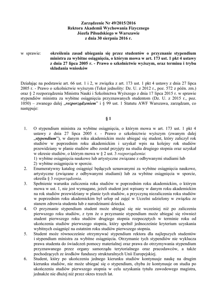 Zarządzenie Nr 49/2015/2016 Rektora Akademii Wychowania Fizycznego Józefa Piłsudskiego w Warszawie z dnia 30 sierpnia 2016 r. w sprawie: określenia zasad ubiegania się przez studentów o przyznanie stypendium ministra za wybitne osiągnięcia, o którym mowa w art. 173 ust. 1 pkt 4 ustawy z dnia 27 lipca 2005 r. - Prawo o szkolnictwie wyższym, oraz terminu i trybu składania wniosków Działając na podstawie art. 66 ust. 1 i 2, w związku z art. 173 ust. 1 pkt 4 ustawy z dnia 27 lipca 2005 r. - Prawo o szkolnictwie wyższym (Tekst jednolity: Dz. U. z 2012 r., poz. 572 z późn. zm.) oraz § 2 rozporządzenia Ministra Nauki i Szkolnictwa Wyższego z dnia 17 lipca 2015 r. w sprawie stypendiów ministra za wybitne osiągnięcia przyznawanych studentom (Dz. U. z 2015 r., poz. 1050) – zwanego dalej „rozporządzeniem” i § 99 ust. 1 Statutu AWF Warszawa, zarządzam, co następuje: §1 1. 2. 3. 4. 5. 6. O stypendium ministra za wybitne osiągnięcia, o którym mowa w art. 173 ust. 1 pkt 4 ustawy z dnia 27 lipca 2005 r. - Prawo o szkolnictwie wyższym (zwanym dalej „stypendium”), w danym roku akademickim może ubiegać się student, który zaliczył rok studiów w poprzednim roku akademickim i uzyskał wpis na kolejny rok studiów przewidziany w planie studiów albo został przyjęty na studia drugiego stopnia oraz uzyskał w okresie studiów, o którym mowa w § 2 ust. 3 rozporządzenia: 1) wybitne osiągnięcia naukowe lub artystyczne związane z odbywanymi studiami lub 2) wybitne osiągnięcia w sporcie. Enumeratywny katalog osiągnięć będących uznawanymi za wybitne osiągnięcia naukowe, artystyczne (związane z odbywanymi studiami) lub za wybitne osiągnięcia w sporcie, określa § 3 rozporządzenia. Spełnienie warunku zaliczenia roku studiów w poprzednim roku akademickim, o którym mowa w ust. 1, nie jest wymagane, jeżeli student jest wpisany w danym roku akademickim na rok studiów przewidziany w planie tych studiów, a przyczyną niezaliczenia roku studiów w poprzednim roku akademickim był urlop od zajęć w Uczelni udzielony w związku ze stanem zdrowia studenta lub z narodzinami dziecka. O przyznanie stypendium student może ubiegać się nie wcześniej niż po zaliczeniu pierwszego roku studiów, z tym że o przyznanie stypendium może ubiegać się również student pierwszego roku studiów drugiego stopnia rozpoczętych w terminie roku od ukończenia studiów pierwszego stopnia, który spełnił jednocześnie kryterium uzyskania wybitnych osiągnięć na ostatnim roku studiów pierwszego stopnia. Student może równocześnie otrzymywać stypendium rektora dla najlepszych studentów i stypendium ministra za wybitne osiągnięcia. Otrzymanie tych stypendiów nie wyklucza prawa studenta do świadczeń pomocy materialnej oraz prawa do otrzymywania stypendium przyznawanego przez organy samorządu terytorialnego oraz pracodawców, a także pochodzących ze środków funduszy strukturalnych Unii Europejskiej. Student, który po ukończeniu jednego kierunku studiów kontynuuje naukę na drugim kierunku studiów, nie może ubiegać się o stypendium, chyba że kontynuuje on studia po ukończeniu studiów pierwszego stopnia w celu uzyskania tytułu zawodowego magistra, jednakże nie dłużej niż przez okres trzech lat. 7. 8. Student, który ukończył już jeden kierunek studiów z tytułem zawodowym magistra lub równorzędnym oraz student, który po ukończeniu studiów pierwszego stopnia rozpoczął naukę na kolejnych studiach pierwszego stopnia, nie może ubiegać się o stypendium z tego tytułu. Student studiujący równocześnie na kilku kierunkach studiów może otrzymywać stypendium tylko na jednym, wskazanym przez siebie, kierunku studiów. §2 1. 2. 3. Przy ocenie wniosku o przyznanie stypendium będą brane pod uwagę osiągnięcia uzyskane w następujących okresach: 1) w przypadku studenta studiów pierwszego stopnia - osiągnięcia uzyskane od dnia rozpoczęcia tych studiów, do dnia 30 września roku, w którym student składa wniosek, 2) w przypadku studenta studiów drugiego stopnia - osiągnięcia uzyskane od dnia rozpoczęcia studiów pierwszego stopnia (poprzedzających odbywane właśnie studia drugiego stopnia), do dnia 30 września roku, w którym student składa wniosek, 3) w przypadku studenta, który otrzymał stypendium ministra w poprzednich latach osiągnięcia uzyskane od dnia 1 października roku, w którym otrzymał on ostatnie stypendium ministra, do dnia 30 września roku, w którym student składa wniosek. Wniosek powinien zawierać wyłącznie osiągnięcia związane z kierunkiem studiów, którego wniosek dotyczy, nie należy przedstawiać osiągnięć związanych z odbywanymi równocześnie studiami na innym kierunku albo realizacją innych zainteresowań lub hobby, jak również osiągnięć związanych z pracą zawodową. Przez datę uzyskania osiągnięcia rozumie się dzień, miesiąc i rok. §3 1. 2. 3. 4. 5. 6. Student przedstawia Rektorowi swoją kandydaturę do przyznania stypendium za pośrednictwem dziekana właściwego ze względu na odbywany kierunek studiów na wniosku o przyznanie studentowi stypendium ministra za wybitne osiągnięcia na rok akademicki stanowiącym załącznik nr 1 do niniejszego zarządzenia. Wniosek student składa zarówno w wersji papierowej, jak i elektronicznej (wersje te muszą być jednobrzmiące), najpóźniej do dnia 30 września danego roku. W wyjątkowych przypadkach Rektor może przedłużyć termin na złożenie lub uzupełnienie wniosku lub jego dokumentacji, o której mowa w ust. 2 i 3, jednak nie dłużej niż o 7 dni. Wniosek, o którym mowa w ust. 1 składa się z części formalnej (A) oraz części zawierającej wykaz wybitnych osiągnięć (B). Student do wniosku załącza dokumenty potwierdzające uzyskanie przez niego wybitnych osiągnięć, o których mowa w § 3 rozporządzenia. Rodzaje dokumentów potwierdzających uzyskanie przez studenta wybitnych osiągnięć okre