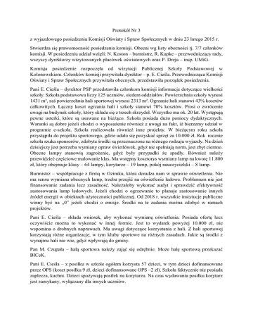 Protokół Nr 3 z wyjazdowego posiedzenia Komisji Oświaty i Spraw Społecznych w dniu 23 lutego 2015 r. Stwierdza się prawomocność posiedzenia komisji. Obecni wg listy obecności tj. 7/7 członków komisji. W posiedzeniu udział wzięli: N. Koston – burmistrz, R. Kupke – przewodniczący rady, wszyscy dyrektorzy wizytowanych placówek oświatowych oraz P. Dreja – insp. UMiG. Komisja posiedzenie rozpoczęła od wizytacji Publicznej Szkoły Podstawowej w Kolonowskiem. Członków komisji przywitała dyrektor – p. E. Cieśla. Przewodnicząca Komisji Oświaty i Spraw Społecznych przywitała obecnych, przedstawiła porządek posiedzenia. Pani E. Cieśla – dyrektor PSP przedstawiła członkom komisji informacje dotyczące wielkości szkoły. Szkoła podstawowa liczy 125 uczniów, siedem oddziałów. Powierzchnia szkoły wynosi 1431 m², zaś powierzchnia hali sportowej wynosi 2313 m². Ogrzanie hali stanowi 43% kosztów całkowitych. Łączny koszt ogrzania hali i szkoły stanowi 70% kosztów. Prosi o zwrócenie uwagi na budynek szkoły, który składa się z trzech skrzydeł. Wszystko ma ok. 20 lat. Występują pewne usterki, które są usuwane na bieżąco. Szkoła posiada dużo pomocy dydaktycznych. Warunki są dobre jeżeli chodzi o wyposażenie również z uwagi na fakt, iż bierzemy udział w programie e-szkoła. Szkoła realizowała również inne projekty. W bieżącym roku szkoła przystąpiła do projektu sportowego, gdzie udało się pozyskać sprzęt za 10.000 zł. Rok rocznie szkoła szuka sponsorów, zdobyte środki są przeznaczone na różnego rodzaju wyjazdy. Na dzień dzisiejszy jest potrzeba wymiany opraw świetlówek, gdyż nie spełniają norm, jest zbyt ciemno. Obecne lampy stanowią zagrożenie, gdyż były przypadki że spadły. Również należy przewidzieć częściowe malowanie klas. Ma wstępny kosztorys wymiany lamp na kwotę 11.800 zł, który obejmuje klasy – 64 lampy, korytarze – 19 lamp, pokój nauczycielski – 8 lamp. Burmistrz – współpracuje z firmą w Ozimku, która doradza nam w sprawie oświetlenia. Nie ma sensu wymiana obecnych lamp, trzeba przejść na oświetlenie ledowe. Problemem nie jest finansowanie zadania lecz zasadność. Należałoby wykonać audyt i sprawdzić efektywność zastosowania lamp ledowych. Jeżeli chodzi o ogrzewanie to planuje zastosowanie innych źródeł energii w obiektach użyteczności publicznej. Od 2018 r. wszystkie instytucje publiczne winny być na „0” jeżeli chodzi o emisje. Środki na te zadania można zdobyć w ramach projektów. Pani E. Cieśla – składa wniosek, aby wykonać wymianę oświetlenia. Posiada ofertę lecz oczywiście można to wykonać w innej formie. Jest to wydatek powyżej 10.000 zł, nie wspomina o drobnych naprawach. Ma uwagi dotyczące korzystania z hali. Z hali sportowej korzystają różne organizacje, w tym kluby sportowe na różnych zasadach. Jakie są środki z wynajmu hali nie wie, gdyż wpływają do gminy. Pan M. Czupała – halą sportowa należy zająć się odrębnie. Może halę sportową przekazać BICeK. Pani E. Cieśla – z posiłku w szkole ogółem korzysta 57 dzieci, w tym dzieci dofinansowane przez OPS (koszt posiłku 9 zł, dzieci dofinansowane OPS –2 zł). Szkoła faktycznie nie posiada zaplecza, kuchni. Dzieci spożywają posiłek na korytarzu. Na czas wydawania posiłku korytarz jest zamykany, wyłączany dla innych uczniów. Na zakończenie posiedzenia w szkole podstawowej członkowie komisji dokonali przeglądu poszczególnych klas. Następnie komisja udała się do Publicznego Gimnazjum w Kolonowskiem. Pan R. Pocześniok, dyrektor Publicznego Gimnazjum – przywitał obecnych. Odpowiadając na pytanie jakie są potrzeby poinformował, że z pewnością czeka nas malowanie pewnych sal lekcyjnych, szczególnie tych gdzie jest nakaz SANEPID-u. W okresie letnim jest wyłączane ogrzewanie i brak jest ciepłej wody. Wnioskuje o zainstalowanie elektrycznego podgrzewacza do wody, aby w okresie letnim można było sprzątać. Proponuje wymianę (dalszą) okien drewnianych, które niestety są nieszczelne. Należy się zastanowić nad wymianą kratek pod oknami, których nie można domknąć, wieje zimno. Może są nowe lepsze technologiczne rozwiązania jeżeli chodzi o kratki wentylacyjne. Od początku jest problem zapachu z kanalizacji, który należałoby rozwiązać. Kolejnym problemem są drzwi, których nie można domknąć. Na bieżąco są usuwane drobne usterki jak np. odklejanie się płytek. Komisja dokonała przeglądu poszczególnych klas. Członkowie jako kolejną placówkę oświaty wizytowali Publiczne Przedszkole w Kolonowskiem. Pani Maria Lejkowska, dyrektor przedszkola – zapoznała członków komisji ze stanem technicznym, wyglądem poszczególnych pomieszczeń. Jako najpilniejsze zadanie do wykonania wskazała malowanie pomieszczeń a w szczególności malowanie kuchni. Członkowie komisji nie mieli żadnych pytań, uwag jeżeli chodzi o obiekt przedszkola. Pozytywnie oceniono wyposażenie kuchni. Następnie komisja udała się do Publicznej Szkoły Podstawowej w Fosowskiem. Pani D. Robak – Detko, dyrektor Publicznej Szkoły Podstawowej – oprowadziła członków komisji i zapoznała ze stanem technicznym, wyglądem poszczególnych klas. Jako potrzeby wskazała konieczność zakupu komputerów, chociażby jednej tablicy interaktywnej. Jeżeli chodzi o inne potrzeby to należy wykonać pilnie remont toalet. Jeżeli chodzi o posiłki dla dzieci to jakość nie jest najlepsza, są dostarczane w ramach kateringu. Burmistrz – są środki na cele informatyczne. Będziemy chcieli uzupełnić brak komputerów w szkołach w ramach projektów. Szkoła posiada ogrzewanie olejowe. Jeżeli chodzi o posiłki to sprawa się zmieni. Stowarzyszenie Siedlisko jest zainteresowane przygotowywaniem posiłków dla naszych jednostek. Pani I. Kałuża, dyrektor Publicznego Przedszkola w Staniszczach Wielkich – przywitała obecnych. Członkowie