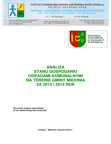 Zamawiający: Gmina Miękinia ul. Kościuszki 41 55-330 Miękinia ANALIZA STANU GOSPODARKI ODPADAMI KOMUNALNYMI NA TERENIE GMINY MIĘKINIA ZA 2013 i 2014 ROK Kierownik zespołu autorskiego: dr inż. Beata Klojzy-Karczmarczyk Kraków – Miękinia, kwiecień 2015 r. Analiza stanu gospodarki odpadami komunalnymi na terenie gminy Miękinia za 2013 i 2014 rok Zlecający: Gmina Miękinia ul. Kościuszki 41 55-330 Miękinia ANALIZA STANU GOSPODARKI ODPADAMI KOMUNALNYMI NA TERENIE GMINY MIĘKINIA ZA 2013 i 2014 ROK Wykonawca: Instytut Gospodarki Surowcami Mineralnymi i Energią Polskiej Akademii Nauk ul. Wybickiego 7 31-261 Kraków Pracownia Badań Środowiskowych i Gospodarki Odpadami tel. (012) 633 58 69 e-mail: [email protected] Zespół autorski: dr inż. Beata Klojzy-Karczmarczyk dr inż. Said Makoudi mgr inż. Janusz Mazurek mgr inż. Jarosław Staszczak tech. Jan Żółtek Kraków – Miękinia, kwiecień 2015 rok Instytut Gospodarki Surowcami Mineralnymi i Energią Polskiej Akademii Nauk ul. Wybickiego 7, 31-261 Kraków 2 Analiza stanu gospodarki odpadami komunalnymi na terenie gminy Miękinia za 2013 i 2014 rok Spis treści 1. 2. 3. Wprowadzenie …………………………………………………………………………………… 4 1.1. Cel i podstawowe założenia opracowania ………………………………………………… 4 1.2. Uwarunkowania formalno – prawne ……………………………………………………… 6 Możliwości przetwarzania zmieszanych odpadów komunalnych, odpadów zielonych oraz pozostałości z sortowania odpadów komunalnych przeznaczonych do składowania w latach 2013 i 2014 ……………………………………………………………………………… 22 2.1. Zmieszane odpady komunalne ……………………………………………………………. 24 2.2. Odpady zielone ……………………………………………………………………………. 30 2.3. Pozostałość z sortowania odpadów komunalnych przeznaczonych do składowania …….. 31 2.4. Odpady ulegające biodegradacji zebrane selektywnie, nieprzekazane do składowania ….. 32 2.5. Pozostałe odpady selektywnie zebrane ……………………………………………………. 33 2.6. Osiągnięte poziomy recyklingu, przygotowania do ponownego użycia i odzysku innymi metodami oraz ograniczenie składowania ilości odpadów ulegających biodegradacji …… 36 Potrzeby inwestycyjne związane z gospodarowaniem odpadami komunalnymi …….……… 54 3.1. 4. Realizacja systemu selektywnego zbierania ………………………………………………. Selektywne zbieranie odpadów komunalnych „u źródła" - bezpośrednio na terenie 3.1.1. nieruchomości ……………………………………………………………………….……. 3.1.2. Gminny punkt selektywnego zbierania odpadów komunalnych SZOK ………….………. Koszty poniesione w związku z odbieraniem, odzyskiem, recyklingiem i unieszkodliwianiem odpadów komunalnych w latach 2013 i 2014 ……………….….……… 55 57 59 61 4.1 Szacowane koszty gospodarowania odpadami w okresie styczeń – czerwiec 2013 r. ……. 61 4.2. Koszty gospodarowania odpadami w okresie lipiec - grudzień 2013 roku i 2014 roku ..... 64 5. Liczba mieszkańców na 2013 rok i 2014 roku (wg danych GUS) …………………………….. 66 6. Liczba właścicieli nieruchomości, którzy nie zawarli umowy w latach 2013 i 2014r., o której mowa w art. 6 ust. 1 ustawy o utrzymaniu czystości i porządku w gminie, w imieniu których gmina powinna podjąć działania, o których mowa w art.6 ust.6-12 67 7. Ilości odpadów komunalnych wytwarzanych na terenie gminy Miękinia w 2013 i 2014 roku 68 8. Ilość zmieszanych odpadów komunalnych, odpadów zielonych oraz pozostałości z sortowania odpadów komunalnych przeznaczonych do składowania odbieranych z terenu gminy Miękinia w 2013 i 2014 roku ………………………………………………………… 73 9. Wnioski i rekomendacjami, w celu weryfikacji możliwości technicznych i organizacyjnych gminy w zakresie gospodarowania odpadami komunalnymi ……………………………….. 74 Materiały wykorzystane 77 Instytut Gospodarki Surowcami Mineralnymi i Energią Polskiej Akademii Nauk ul. Wybickiego 7, 31-261 Kraków 3 Analiza stanu gospodarki odpadami komunalnymi na terenie gminy Miękinia za 2013 i 2014 rok 1. WPROWADZENIE 1.1. Cel i podstawowe założenia opracowania Opracowanie „Analizy stanu gospodarki odpadami komunalnymi na terenie gminy Miękinia za 2013 i 2014 rok”, wykonane zostało zgodnie z umową zawartą w dniu 30 stycznia 2015 roku pomiędzy Gminą Miękinia, ul. Kościuszki 41, 55-330 Miękinia a Instytutem Gospodarki Surowcami Mineralnymi i Energią Polskiej Akademii Nauk w Krakowie. Zakres opracowania: 1. Uwarunkowania formalno – prawne systemu gospodarowania odpadami w gminie, 2. Możliwości przetwarzania zmieszanych odpadów komunalnych, odpadów zielonych oraz pozostałości z sortowania odpadów komunalnych przeznaczonych do składowania w 2013 i 2014 r., 3. Potrzeby inwestycyjne związane z gospodarowaniem odpadami komunalnymi, 4. Koszty poniesione w związku z odbieraniem, odzyskiem, recyklingiem i unieszkodliwianiem odpadów komunalnych w 2013 i 2014r., 5. Liczba mieszkańców w 2013 i 2014r. (wg danych GUS), 6. Liczba właścicieli nieruchomości, którzy nie zawarli umowy w 2013 i 2014 r., o której mowa w art. 6 ust. 1 ustawy o utrzymaniu czystości i porządku w gminie, w imieniu których gmina powinna podjąć działania, o których mowa w art.6 ust.6-12 ucpg, 7. Ilość odpadów komunalnych wytwarzanych na terenie gminy Miękinia w 2013 i 2014 r., 8. Ilość zmieszanych odpadów komunalnych, odpadów zielonych oraz pozostałości z sortowania odpadów komunalnych przeznaczonych do składowania odbieranych z terenu gminy Miękinia w 2013 i 2014 r., 9. Wnioski i rekomendacjami