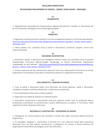 REGULAMIN WARSZTATÓW DELEGOWANIE PRACOWNIKÓW ZA GRANICĘ – ZMIANY, NOWE ZASADY I OBOWIĄZKI §1 ORGANIZATOR 1. Organizatorem warsztatów jest Stowarzyszenie Agencji Zatrudnienia z siedzibą: ul. Karczewska 18, 04-112 Warszawa, działającym przez Sekcję Agencję Opieki. §2 WARSZTATY 1. Organizator realizuje warsztat w zakresie i terminie szczegółowo opisanym w informacji pod adresem: http://sao.org.pl/news/251/warsztaty-delegowanie-pracownikow-za-granice---zmiany-nowe-zasady-iobowiazki..html 2. Oferta zawiera m.in. wysokość Cenę za udział w Warsztatach, przedmiot, program, termin oraz miejsce Warsztatu. §3 ZGŁOSZENIE UCZESTNICTWA 1. Warunkiem udziału w Warsztacie jest dostępność wolnych miejsc oraz przesłanie przez Uczestnika wypełnionego Formularza Zgłoszeniowego dostępnego na stronie internetowej Organizatora znajdującego się pod adresem http://sao.org.pl/news/251/warsztaty-delegowanie-pracownikow-zagranice---zmiany-nowe-zasady-i-obowiazki..html 2. Umowa zawierana jest bez jednoczesnej obecności stron przy wykorzystaniu formularza na stronie Organizatora oraz akceptacji warunków uczestnictwa zawartych w regulaminie Warsztatu. §4 CENA WARSZTATU I WARUNKI PŁATNOŚCI 1. Cena za udział w Warsztacie (dalej: Cena Warsztatu lub Cena) obejmuje: udział w Warsztacie, niezbędne narzędzia, materiały szkoleniowe, a także koszty poczęstunku. 2. Cena Warsztatów podana jest w złotych polskich. 3. Organizator nie zapewnia dojazdu ani zakwaterowania. 4. Warunkiem uczestnictwa w Warsztatach osób jest opłacenie całości Ceny na podstawie faktury przekazanej Uczestnikowi za pośrednictwem poczty elektronicznej na podany w Formularzu adres najpóźniej do dnia rozpoczęcia Warsztatu. §5 REZYGNACJA Z UCZESTNICTWA – ODSTĄPIENIE OD UMOWY 1. Odstąpienie od umowy powinno być przesłane w formie listu, faksu lub poczty elektronicznej do Organizatora. 2. W przypadku rezygnacji z uczestnictwa w terminie do 3 dni roboczych przed datą rozpoczęcia Warsztatu (liczy się data wpływu oświadczenia o odstąpieniu od umowy w formie pisemnej do Organizatora) Uczestnikowi przysługuje zwrot Ceny Warsztatu. 3. W przypadku otrzymania przez Organizatora oświadczenia o rezygnacji z udziału w Warsztacie w terminie krótszym niż 3 dni roboczych licząc od daty rozpoczęcia Warsztatu. Uczestnikowi przysługuje zwrot ceny w wysokości 30% wpłaconej kwoty. Uczestnik wyraża zgodę na to, że w przypadku rezygnacji z udziału w Warsztacie później niż na 3 dni robocze przed datą rozpoczęcia Warsztatu, lub nie wzięcia udziału w Warsztacie, Organizator zachowuje prawo do Ceny za Warsztaty. §6 ZMIANY 1. Organizator zastrzega sobie prawo do zmiany terminu, programu i prelegentów Warsztatu. 2. W przypadku odwołania Warsztatu przez Organizatora, według wyboru Uczestnika, Organizator zwróci wpłaconą Cenę w całości lub przeprowadzi Warsztaty w innym wskazanym przez siebie terminie. W przypadku zmiany terminu Warsztatu lub programu Uczestnik odstępując od umowy powinien wskazać numer rachunku bankowego na który nastąpi zwrot Ceny lub ewentualnie wskazać inny sposób jego zwrotu. 3. Organizator zastrzega sobie prawo do zmiany cen i programu, prelegentów Warsztatów, o czym poinformuje Uczestnika przynajmniej na 3 dni naprzód przed terminem Warsztatu. Uczestnik w takim wypadku może zrezygnować z Warsztatu uzyskując zwrot wpłaconej. 4. Uczestnik ma prawo zmieniać osoby delegowane na Warsztaty do chwili jego rozpoczęcia. §6 OCHRONA DANYCH OSOBOWYCH 1. Administratorem bazy danych osobowych przekazywanych przez Uczestników jest Organizator. 2. Zgodnie z Ustawą o ochronie danych osobowych z dnia 29 sierpnia 1997 roku (Dz. U. 133 z dnia 29 października 1997 roku poz. 833.) Organizator nie przekazuje, nie sprzedaje i nie użycza zgromadzonych danych osobowych użytkowników innym osobom lub instytucjom. Dane osobowe podane przez Zamawiającego (imię i nazwisko, adres, numer telefonu, adres e-mailowy) traktowane są jako informacje w najwyższym stopniu poufne i służą tylko i wyłącznie do celów komunikacji pomiędzy Uczestnikiem a Organizatorem. 3. W przypadku wyrażenia przez Uczestnika dodatkowej zgody dane osobowe będą przetwarzane przez Organizatora w celu informowania Uczestnika o podobnych wydarzeniach. 4. Uczestnik ma prawo wglądu do swoich danych osobowych, poprawiania ich oraz żądania usunięcia. 5. W sprawach nieuregulowanych w niniejszym Regulaminie mają zastosowanie przepisy prawa polskiego, a w szczególności Kodeksu Cywilnego, Ustawy o szczególnych warunkach sprzedaży konsumenckiej oraz zmianie Kodeksu cywilnego (Dz. U. Nr 141 z 2002 r., poz.1176, ze zm.). §7 OBOWIĄZYWANIE I ZMIANY REGULAMINU 1. Uczestnik o zmianie regulaminu informowany jest przez pocztę elektroniczną. Zmiany Regulaminu wchodzą w życie w terminie wskazanym przez Organizatora. Niniejszy Regulamin obowiązuje od dnia 22 kwietnia 2016r.