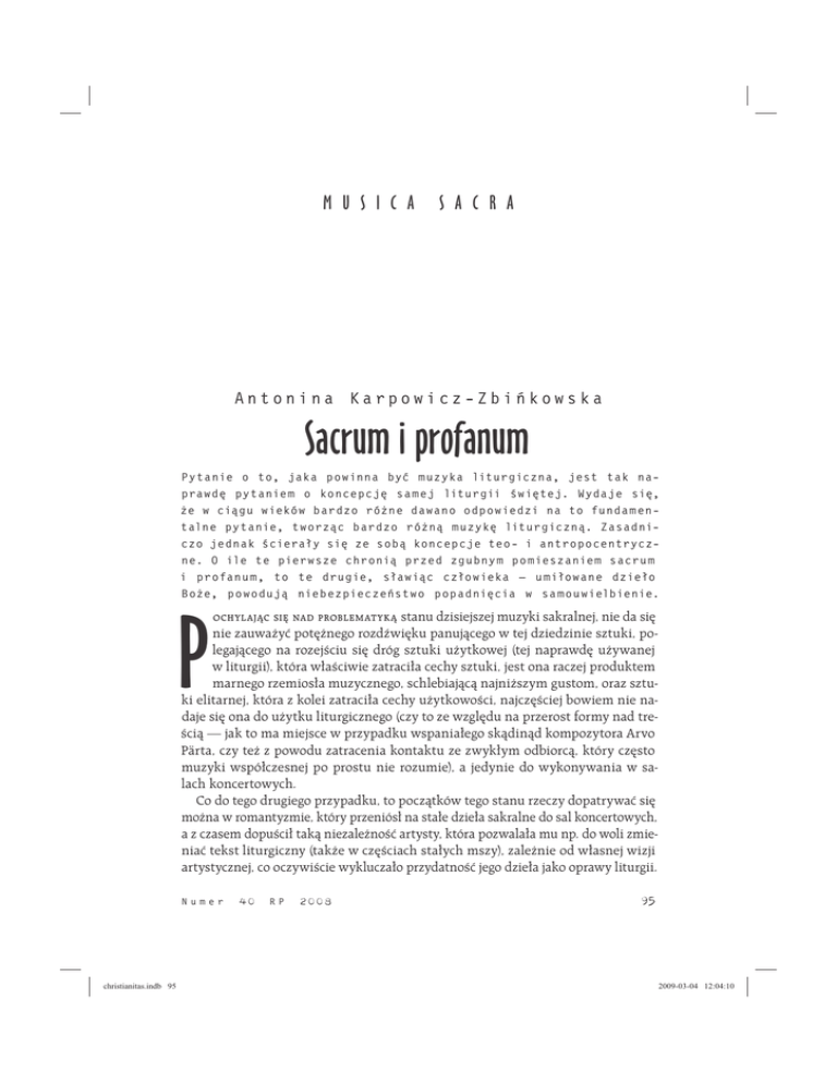 M U S I C A S A C R A Antonina Karpowicz-Zbi kowska Sacrum i profanum P y t a nie o! to, jaka p o w inna by" m u zyka litur gic zna, jest t ak napra w d# py t a nie m o ! ko n ce p c j# sa m e j litur gii $w i#te j. W yda je si#, %e w !ci& g u w iekó w b ar d zo r ó%n e da w a n o o d p o w ie d zi na to fu n da m e nt aln e py t a nie, t w or z&c b ar d zo r ó%n& m u zyk# litur gic zn&. Za sad nic zo je d nak $ciera'y si# ze so b& ko n ce p c je te o - i!a ntr o p o ce ntr yc zn e. O! ile te pier w sze chr o ni& pr ze d zg u b ny m p o m ie sza nie m sacr u m i ! pr ofa n u m, t o te dr u gie, s'a w i&c c z'o w ieka — u m i'o w a n e d zie'o B o%e, p o w o d u j& nie b e zpie c ze st w o p o p ad ni# cia w ! sa m o u w ielbie nie. stanu dzisiejszej muzyki sakralnej, nie da si nie zauwa!y" pot !nego rozd#wi ku panuj$cego w%tej dziedzinie sztuki, polegaj$cego na rozej&ciu si dróg sztuki u!ytkowej (tej naprawd u!ywanej w%liturgii), która w'a&ciwie zatraci'a cechy sztuki, jest ona raczej produktem marnego rzemios'a muzycznego, schlebiaj$c$ najni!szym gustom, oraz sztuki elitarnej, która z%kolei zatraci'a cechy u!ytkowo&ci, najcz &ciej bowiem nie nadaje si ona do u!ytku liturgicznego (czy to ze wzgl du na przerost formy nad tre&ci$ — jak to ma miejsce w%przypadku wspania'ego sk$din$d kompozytora Arvo Pärta, czy te! z%powodu zatracenia kontaktu ze zwyk'ym odbiorc$, który cz sto muzyki wspó'czesnej po prostu nie rozumie), a%jedynie do wykonywania w%salach koncertowych. Co do tego drugiego przypadku, to pocz$tków tego stanu rzeczy dopatrywa" si mo!na w%romantyzmie, który przeniós' na sta'e dzie'a sakralne do sal koncertowych, a%z%czasem dopu&ci' tak$ niezale!no&" artysty, która pozwala'a mu np. do woli zmienia" tekst liturgiczny (tak!e w%cz &ciach sta'ych mszy), zale!nie od w'asnej wizji artystycznej, co oczywi&cie wyklucza'o przydatno&" jego dzie'a jako oprawy liturgii. P OCHYLAJ C SI! NAD PROBLEMATYK Numer christianitas.indb 95 40 RP 2008 95 2009-03-04 12:04:10 A. K A R P O WIC Z-Z BI( KO W SK A . Sacrum i p r o fa nu m Dzisiejsz$ muzyk liturgiczn$ trapi, obok zagubienia sacrum, tak!e tragiczne obni!enie poziomu artystycznego. W%historii zachodniej muzyki liturgicznej to o%tyle szczególny przypadek, !e w%dawnych czasach nawet je&li tworzona wówczas muzyka by'a nie najwy!szych lotów, to sytuacj zawsze ratowa' chora' gregoria(ski, który by' nieodzownym elementem ka!dej liturgii. Dzisiaj, mimo oczywistej sprzeczno&ci z%zaleceniami Soboru Watyka(skiego II oraz nawo'ywania Benedykta% XVI do powrotu do melodii chora'owych, nadal chora' gregoria(ski mo!na us'ysze" tylko w%nielicznych ko&cio'ach. Nie mo!na jednak powiedzie", !e upadek muzyki liturgicznej jest udzia'em tylko naszych czasów, pomieszanie sacrum i%profanum by'o przypad'o&ci$ bardzo cz sto spotykan$ i%to równie! w%przypadku muzyki b d$cej prawdziwym arcydzie'em z%punktu widzenia artystycznego. Przygl$daj$c si historii zachodniej muzyki sakralnej, mo!na dopatrzy" si wielu okresów takiego wdarcia si &wieckich, miejscami nawet nieprzyzwoitych elementów rzemios'a kompozytorskiego, jak chocia!by okres Ars nova , kiedy to narodzi'a si sztuka komponowania motetów polegaj$ca m.in. na '$czeniu kilku g'osów, z%których ka!demu powierza si inny tekst, czasem ka!dy w%innym j zyku, z%których najwy!szy jest ca'kiem &wieckim erotykiem. Szczególnym przypadkiem muzyki liturgicznej jest ta, pochodz$ca z%epoki zwanej Ars subtilior . Zabytki pochodz$ce z%tego okresu wywodz$ si w%prostej linii z%dekadenckiej muzyki okresu niewoli awinio(skiej. Dwór papieski w%Awinionie skupia' wokó' siebie grono artystów i%erudytów, w&ród których panowa'a szczególna atmosfera, podsycana modnym wówczas na'ogiem palenia opium. Tworzono zatem muzyk niezwyk'$, oniryczn$, lekko zblazowan$. Najs'ynniejszym przedstawicielem tego pr$du by' Solage, który do historii przeszed' dzi ki swojemu s'ynnemu utworowi po&wi conemu w'a&nie paleniu opium — Fumeux fume par fumee. Ars subtilior to sztuka przeestetyzowana, prawdziwy owoc epoki jesieni &redniowiecza. Okres jej powstawania przypada na koniec XIV wieku, a%wi c czas Wielkiej Schizmy Zachodniej, czyli g' bokiego kryzysu zarówno politycznego, jak i%duchowego Ko&cio'a katolickiego. Mo!na zatem powiedzie", !e jest ona zapisem stanu ducha ówczesnych elit, które zaj te by'y, obok zaanga!owania w%konßikty religijno-polityczne, dyskusjami na temat sztuki, niezwykle zreszt$ wysublimowanej. Zw'aszcza muzyka przedstawia wyj$tkowo wysoki poziom trudno&ci. Wyszukana, niezwykle skomplikowana, zawieraj$ca takie elementy, jak mikrointerwa'y, politonalizm, skomplikowana rytmika, które dodatkowo czyni'y t muzyk kunsztown$, ale zarazem odrealnion$, niemal!e ba&niow$ w%odbiorze. Tak wysublimowana sztuka by'a skierowana g'ównie do tych, którzy mogli j$ w'a&ciwie doceni" i%zrozumie" prawid'a, którymi si rz$dzi'a. Nawet sam zapis nutowy by' dzie'em sztuki, popularne w%tym okresie by'o kolorowanie nut, oraz uk'adanie zapisu nutowego w%jaki& wzór, np. serduszko. Szczególne miejsce zajmuje za& muzyka sakralna tego okresu, która nie wykszta'ciwszy w'asnego j zyka, u!ywa wszystkich &wieckich &rodków wyrazu, co wi cej, 96 christianitas.indb 96 Christianitas 2009-03-04 12:04:10 Musica sacra kompozytorzy tego pr$du zupe'nie jawnie przekszta'cali &wieckie formy muzyczne na cz &ci mszalne. Praktyka ta nosi'a nazw travestimento spiritualis , przebranie duchowe. Kompozytor przerabia' istniej$ce (w'asne i%cudze) &wieckie utwory, takie jak caccie, madryga'y czy ballaty, dopisuj$c nowe g'osy, czy trawestuj$c &wieckie pie&ni, dostosowywa' melodi do tekstu liturgicznego. St$d niespotykany charakter tych utworów, które mimo przeznaczenia do u!ytku liturgicznego, zupe'nie nie nabiera'y sakralnego charakteru. S'uchaj$c ich dzisiaj, bez przeszkód mo!emy rozpozna" ich fantastyczny, bajkowy, a%nawet cz sto erotyczny charakter, znany nam ze &wieckich utworów tego okresu. Ta manierystyczna muzyka mo!e powiedzie" nam wiele o%stan