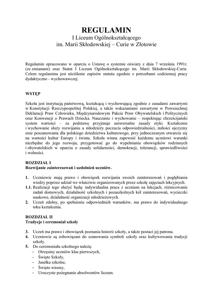 REGULAMIN I Liceum Ogólnokształcącego im. Marii Skłodowskiej – Curie w Złotowie Regulamin opracowano w oparciu o Ustawę o systemie oświaty z dnia 7 września 1991r. (ze zmianami) oraz Statut I Liceum Ogólnokształcącego im. Marii Skłodowskiej-Curie. Celem regulaminu jest uściślenie zapisów statutu zgodnie z potrzebami codziennej pracy dydaktyczno - wychowawczej. WSTĘP Szkoła jest instytucją państwową, kształcącą i wychowującą zgodnie z zasadami zawartymi w Konstytucji Rzeczypospolitej Polskiej, a także wskazaniami zawartymi w Powszechnej Deklaracji Praw Człowieka, Międzynarodowym Pakcie Praw Obywatelskich i Politycznych oraz Konwencji o Prawach Dziecka. Nauczanie i wychowanie – respektując chrześcijański system wartości – za podstawę przyjmuje uniwersalne zasady etyki. Kształcenie i wychowanie służy rozwijaniu u młodzieży poczucia odpowiedzialności, miłości ojczyzny oraz poszanowania dla polskiego dziedzictwa kulturowego, przy jednoczesnym otwarciu się na wartości kultur Europy i świata. Szkoła winna zapewnić każdemu uczniowi warunki niezbędne do jego rozwoju, przygotować go do wypełniania obowiązków rodzinnych i obywatelskich w oparciu o zasady solidarności, demokracji, tolerancji, sprawiedliwości i wolności. ROZDZIAŁ I Rozwijanie zainteresowań i uzdolnień uczniów. 1. Uczniowie mają prawo i obowiązek rozwijania swoich zainteresowań i pogłębiania wiedzy poprzez udział we właściwie organizowanych przez szkołę zajęciach lekcyjnych. 1.1. Realizacji tego służyć będą: indywidualna praca z uczniem na lekcjach, różnicowanie zadań domowych, działalność szkolnych i pozaszkolnych kół zainteresowań, wycieczki naukowe, działalność organizacji młodzieżowych. 2. Uczeń zdolny, po spełnieniu odpowiednich warunków, ma prawo do indywidualnego toku kształcenia. ROZDZIAŁ II Tradycje i ceremoniał szkoły 3. 4. Uczeń ma prawo i obowiązek poznania historii szkoły, a także postaci jej patrona. Uczniowie są zobowiązani do szanowania symboli szkoły oraz kultywowania tradycji szkoły. 5. Do ceremoniału szkolnego należą: Otrzęsiny uczniów klas pierwszych, Święto Szkoły, Jasełka szkolne, Święto wiosny, Uroczyste pożegnanie absolwentów liceum. 6. Do obowiązków ucznia należy podkreślenie uroczystym strojem następujących świąt państwowych i szkolnych: Rozpoczęcie roku szkolnego, Święto Szkoły i Rocznica Odzyskania Niepodległości (11 XI), Pożegnanie absolwentów szkoły, Zakończenie roku szkolnego. 7. Zaszczytnym wyróżnieniem wzorowego ucznia jest występowanie w poczcie sztandarowym Szkoły. ROZDZIAŁ III Stosunek uczniów do nauki 8. Uczeń jest zobowiązany do: rzetelnej i systematycznej nauki oraz aktywnego uczestnictwa w zajęciach lekcyjnych, terminowego wykonywania zadań domowych, jak najlepszego wykorzystywania czasu i warunków do nauki. 9. Uczeń ma prawo zdobywać wiedzę przy pomocy nauczyciela, poszerzać ją, ma prawo do twórczych poszukiwań intelektualnych. Może wyrażać wątpliwości, własne sądy oraz prowadzić dyskusję z treściami zawartymi w podręczniku i przekazywanymi przez nauczyciela. 10. Uczeń ma prawo w czasie lub po zakończeniu zajęć zwrócić się do nauczyciela z prośbą o wyjaśnienie trudnych problemów omawianych na lekcji lub występujących w zadaniach domowych. 11. Uczeń ma prawo do pomocy w nauce ze strony nauczyciela i kolegów. 12. Przygotowanie się do olimpiad przedmiotowych bezpośrednio przed eliminacjami daje uczniowi prawo do zwolnienia z odpowiedzi z innych przedmiotów i do dni wolnych od zajęć szkolnych: eliminacje wojewódzkie (okręgowe) – do 3 dni, eliminacje centralne – do tygodnia wolnego od zajęć szkolnych. 13. Uczniowie biorący udział w różnego typu zawodach i konkursach przedmiotowych mają prawo do zwolnienia z pytania na dzień przed zawodami i w dniu zawodów. 14. Do zwolnienia z pytania w danym dniu mają prawo uczniowie biorący udział w poprzednim dniu w pozaszkolnych rozgrywkach sportowych. Prawo to mają również członkowie zespołów artystycznych biorący udział w imprezach. 15. Uczniowie są zobowiązani do poinformowania i uzyskania potwierdzenia udziału w wymienionych w punktach 12, 13, 14 zawodach i imprezach przez nauczyciela prowadzącego i wychowawcę klasy. 16. W szkole obowiązują następujące normy dotyczące pisemnych zadań szkolnych: terminy prac są wpisywane do dziennika z tygodniowym wyprzedzeniem (nie więcej niż 3 w tygodniu), prace klasowe muszą być sprawdzone w terminie 2-tygodniowym, omówione na lekcji i dane uczniowi do wglądu, krótkie sprawdziany (kartkówki) sprawdzają wiedzę i przygotowanie ucznia z trzech ostatnich lekcji, winny być sprawdzone i ocenione w terminie jednotygodniowym i dane uczniowi do wglądu, 17.1. Oceny są jawne zarówno dla ucznia, jak i jego rodziców. Sprawdzone i ocenione pisemne prace kontrolne uczeń i jego rodzice otrzymują do wglądu na zasadach określonych przez nauczycieli. ___________________________________________________________________________________________________ Regulamin I Liceum Ogólnokształcącego im. Marii Skłodowskiej-Curie w Złotowie 2 ROZDZIAŁ IV Kultura bycia i dyscyplina 18.1. Uczeń ma prawo do poszanowania jego godności osobistej oraz kulturalnego traktowania przez wszystkich pracowników szkoły i kolegów. 18.2. Uczeń powinien troszczyć się o właściwe więzi i stosunki koleżeńskie. 19. Obowiązkiem ucznia jest dbałość o czystość mowy ojczystej. 20. Uczeń ma obowiązek okazywania szacunku wszystkim pracownikom Szkoły, a także godnego zachowania się poza Szkołą. 21.1. Uczeń ma obowiązek przeciwdziałać wszelkim przejawom nieodpowiedzialności, marnotrawstwa i niszczenia mienia majątku szkolnego, dbać o porządek, ład, estetykę pomieszczeń oraz zieleni w szkole i otoczeniu. 21.2. Uczeń lub zespół winny szkody jest materialnie odpowiedzialny za dokonane zniszczenia. 21.