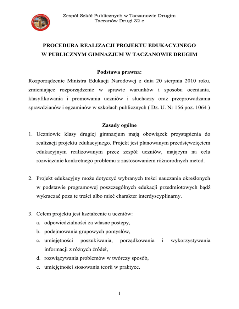 Zespół Szkół Publicznych w Taczanowie Drugim Taczanów Drugi 32 c PROCEDURA REALIZACJI PROJEKTU EDUKACYJNEGO W PUBLICZNYM GIMNAZJUM W TACZANOWIE DRUGIM Podstawa prawna: Rozporządzenie Ministra Edukacji Narodowej z dnia 20 sierpnia 2010 roku, zmieniające rozporządzenie w sprawie warunków i sposobu oceniania, klasyfikowania i promowania uczniów i słuchaczy oraz przeprowadzania sprawdzianów i egzaminów w szkołach publicznych ( Dz. U. Nr 156 poz. 1064 ) Zasady ogólne 1. Uczniowie klasy drugiej gimnazjum mają obowiązek przystąpienia do realizacji projektu edukacyjnego. Projekt jest planowanym przedsięwzięciem edukacyjnym realizowanym przez zespół uczniów, mającym na celu rozwiązanie konkretnego problemu z zastosowaniem różnorodnych metod. 2. Projekt edukacyjny może dotyczyć wybranych treści nauczania określonych w podstawie programowej poszczególnych edukacji przedmiotowych bądź wykraczać poza te treści albo mieć charakter interdyscyplinarny. 3. Celem projektu jest kształcenie u uczniów: a. odpowiedzialności za własne postępy, b. podejmowania grupowych pomysłów, c. umiejętności poszukiwania, porządkowania informacji z różnych źródeł, d. rozwiązywania problemów w twórczy sposób, e. umiejętności stosowania teorii w praktyce. 1 i wykorzystywania Zespół Szkół Publicznych w Taczanowie Drugim Taczanów Drugi 32 c 4. Projekt edukacyjny ma na celu: a. rozwój samoorganizacji i kreatywności, b. przygotowanie do publicznych wystąpień, c. naukę samodzielności i podejmowania aktywności. 5. Projekt edukacyjny jest realizowany przez zespół uczniów pod opieką zespołu nauczycieli i obejmuje następujące działania: a. wybranie tematu projektu edukacyjnego, b. określenie celów projektu edukacyjnego i zaplanowanie etapów jego realizacji, c. wykonanie zaplanowanych działań, d. publiczne przedstawienie rezultatów projektu edukacyjnego. 6. Dyrektor Szkoły, na pisemny umotywowany wniosek rodziców/prawnych opiekunów, w szczególnie uzasadnionych przypadkach losowych lub zdrowotnych, może zwolnić ucznia z realizacji projektu. 7. W przypadku zwolnienia, o którym mowa w pkt. 6, na świadectwie ukończenia gimnazjum w miejscu przeznaczonym na wpisanie oceny za wkład ucznia w realizację projektu edukacyjnego wpisuje się „zwolniony” albo „zwolniona”. 8. Uczeń może brać udział w realizacji więcej niż jednego projektu edukacyjnego. 9. W przypadku udziału w kilku projektach, uczeń lub jego rodzice wskazują w terminie do 30 maja ostatniego roku nauki w szkole projekt, który będzie wpisany na świadectwie ukończenia gimnazjum. 2 Zespół Szkół Publicznych w Taczanowie Drugim Taczanów Drugi 32 c 10. Nauczyciele w terminie do końca października każdego roku szkolnego zgłaszają do Dyrektora Zespołu, na piśmie, tematy projektów edukacyjnych. Zgłoszenie tematu projektu dokonywane jest na Karcie Projektu. (załącznik nr 1). 11. Uczeń/uczniowie mają prawo zgłoszenia własnego tematu projektu. 12. W terminie do 15 listopada zespoły przedmiotowe dokonują analizy zgłoszonych tematów pod kątem możliwości ich realizacji, wykonalności, zgodności z podstawą programową, innowacyjności, spodziewanych efektów dydaktyczno-wychowawczych oraz atrakcyjności. 13. W terminie do 30 listopada Dyrektor Szkoły ogłasza Szkolną Bazę Projektów Edukacyjnych, z którą zostają zapoznani uczniowie. 14. Uczniowie zainteresowani realizacją konkretnego projektu składają wychowawcy ustną deklarację udziału w jego realizacji i pospisują kontrakt z nauczycielami – opiekunami projektu. (załącznik nr 2). Ostateczny termin wyboru tematu projektu przypada na 5 grudnia. 15. Opiekun projektu w szczególności odpowiada za: a. wskazanie tematyki realizowanych projektów z uwzględnieniem zainteresowań uczniów, b. omówienie z uczniami zakresu tematycznego oraz celów projektu i koordynowanie podziału uczniów na poszczególne zespoły projektowe, c. opracowanie karty projektu i innych dokumentów o ile taka potrzeba zachodzi, 3 Zespół Szkół Publicznych w Taczanowie Drugim Taczanów Drugi 32 c d. prowadzenie konsultacji dla uczniów realizujących projekt, e. monitorowanie jego realizacji, f. ocenę projektu we współpracy z nauczycielami, którzy wspomagali jego realizację. 16. Nauczyciele poszczególnych przedmiotów w zakresie swoich kompetencji są zobowiązani do udzielania wsparcia w realizacji projektów zespołowi projektowemu, który za pośrednictwem opiekunów projektu zwróci się o pomoc. 17. Zadania wychowawcy klasy związane z realizacją projektu: a. poinformowanie na początku września, każdego roku, uczniów i ich rodziców/ prawnych opiekunów o warunkach realizacji projektu edukacyjnego, b. prowadzenie działań organizacyjnych, związanych z realizacją projektu przez wszystkich uczniów klasy, c. komunikowanie się z opiekunami projektów w sprawie oceniania zachowania ucznia, d. dokonywanie zapisów dotyczących realizacji przez ucznia projektu edukacyjnego w dokumentacji szkolnej (dziennik lekcyjny, arkusze ocen, świadectwa. 18. Uczniowie mogą realizować projekt w zespołach oddziałowych, międzyoddziałowych liczących od 3 do 10 osób. 19. Zespół uczniowski przy współpracy nauczycieli – opiekunów projektu opracowuje Kartę Pracy Zespołu (załącznik nr 3). 20. Uczniowie mają czas na wykonanie projektu do 10 maja każdego roku. 4 Zespół Szkół Publicznych w Taczanowie Drugim Taczanów Drugi 32 c 21. Prezentacje projektów odbywać się będą w tygodniu poprzedzającym święto Szkoły. 22. Kryteria oceny projektu edukacyjnego dotyczą: a. oceny efektu końcowego (wytworu), b. wkładu ucznia/uczniów w realizację projektu, c. oceny prezentacji. 23. Projekt jest oceniany w skali punktowej, a zdobyte punkty są przeliczane na ocenę cząstkową i wyrażane w postaci opisowej w Szkolnym Systemie Oceny Zachowania. Maksymalna liczba punktów jaką można zdobyć za projekt