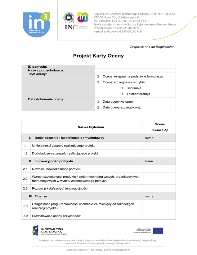 Załącznik nr 4 do Regulaminu Projekt Karty Oceny ID pomysłu: Nazwa pomysłodawcy: Tryb oceny: Data dokonania oceny: Ocena wstępna na podstawie formularza Ocena szczegółowa w trybie: Spotkanie Telekonferencja Data oceny wstępnej: Data oceny szczegółowej: Ocena Nazwa kryterium (skala 1-5) I. Doświadczenie i kwalifikacje pomysłodawcy 1.1 Umiejętności zespołu realizującego projekt 1.2 Doświadczenie zespołu realizującego projekt II. Innowacyjność pomysłu 2.1 Nowość i nowoczesność pomysłu 2.2 Wzrost użyteczności produktu / zmian technologicznych, organizacyjnych, marketingowych w wyniku zastosowanego pomysłu 2.3 Poziom (skala/zasięg) innowacyjności III. Finanse 3.1 Osiągalność progu rentowności w okresie 24 miesięcy od rozpoczęcia realizacji projektu 3.2 Prawidłowość oceny przychodów suma: suma: suma: 3.3 Prawidłowość oceny kosztów 3.4 Możliwość osiągnięcia założeń wstępnego biznesplanu i prognoz 3.5 Udział własnego wkładu pomysłodawcy w postaci aktywów (nieruchomość, środki trwałe), w wartości całości projektu 3.6 Udział własnego wkładu pieniężnego pomysłodawcy w wartości całości projektu IV. Marketing 4.1 Skala popytu na usługę 4.2 Możliwość dotarcia do grupy docelowej 4.3 Zagrożenia rynkowe 4.4 Strategia marketingowa 4.5 Bariery wejścia na rynek 4.6 Przewaga konkurencyjna suma: V. Założenia operacyjne suma: 5.1 Potencjał rynkowy pomysłu, prawdopodobieństwo sukcesu biznesowego 5.2 Ekonomiczna zasadność komercjalizacji inwestycji, atrakcyjność modelu biznesowego VI. Założenia strategiczne 6.1 suma: Możliwość wyjścia z inwestycji przez inwestora Suma punktów Maksymalna ilość punktów Ilość zdobytych punktów 2 100 pkt. pkt. Podpis osoby oceniającej Imię i nazwisko: Członek Komitetu Oceniającego: Koordynator projektu Specjalista ds. inwestycyjnych Specjalista ds. technicznych ....................................................................................................... czytelny podpis Data, miejscowość: 3