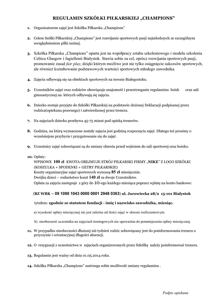 REGULAMIN SZKÓŁKI PIŁKARSKIEJ „CHAMPIONS” 1. Organizatorem zajęć jest Szkółka Piłkarska „Champions” 2. Celem Szółki Piłkarskiej „Champions” jest rozwijanie sportowych pasji najmłodszych ze szczególnym uwzględnieniem piłki nożnej. 3. Szkółka Piłkarska „Champions” oparta jest na współpracy sztabu szkoleniowego i modelu szkolenia Celticu Glasgow i Jagiellonii Białystok. Stawia sobie za cel, oprócz rozwijania sportowych pasji, promowanie zasad fair play, dzięki którym możliwe jest nie tylko osiągnięcie sukcesów sportowych, ale również kształtowanie podstawowych wartości sportowych młodego zawodnika. 4. Zajęcia odbywają się na obiektach sportowych na terenie Białegostoku. 5. Uczestników zajęć oraz rodziców obowiązuje znajomość i przestrzeganie regulaminu boisk gimnastycznej na których odbywają się zajęcia. oraz sali 6. Dziecko zostaje przyjęte do Szkółki Piłkarskiej na podstawie złożonej Deklaracji podpisanej przez rodzica(opiekuna prawnego) i zatwierdzonej przez trenera. 7. Na zajęciach dziecko przebywa 45-75 minut pod opieką trenerów. 8. Godzina, na którą wyznaczone zostały zajęcia jest godziną rozpoczęcia zajęć. Dlatego też prosimy o wcześniejsze przybycie i przygotowanie się do zajęć. 9. Uczestnicy zajęć zobowiązani są do zmiany obuwia przed wejściem do sali sportowej oraz boisko. 10. Opłaty: WPISOWE 100 zł KWOTA OBEJMUJE STRÓJ PIŁKARSKI FIRMY „NIKE” Z LOGO SZKÓŁKI (KOSZULKA + SPODENKI + GETRY PIŁKARSKIE) Koszty organizacyjne zajęć sportowych wynoszą 85 zł miesięcznie. Dwójka dzieci – rodzeństwo koszt 140 zł za dwoje Uczestników. Opłata za zajęcia następuje z góry do 10-ego każdego miesiąca poprzez wpłatę na konto bankowe: (BZ WBK – 09 1090 1043 0000 0001 2948 0363) ul. Jurowiecka 28/2 15-101 Białystok tytułem: zgodnie ze statutem fundacji - imię i nazwisko zawodnika, miesiąc. a) wysokość opłaty miesięcznej nie jest zależna od ilości zajęć w okresie rozliczeniowym. b) nieobecność uczestnika na zajęciach treningowych nie upoważnia do pomniejszenia opłaty miesięcznej. 11. W przypadku nieobecności dłuższej niż tydzień rodzic zobowiązany jest do poinformowania trenera o przyczynie i orientacyjnej długości absencji. 12. O rezygnacji z uczestnictwa w zajęciach organizowanych przez Szkółkę należy poinformować trenera. 13. Regulamin jest ważny od dnia 01.05.2014 roku. 14. Szkółka Piłkarska „Champions” zastrzega sobie możliwość zmiany regulaminu . Podpis opiekuna