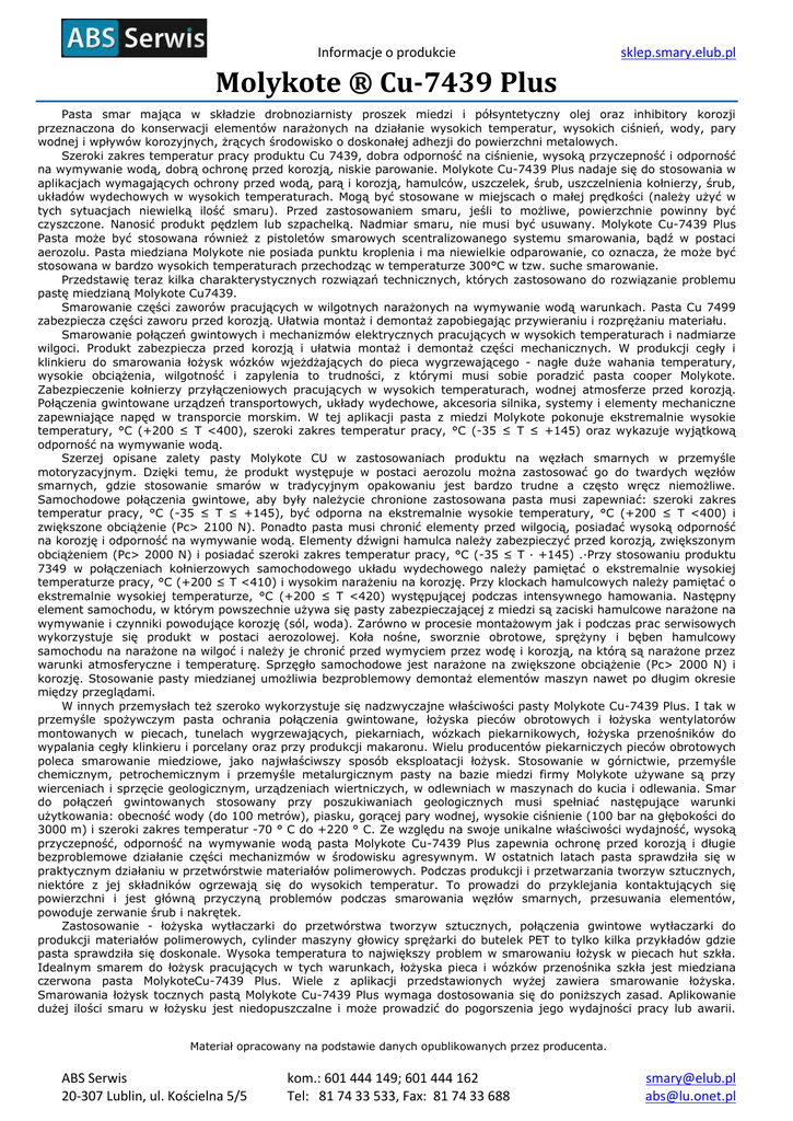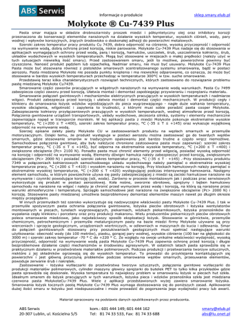 Informacje o produkcie sklep.smary.elub.pl Molykote ® Cu-7439 Plus Pasta smar mająca w składzie drobnoziarnisty proszek miedzi i półsyntetyczny olej oraz inhibitory korozji przeznaczona do konserwacji elementów narażonych na działanie wysokich temperatur, wysokich ciśnień, wody, pary wodnej i wpływów korozyjnych, żrących środowisko o doskonałej adhezji do powierzchni metalowych. Szeroki zakres temperatur pracy produktu Cu 7439, dobra odporność na ciśnienie, wysoką przyczepność i odporność na wymywanie wodą, dobrą ochronę przed korozją, niskie parowanie. Molykote Cu-7439 Plus nadaje się do stosowania w aplikacjach wymagających ochrony przed wodą, parą i korozją, hamulców, uszczelek, śrub, uszczelnienia kołnierzy, śrub, układów wydechowych w wysokich temperaturach. Mogą być stosowane w miejscach o małej prędkości (należy użyć w tych sytuacjach niewielką ilość smaru). Przed zastosowaniem smaru, jeśli to możliwe, powierzchnie powinny być czyszczone. Nanosić produkt pędzlem lub szpachelką. Nadmiar smaru, nie musi być usuwany. Molykote Cu-7439 Plus Pasta może być stosowana również z pistoletów smarowych scentralizowanego systemu smarowania, bądź w postaci aerozolu. Pasta miedziana Molykote nie posiada punktu kroplenia i ma niewielkie odparowanie, co oznacza, że może być stosowana w bardzo wysokich temperaturach przechodząc w temperaturze 300°C w tzw. suche smarowanie. Przedstawię teraz kilka charakterystycznych rozwiązań technicznych, których zastosowano do rozwiązanie problemu pastę miedzianą Molykote Cu7439. Smarowanie części zaworów pracujących w wilgotnych narażonych na wymywanie wodą warunkach. Pasta Cu 7499 zabezpiecza części zaworu przed korozją. Ułatwia montaż i demontaż zapobiegając przywieraniu i rozprężaniu materiału. Smarowanie połączeń gwintowych i mechanizmów elektrycznych pracujących w wysokich temperaturach i nadmiarze wilgoci. Produkt zabezpiecza przed korozją i ułatwia montaż i demontaż części mechanicznych. W produkcji cegły i klinkieru do smarowania łożysk wózków wjeżdżających do pieca wygrzewającego - nagłe duże wahania temperatury, wysokie obciążenia, wilgotność i zapylenia to trudności, z którymi musi sobie poradzić pasta cooper Molykote. Zabezpieczenie kołnierzy przyłączeniowych pracujących w wysokich temperaturach, wodnej atmosferze przed korozją. Połączenia gwintowane urządzeń transportowych, układy wydechowe, akcesoria silnika, systemy i elementy mechaniczne zapewniające napęd w transporcie morskim. W tej aplikacji pasta z miedzi Molykote pokonuje ekstremalnie wysokie temperatury, °C (+200 ≤ T <400), szeroki zakres temperatur pracy, °C (-35 ≤ T ≤ +145) oraz wykazuje wyjątkową odporność na wymywanie wodą. Szerzej opisane zalety pasty Molykote CU w zastosowaniach produktu na węzłach smarnych w przemyśle motoryzacyjnym. Dzięki temu, że produkt występuje w postaci aerozolu można zastosować go do twardych węzłów smarnych, gdzie stosowanie smarów w tradycyjnym opakowaniu jest bardzo trudne a często wręcz niemożliwe. Samochodowe połączenia gwintowe, aby były należycie chronione zastosowana pasta musi zapewniać: szeroki zakres temperatur pracy, °C (-35 ≤ T ≤ +145), być odporna na ekstremalnie wysokie temperatury, °C (+200 ≤ T <400) i zwiększone obciążenie (Pc> 2100 N). Ponadto pasta musi chronić elementy przed wilgocią, posiadać wysoką odporność na korozję i odporność na wymywanie wodą. Elementy dźwigni hamulca należy zabezpieczyć przed korozją, zwiększonym obciążeniem (Pc> 2000 N) i posiadać szeroki zakres temperatur pracy, °C (-35 ≤ T · +145) .·Przy stosowaniu produktu 7349 w połączeniach kołnierzowych samochodowego układu wydechowego należy pamiętać o ekstremalnie wysokiej temperaturze pracy, °C (+200 ≤ T <410) i wysokim narażeniu na korozję. Przy klockach hamulcowych należy pamiętać o ekstremalnie wysokiej temperaturze, °C (+200 ≤ T <420) występującej podczas intensywnego hamowania. Następny element samochodu, w którym powszechnie używa się pasty zabezpieczającej z miedzi są zaciski hamulcowe narażone na wymywanie i czynniki powodujące korozję (sól, woda). Zarówno w procesie montażowym jak i podczas prac serwisowych wykorzystuje się produkt w postaci aerozolowej. Koła nośne, sworznie obrotowe, sprężyny i bęben hamulcowy samochodu na narażone na wilgoć i należy je chronić przed wymyciem przez wodę i korozją, na którą są narażone przez warunki atmosferyczne i temperaturę. Sprzęgło samochodowe jest narażone na zwiększone obciążenie (Pc> 2000 N) i korozję. Stosowanie pasty miedzianej umożliwia bezproblemowy demontaż elementów maszyn nawet po długim okresie między przeglądami. W innych przemysłach też szeroko wykorzystuje się nadzwyczajne właściwości pasty Molykote Cu-7439 Plus. I tak w przemyśle spożywczym pasta ochrania połączenia gwintowane, łożyska pieców obrotowych i łożyska wentylatorów montowanych w piecach, tunelach wygrzewających, piekarniach, wózkach piekarnikowych, łożyska przenośników do wypalania cegły klinkieru i porcelany oraz przy produkcji makaronu. Wielu producentów piekarniczych pieców obrotowych poleca smarowanie miedziowe, jako najwłaściwszy sposób eksploatacji łożysk. Stosowanie w górnictwie, przemyśle chemicznym, petrochemicznym i przemyśle metalurgicznym pasty na bazie miedzi firmy Molykote używane są przy wierceniach i sprzęcie geologicznym, urządzeniach wiertniczych, w odlewniach w maszynach do kucia i odlewania. Smar do połączeń gwintowanych stosowany przy poszukiwaniach geologicznych musi spełniać następujące warunki użytkowania: obecność wody (do 100 metrów), piasku, gorącej pary wodnej, wysokie ciśnienie (100 bar na głębokości do 3000 m) i szeroki zakres temperatur -70 ° C do +220 ° C. Ze względu na swoje unikalne właściwości wyda