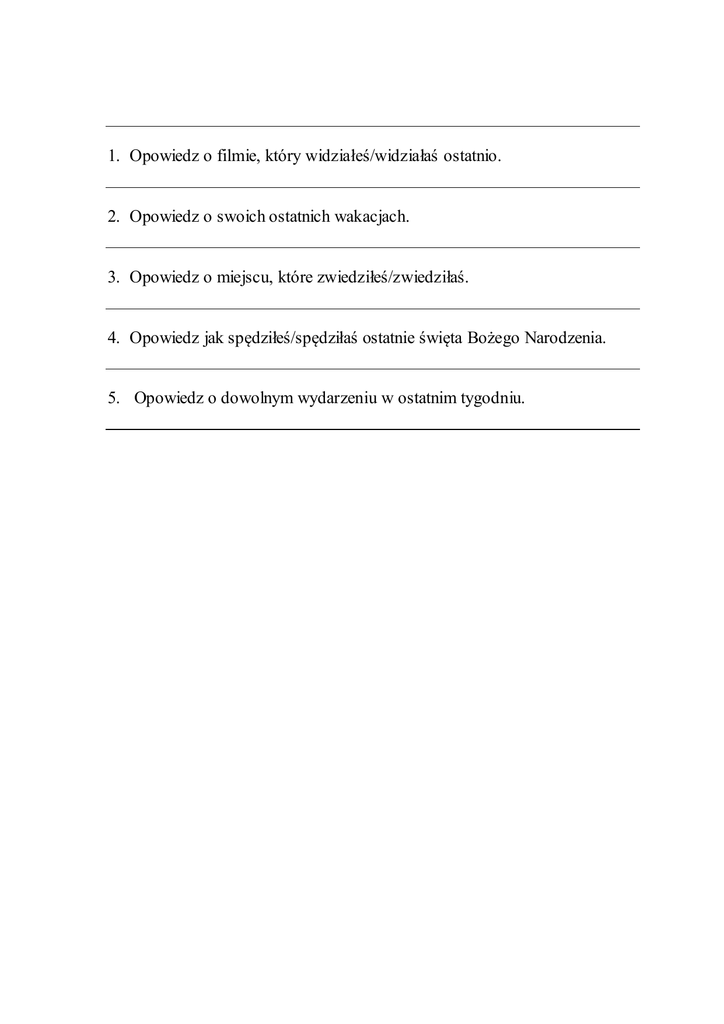 1. Opowiedz o filmie, który widziałeś/widziałaś ostatnio. 2. Opowiedz o swoich ostatnich wakacjach. 3. Opowiedz o miejscu, które zwiedziłeś/zwiedziłaś. 4. Opowiedz jak spędziłeś/spędziłaś ostatnie święta Bożego Narodzenia. 5. Opowiedz o dowolnym wydarzeniu w ostatnim tygodniu.