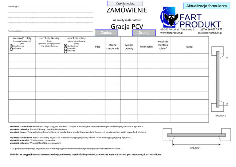 ZAMÓWIENIE Czyść formularz Zamawiający:……………………………………………………………………………………………………………………………………………….. ……………………………………………………………………………………………………………………………………………………………………… ……………………………………………………………………………………………………………………………………………………………………… Gracja PCV na rolety materiałowe …………………………………………………………………………………………………………………………………………………………………….. Termin realizacji:………………………………………………………………………………………………………………………………………….. szerokość rolety (zaznaczyć podawaną) [mm] standardowa całkowita szerokość tkaniny [mm] (podawać tylko gdy ma być inna niż standardowo) Drukuj Zapisz wysokość rolety (zaznaczyć podawaną) [mm] standardowa prowadnic całkowita Aktualizacja formularza Ilość strona sterowania symbol tkaniny kolor osłon 87-100 Toruń ul. Towarowa 3 www.fartprodukt.pl wysokość montażu rolety* tel/fax 56 623 55 77 [email protected] uwagi RYSUNEK 2 szerokość standardowa: Szerokość samej kasety, bez boczków i zaślepek. Pomiar wykonany między krawędziami listew przyszybowych, Rysunek 1. szerokość całkowita: Szerokość kasety z boczkami i zaślepkami. szerokość tkaniny: Podawać tylko gdy ma być inna niż standardowo, standardowa szerokość tkaniny jest mniejsza od szerokości z rysunku 1 o 14 mm. wysokość standardowa: Pomiar wykonany na górze od krawędzi listwy przyszybowej, na dole razem z listwą przyszybową. Rysunek 2. wysokość prowadnic: Wymiar samych prowadnic. wysokość całkowita: Wysokość kasetki z prowadnicami. * Od góry rolety do podłogi. Wysokość potrzebna do przygotowania odpowiedniego zabezpieczenia sznurków i koralików. UWAGA: W przypadku nie zaznaczenia rodzaju podawanej szerokości i wysokości, zamawiane wymiary zostaną potraktowane jako standardowe. RYSUNEK 1