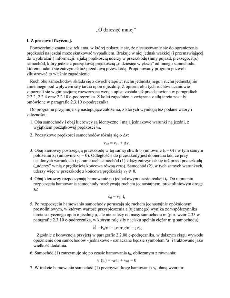 „O dziesięć mniej” I. Z pracowni fizycznej. Powszechnie znana jest reklama, w której pokazuje się, że niestosowanie się do ograniczenia prędkości na jezdni może skutkować wypadkiem. Brakuje w niej jednak ważkiej (i przemawiającej do wyobraźni!) informacji: z jaką prędkością uderzy w przeszkodę (inny pojazd, pieszego, itp.) samochód, który jedzie z początkową prędkością „o dziesięć większą” od innego samochodu, któremu udało się zatrzymać tuż przed ową przeszkodą. Proponowany program pozwoli zilustrować to właśnie zagadnienie. Ruch obu samochodów składa się z dwóch etapów: ruchu jednostajnego i ruchu jednostajnie zmiennego pod wpływem siły tarcia opon o jezdnię. Z opisem obu tych ruchów uczniowie zapoznali się w gimnazjum; rozszerzona wersja opisu została też przedstawiona w paragrafach 2.2.2, 2.2.4 oraz 2.2.10 e-podręcznika. Z kolei zagadnienia związane z siłą tarcia zostały omówione w paragrafie 2.3.10 e-podręcznika. Do programu przyjmuje się następujące założenia, z których wynikają też podane wzory i zależności: 1. Oba samochody i obaj kierowcy są identyczne i mają jednakowe warunki na jezdni, z wyjątkiem początkowej prędkości v0. 2. Początkowe prędkości samochodów różnią się o v: v02 = v01 + v. 3. Obaj kierowcy postrzegają przeszkodę w tej samej chwili t0 (umownie t0 = 0) i w tym samym położeniu x0 (umownie x0 = 0). Odległość s do przeszkody jest dobierana tak, że przy ustalonych warunkach i parametrach samochód (1) zdąży zatrzymać się tuż przed przeszkodą („uderzy” w nią z prędkością końcową równą zero). Samochód (2), w tych samych warunkach, uderzy więc w przeszkodę z końcową prędkością v2 ≠ 0. 4. Obaj kierowcy rozpoczynają hamowanie po jednakowym czasie reakcji tr. Do momentu rozpoczęcia hamowania samochody przebywają ruchem jednostajnym, prostoliniowym drogę sri: sri = v0i·tr 5. Po rozpoczęciu hamowania samochody poruszają się ruchem jednostajnie opóźnionym prostoliniowym, w którym wartość przyspieszenia a (ujemnego) wynika ze współczynnika tarcia statycznego opon o jezdnię , ale nie zależy od masy samochodu m (por. wzór 2.35 w paragrafie 2.3.10 e-podręcznika, w którym rolę siły nacisku spełnia ciężar m·g samochodu): a =Fn/m = ·m·g/m = ·g Zgodnie z konwencją przyjętą w paragrafie 2.2.08 e-podręcznika, w dalszym ciągu wywodu opóźnienie obu samochodów - jednakowe - oznaczane będzie symbolem ‘a’ i traktowane jako wielkość dodatnia. 6. Samochód (1) zatrzymuje się po czasie hamowania th, obliczanym z równania: v1(th) = -a·th + v01 = 0 7. W trakcie hamowania samochód (1) przebywa drogę hamowania sh1 daną wzorem: sh1 = -½·a·th2 + v01·th 8. Tak więc odległość s, zwana całkowitą drogą hamowania dla samochodu (1), w jakiej obaj kierowcy spostrzegli przeszkodę wynosi: s = sr1 +sh1 Całkowita droga hamowania s zależy od v01, tr oraz . Droga ta nie jest jednak całkowitą drogą hamowania dla samochodu (2), gdyż pojazd ten nie zatrzymał się tuż przed przeszkodą. 9. Samochód (2) uderzy w przeszkodę po przebyciu tej samej odległości s, na którą składają się droga sr2 przebyta (ruchem jednostajnym) w trakcie reagowania kierowcy na widok przeszkody oraz droga sh2 (przebyta ruchem jednostajnie opóźnionym) w trakcie hamowania. Jeżeli sr2 ≤ s (dalej zakłada się, że warunek ten jest spełniony), to: sh2 = s - sr2 10. Samochód (2) uderzy w przeszkodę po czasie tu od rozpoczęcia hamowania, obliczanym z równania kwadratowego: sh2 = -½·a·tu2 + v02·tu 11. Samochód (2) uderzy w przeszkodę z prędkością v2 daną wzorem: v2 = -a·tu + v02 Końcowa prędkość v2, zależna od parametrów: v01, v, tr oraz , jest właśnie wynikiem „działania” programu. II. W pracowni informatycznej. Program „O dziesięć mniej” pozwala zilustrować numerycznie oraz za pomocą wykresów różne aspekty zależności całkowitej drogi hamowania oraz końcowej prędkości v2 od czterech parametrów zagadnienia, czyli od v01, v, tr oraz . W tym celu programista zaproponuje rozwiązanie następujących zagadnień szczegółowych. 1. Rozwiązanie równań z założeń 6. i 11., odpowiednio względem th i tu i przedstawienie tych rozwiązań w formie „gotowej do zaprogramowania”, wraz z wyrażeniami na s oraz v2. 2. Określenie jednostek położenia, czasu i prędkości, w jakich program będzie pobierał od użytkownika wartości parametrów zagadnienia, przeprowadzał obliczenia i przedstawiał wyniki. Zalecane jest, by w „bezpośrednim kontakcie” z użytkownikiem, odległości podawane były w metrach, czasy w sekundach, zaś prędkości w kilometrach na godzinę. Jednostki, w których przeprowadzane są obliczenia wewnątrz programu, mogą być dowolne. Wartość przyspieszenia ziemskiego g = 9,81 m/s2. 3. Ustalenie sposobu wprowadzania wartości parametrów przez użytkownika. Ustalić także należy wartości domyślne parametrów oraz zakres ich zmienności. Kilka przydatnych wskazówek podano poniżej. - Używane w programie wartości v01 powinny odzwierciedlać przedział realnie dopuszczalnych prędkości w ruchu drogowym; jako domyślną warto przyjąć ograniczenie prędkości w ruchu miejskim (50 km/h). Warto też wyróżnić w programie następujące prędkości: 30 km/h (typowe ograniczenie na terenie osiedli mieszkaniowych), 90 km/h (dopuszczalna prędkość na typowych drogach) oraz 120 km/h i 140 km/h (dopuszczalna prędkość na drogach ekspresowych i autostradach). - Domyślną wartością v powinno być 10 km/h, zgodnie z tytułem programu. Warto dopuścić wartości v od bliskich zeru do nawet 100 km/h, by pokazać potencjalne skutki „piractwa drogowego”. - Czas prostej reakcji człowieka na pojedynczy bodziec jest rzędu 0,1 - 0,2 sekundy. Kilkuczynnościowa reakcja „zdjąć nogę z gazu i wdepnąć w hamulec” trwa co najmniej 0,5 sekundy (ta wartość może pojawia