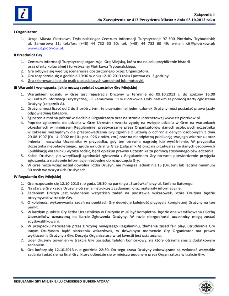 Załącznik 1 do Zarządzenia nr 412 Prezydenta Miasta z dnia 03.10.2013 roku I Organizator 1. Urząd Miasta Piotrkowa Trybunalskiego; Centrum Informacji Turystycznej; 97-300 Piotrków Trybunalski; ul. Zamurowa 11; tel./fax: (+48) 44 732 60 50; tel. (+48) 44 732 60 49; e-mail: [email protected]; www.cit.piotrkow.pl. II Przedmiot Gry 1. Centrum Informacji Turystycznej organizuje Grę Miejską, która ma na celu przybliżenie historii oraz oferty kulturalnej i turystycznej Piotrkowa Trybunalskiego. 2. Gra odbywa się według scenariusza dostarczonego przez Organizatora. 3. Gra rozpocznie się o godzinie 19:30 w dniu 12.10.2013 roku i potrwa ok. 3 godziny. 4. Gra skierowana jest do osób posiadających samochód lub motocykl. III Warunki i wymagania, jakie muszą spełniać uczestnicy Gry Miejskiej 1. Warunkiem udziału w Grze jest rejestracja Drużyny w terminie do 09.10.2013 r. do godziny 16:00 w Centrum Informacji Turystycznej, ul. Zamurowa 11 w Piotrkowie Trybunalskim za pomocą Karty Zgłoszenia Drużyny (załącznik A). 2. Drużyna musi liczyć od 2 do 5 osób z tym, że przynajmniej jeden członek Drużyny musi posiadać prawo jazdy odpowiedniej kategorii. 3. Zgłoszenia można pobrać w siedzibie Organizatora oraz na stronie internetowej www.cit.piotrkow.pl. 4. Poprzez zgłoszenie do udziału w Grze Uczestnik wyraża zgodę na wzięcie udziału w Grze na warunkach określonych w niniejszym Regulaminie; przetwarzanie przez Organizatorów danych osobowych uczestnika w zakresie niezbędnym dla przeprowadzenia Gry zgodnie z ustawą o ochronie danych osobowych z dnia 29.08.1997 (Dz. U. 2002 nr 101 poz. 926 z późn. zm.) oraz na nieodpłatną publikację swojego wizerunku oraz imienia i nazwiska Uczestnika w przypadku, gdy ten otrzyma nagrodę lub wyróżnienie. W przypadku Uczestnika niepełnoletniego, zgodę na udział w Grze (załącznik A) oraz na przetwarzanie danych osobowych i publikację wizerunku wyraża rodzic, bądź opiekun prawny Uczestnika za pomocą stosownego oświadczenia. 5. Każda Drużyna, po weryfikacji zgodności zgłoszenia z Regulaminem Gry otrzyma potwierdzenie przyjęcia zgłoszenia, a następnie informacje niezbędne do rozpoczęcia Gry. 6. W Grze może wziąć udział dowolna liczba Drużyn, nie mniejsza jednak niż 15 (Drużyn) lub łącznie minimum 30 osób we wszystkich Drużynach. IV Regulamin Gry Miejskiej 1. Gra rozpocznie się 12.10.2013 r. o godz. 19:30 na parkingu „Starówka” przy ul. Stefana Batorego. 2. Na starcie Gry każda Drużyna otrzyma instrukcję z zadaniami oraz materiały informacyjne. 3. Zadaniem Drużyn jest wykonanie wszystkich zadań na podstawie wskazówek, które Drużyna będzie otrzymywać w trakcie Gry. 4. O kolejności wykonywania zadań na punktach Gry decyduje kolejność przybycia kompletnej Drużyny na ten punkt. 5. W każdym punkcie Gry liczba Uczestników w Drużynie musi być kompletna. Będzie ona weryfikowana z liczbą Uczestników oznaczoną na Karcie Zgłoszenia Drużyny. W razie niezgodności uczestnicy mogą zostać zdyskwalifikowani. 6. W przypadku naruszenia przez Drużynę niniejszego Regulaminu, złamania zasad fair play, utrudniania Gry innym Drużynom bądź niszczenia wskazówek, w dowolnym momencie Gry Organizator ma prawo wykluczenia Drużyny z Gry. Decyzja Organizatora w tej kwestii jest ostateczna. 7. Lider drużyny powinien w trakcie Gry posiadać telefon komórkowy, na który otrzyma sms z dodatkowym zadaniem. 8. Gra kończy się 12.10.2013 r. o godzinie 22:30. Do tego czasu Drużyny zobowiązane są wykonać wszystkie zadania i udać się na finał Gry, który odbędzie się w miejscu podanym przez Organizatora w trakcie Gry. REGULAMIN GRY MIEJSKIEJ „U CARSKIEGO GUBERNATORA” Załącznik 1 do Zarządzenia nr 412 Prezydenta Miasta z dnia 03.10.2013 roku V Zasady bezpieczeństwa 1. Organizatorzy nie zapewniają opieki Uczestników pełnoletnich dla Uczestników niepełnoletnich uczestniczących w Grze. 2. Uczestnikiem gry może być każda osoba fizyczna. 3. Gra toczy się w normalnym ruchu miejskim i prosimy o zachowanie szczególnej ostrożności. 4. Organizator nie zapewnia ubezpieczenia uczestników podczas trwania Gry. 5. Organizator nie zapewnia pomocy medycznej. VI Ogłoszenie wyników i wręczenie nagród 1. Kompletna Drużyna, która jako pierwsza wypełni wszystkie zadania otrzyma nagrodę. 2. Nagrody zostaną wręczone Drużynie obecnej podczas finału Gry o godzinie 22:30. 3. Decyzja komisji jest ostateczna. VII Postanowienia końcowe 1. Regulamin znajduje się do wglądu w siedzibie Organizatora i na stronie internetowej www.cit.piotrkow.pl. 2. W kwestiach dotyczących przebiegu Gry, nieprzewidzianych niniejszym Regulaminem, a także w zakresie interpretacji niniejszego Regulaminu, głos rozstrzygający należy do Organizatora. 3. Organizator zastrzega sobie prawo wprowadzenia zmian w Regulaminie z ważnych przyczyn. REGULAMIN GRY MIEJSKIEJ „U CARSKIEGO GUBERNATORA” Załącznik 1 do Zarządzenia nr 412 Prezydenta Miasta z dnia 03.10.2013 roku Załącznik A KARTA ZGŁOSZENIA DRUŻYNY Nazwa Drużyny: Telefon kontaktowy do Lidera Drużyny: Dane uczestników Drużyny: Lp. 1. Imię i nazwisko Miejscowość Data urodzenia Lider Drużyny: 2. 3. 4. 5. Oświadczenia 1. Wyrażam zgodę na przetwarzanie danych osobowych w celach związanych z organizacją Gry Miejskiej zgodnie z ustawą z dnia 29 sierpnia 1997 r. o ochronie danych osobowych (tekst jedn.: Dz. U. z 2002 r. Nr 101, poz. 926 z późn. zm.). 2. Oświadczam, że zapoznałam / zapoznałem się z Regulaminem Gry Miejskiej i przyjmuję jego warunki. 3. 4. Wyrażam zgodę na nieodpłatną publikację mojego wizerunku oraz imienia i nazwiska w przypadku, otrzymania nagrody lub wyróżnienia. Wyrażam zgodę/nie wyrażam zgody* na wprowadzenie mojego nr telefonu do bazy CIT celem informowania mnie o wydarzeniach turystycznych organizowanych przez CIT. Czytelne podpisy członków drużyny lub opiekunów niepełnoletnich uczestników: 1. 2.