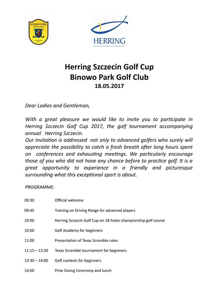 Herring Szczecin Golf Cup Binowo Park Golf Club 18.05.2017 Dear Ladies and Gentleman, With a great pleasure we would like to invite you to participate in Herring Szczecin Golf Cup 2017, the golf tournament accompanying annual Herring Szczecin. Our invitation is addressed not only to advanced golfers who surely will appreciate the possibility to catch a fresh breath after long hours spent on conferences and exhausting meetings. We particularly encourage those of you who did not have any chance before to practice golf. It is a great opportunity to experience in a friendly and picturesque surrounding what this exceptional sport is about. PROGRAMME: 09:30 Official welcome 09:45 Training on Driving Range for advanced players 10:00 Herring Szczecin Golf Cup on 18-holes championship golf course 10:00 Golf Academy for beginners 11:00 Presentation of Texas Scramble rules 11:15 – 13:30 Texas Scramble tournament for beginners 13:30 – 14:00 Golf contests for beginners 14:00 Prize Giving Ceremony and lunch ENTRY FORM Herring Szczecin Golf Cup Binowo Park Golf Club 18.05.2017 Herring Szczecin Golf Cup – 350 PLN per person additional cost of clubs rental – 85 PLN Player Name HCP Home Club Telephone e-mail 1 2 3 4 5 Golf Academy for beginners - 350 PLN per person clubs rentals included Player Name Telephone e-mail 1 2 3 4 5 HERRING SZCZECIN GOLF CUP - PROGRAM 09:30 Official welcome 09:45 Training on Driving Range for advanced players 10:00 Herring Szczecin Golf Cup on 18-holes golf course 10:00 Golf Academy for beginners 11:00 Presentation of Texas Scramble rules 11:15 -13:30 Texas Scramble tournament for beginners 13:30 -14:00 Golf contests for beginners 14:00 Prize Giving Ceremony and lunch Entry form should be sent until 12.05.17. The payment should be done before 12.05.17. Binowo Park Sp. z o.o. Binowo 62 74-106 Stare Czarnowo POLAND Tel. 0048 91 404 15 33 Fax. 0048 91 404 15 38 e-mail: [email protected] www.binowopark.pl Account number: Bank PEKAO SA, SWIFT: PKOPPLPW 57 1240 3855 1111 0010 4535 6028 (PLN)