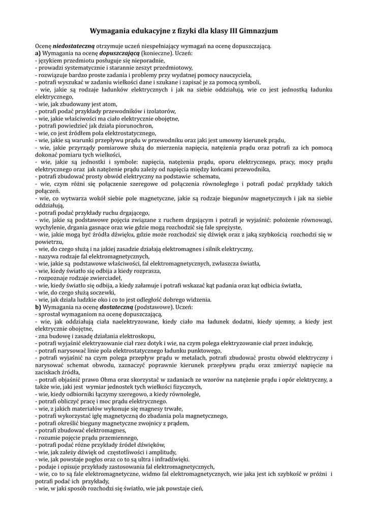 Wymagania edukacyjne z fizyki dla klasy III Gimnazjum