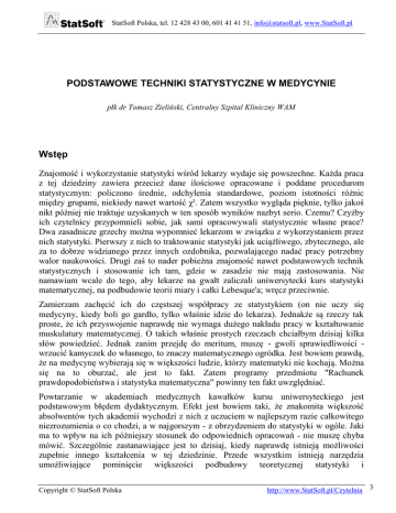 StatSoft Polska, tel. 12 428 43 00, 601 41 41 51, [email protected], www.StatSoft.pl PODSTAWOWE TECHNIKI STATYSTYCZNE W MEDYCYNIE płk dr Tomasz Zieliński, Centralny Szpital Kliniczny WAM Wstęp Znajomość i wykorzystanie statystyki wśród lekarzy wydaje się powszechne. Każda praca z tej dziedziny zawiera przecież dane ilościowe opracowane i poddane procedurom statystycznym: policzono średnie, odchylenia standardowe, poziom istotności różnic między grupami, niekiedy nawet wartość χ². Zatem wszystko wygląda pięknie, tylko jakoś nikt później nie traktuje uzyskanych w ten sposób wyników nazbyt serio. Czemu? Czyżby ich czytelnicy przypomnieli sobie, jak sami opracowywali statystycznie własne prace? Dwa zasadnicze grzechy można wypomnieć lekarzom w związku z wykorzystaniem przez nich statystyki. Pierwszy z nich to traktowanie statystyki jak uciążliwego, zbytecznego, ale za to dobrze widzianego przez innych ozdobnika, pozwalającego nadać pracy potrzebny walor naukowości. Drugi zaś to nader pobieżna znajomość nawet podstawowych technik statystycznych i stosowanie ich tam, gdzie w zasadzie nie mają zastosowania. Nie namawiam wcale do tego, aby lekarze na gwałt zaliczali uniwersytecki kurs statystyki matematycznej, na podbudowie teorii miary i całki Lebesque'a; wręcz przeciwnie. Zamierzam zachęcić ich do częstszej współpracy ze statystykiem (on nie uczy się medycyny, kiedy boli go gardło, tylko właśnie idzie do lekarza). Jednakże są rzeczy tak proste, że ich przyswojenie naprawdę nie wymaga dużego nakładu pracy w kształtowanie muskulatury matematycznej. O takich właśnie prostych rzeczach chciałbym dzisiaj kilka słów powiedzieć. Jednak zanim przejdę do meritum, muszę - gwoli sprawiedliwości wrzucić kamyczek do własnego, to znaczy matematycznego ogródka. Jest bowiem prawdą, że na medycynę wybierają się w większości ludzie, którzy matematyki nie kochają. Można się na to oburzać, ale jest to fakt. Zatem programy przedmiotu "Rachunek prawdopodobieństwa i statystyka matematyczna" powinny ten fakt uwzględniać. Powtarzanie w akademiach medycznych kawałków kursu uniwersyteckiego jest podstawowym błędem dydaktycznym. Efekt jest bowiem taki, że znakomita większość absolwentów tych akademii wychodzi z nich z uczuciem w najlepszym razie całkowitego niezrozumienia o co chodzi, a w najgorszym - z obrzydzeniem do statystyki w ogóle. Jaki ma to wpływ na ich późniejszy stosunek do odpowiednich opracowań - nie muszę chyba mówić. Szczególnie zastanawiające jest to dzisiaj, kiedy naprawdę istnieją możliwości zupełnie innego kształcenia w tej dziedzinie. Przede wszystkim istnieją narzędzia umożliwiające pominięcie większości podbudowy teoretycznej statystyki i Copyright © StatSoft Polska http://www.StatSoft.pl/Czytelnia 3 StatSoft Polska, tel. 12 428 43 00, 601 41 41 51, [email protected], www.StatSoft.pl skoncentrowanie się na tym co jest naprawdę ważne, to jest na zrozumieniu, czemu służą określone techniki i jak można je wykorzystać w praktyce. Narzędziami takimi są pakiety statystyczne, natomiast kwestia rozumienia tego, co się robi, jest właśnie tematem, na którym skupimy swoją uwagę. Spojrzenie na dane Przyjrzyjmy się dość typowej karcie opisu pacjenta przyjmowanego do szpitala. Przedstawiam oczywiście jej fragment, interesujący nas pod pewnymi względami. 1. Imię 11. Hematokryt 2. Nazwisko 12. OB. 3. Data ur. 13. RBC 4. Data ostatniej operacji 14. WBC 5. Operacja (typ) 15. Jonogram 6. Znieczulenie - Lokalne - Przewodowe - Dożylne - Dotchawicze 16. Albuminy 7. Stan po operacji - Bardzo dobry - Dobry - Dostateczny - Zły 17.Reszta azotowa 8. Powikłania - Wystąpiły - Nie wystąpiły 18. APTT 9. Leczenie poszpitalne - Miało miejsce - Nie miało miejsca 19. HBS - Dodatni - Ujemny - Ten sam powód 10. Ponowna hospitalizacja - Inny powód 20. HIV - Brak - Dodatni - Ujemny W pola białe wprowadzamy wartości liczbowe, noszące w nomenklaturze nazwę danych przedziałowych, w pola z pogrubioną ramką dane porządkowe(pozwalające 4 www.StatSoft.pl Copyright © StatSoft Polska StatSoft Polska, tel. 12 428 43 00, 601 41 41 51, [email protected], www.StatSoft.pl wykorzystać relację "większy - mniejszy"), a w pola szare (jasne i ciemne) dane nominalne. Dlaczego zatem dla tych ostatnich są przeznaczone dwa kolory? Ano dlatego, że jeśli dane mogą przyjmować tylko dwie wartości, np. "mężczyzna - kobieta", "jest - nie ma" (np. wirus HIV), to takie dane nazywamy dychotomicznymi. W praktyce medycznej najczęściej spotykamy się z danymi przedziałowymi, ale dane nominalne (czyli klasyfikacje) też często występują. Dane porządkowe występują znacznie rzadziej. Po co nam te informacje? Oczywiście po to, abyśmy wiedzieli, kiedy można stosować jakie techniki statystyczne oczywiście. Wizualizacja danych No właśnie - jedna z najprostszych metod analizy, nie wymagająca znajomości statystyki, a w jakimże jest lekceważeniu! Nie w tym rzecz, że się jej nie stosuje, tylko w tym, iż niczemu nie służy. A przecież spojrzenie na właściwie zilustrowane dane pozwala od razu nabrać pewnego wyobrażenia o tym, jakie z nich informacje możemy uzyskać. Spójrzmy na poniższe wykresy, zwane histogramami lub wykresami słupkowymi. Rysunek 1 Copyright © StatSoft Polska http://www.StatSoft.pl/Czytelnia 5 StatSoft Polska, tel. 12 428 43 00, 601 41 41 51, [email protected], www.StatSoft.pl Rysunek 2 Przedstawiają one średnią podstawową płacę miesięczną lekarzy w pewnej przychodni oraz ich roczną premię. Zasadnicza różnica między tymi wykresami jest oczywista: pierwszy pozwala sensownie mówić o średniej płacy zasadniczej (700 zł), w drugim natomiast średnia premia (także 700 zł) jest absolutnie nieprzydatna, gdyż żadna premia nie jest nawet zbliżona do średniej. Co w takim wypadku mamy robić? Musimy znać inne miary tendencji centralnej. Możemy na