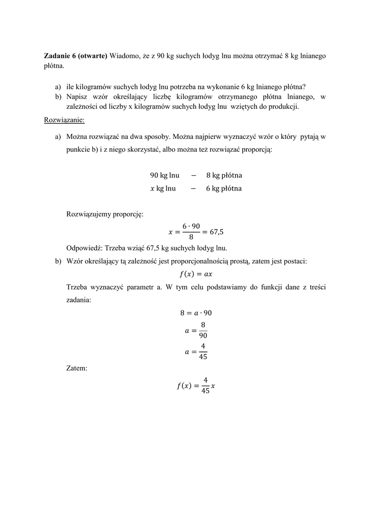 Zadanie 6 (otwarte) Wiadomo, że z 90 kg suchych łodyg lnu można otrzymać 8 kg lnianego płótna. a) ile kilogramów suchych łodyg lnu potrzeba na wykonanie 6 kg lnianego płótna? b) Napisz wzór określający liczbę kilogramów otrzymanego płótna lnianego, w zależności od liczby x kilogramów suchych łodyg lnu wziętych do produkcji. Rozwiązanie: a) Można rozwiązać na dwa sposoby. Można najpierw wyznaczyć wzór o który pytają w punkcie b) i z niego skorzystać, albo można też rozwiązać proporcją: 90kglnu 8kgpłótna kglnu 6kgpłótna Rozwiązujemy proporcję: 6 ∙ 90 67,5 8 Odpowiedź: Trzeba wziąć 67,5 kg suchych łodyg lnu. b) Wzór określający tą zależność jest proporcjonalnością prostą, zatem jest postaci: Trzeba wyznaczyć parametr a. W tym celu podstawiamy do funkcji dane z treści zadania: 8 ∙ 90 8 90 4 45 Zatem: 4 45