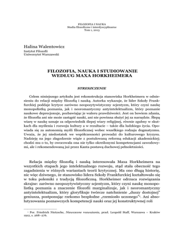 FILOZOFIA I NAUKA Studia filozoficzne i interdyscyplinarne Tom 1, 2013 Halina Walentowicz Instytut Filozofii Uniwersytet Warszawski FILOZOFIA, NAUKA I STUDIOWANIE WEDŁUG MAXA HORKHEIMERA STRESZCZENIE Celem niniejszego artykułu jest rekonstrukcja stanowiska Horkheimera w odniesieniu do relacji między filozofią i nauką. Autorka wykazuje, że lider Szkoły Frankfurckiej poddaje krytyce zarówno neopozytywistyczny scjentyzm, który czyni naukę monopolistką poznania, jak i neoromantyczny antyintelektualizm, który poznanie naukowe deprecjonuje, pozbawiając je waloru prawdziwości. Jest on bowiem zdania, że filozofia ani nie może zastąpić nauki, ani nie powinna służyć jej za narzędzie. Ślepą wiarę w naukę uznaje za odpowiednik ślepej wiary religijnej, równie zgubny w skutkach dla myślenia i rozwoju kultury a w rezultacie – także dla ludzkiego życia. Opowiada się za autonomią myśli filozoficznej wobec wszelkiego rodzaju dogmatyzmu. Uważa, że jej niedostatek we współczesności prowadzi do kulturowego kryzysu. Nadzieję na jego złagodzenie wiąże z postulowaną reformą edukacji akademickiej; chodzi mu o to, by owocowała ona nie tylko określonymi kompetencjami zawodowymi, ale i rekomendowaną już przez Kanta postawą duchowej pełnoletniości. Relacja między filozofią i nauką interesowała Maxa Horkheimera na wszystkich etapach jego intelektualnego rozwoju, stąd stała obecność tego zagadnienia w różnych wariantach teorii krytycznej. Ma ono długą historię, nic więc dziwnego, że stanowisko lidera Szkoły Frankfurckiej kształtowało się w toku polemiki z tradycją filozoficzną. Horkheimer odrzuca rozwiązania skrajne: zarówno neopozytywistyczny scjentyzm, który czyni naukę monopolistką poznania a znaczenie filozofii marginalizuje, jak i neoromantyczny antyintelektualizm, który gloryfikuje twórcze natchnienie „duszy dostojnej” geniusza, postponując rzekomo bezpłodne „rzemiosło uczonego”1. Ani absolutyzowania poznawczych kompetencji nauki oraz jej konstruktywnej roli ————————— 1 Por. Friedrich Nietzsche, Niewczesne rozważania, przeł. Leopold Staff, Warszawa – Kraków 1912, s. 268–276. 226 Halina Walentowicz w życiu jednostkowym i społecznym, ani na odwrót – odmawiania nauce potencji kulturotwórczej nie uznaje za słuszne. Wspólny mianownik tych stanowisk upatruje we wrogości wobec rozumu. Horkheimer poczytuje rozum za wyższą od rozsądku instancję poznawczą, która jednak nie potrafi obejść się bez jego mrówczej pracy jako narzędzia; dlatego też roszczenie do mądrości idące w parze z ignorowaniem, czy tym bardziej deprecjonowaniem wiedzy, uważa za bezpodstawne. Wbrew bezkrytycznym zwolennikom „szkiełka i oka” i na przekór ultrakrytycznym wobec oświecenia entuzjastom „czucia i wiary” widzi u źródeł współczesnego impasu kulturowego instrumentalizację myślenia, która wyraża się w koncentracji na środkach kosztem refleksji nad celami, co może nie szkodzi nauce, ale okazuje się zgubne dla filozofii jako rzeczniczki człowieczeństwa. Znana jest Horkheimerowska formuła filozofii jako wnoszenia rozumu do świata, czyli dążenia do uczynienia świata rozumnym. Twórca teorii krytycznej zastrzega jednak, że pierwszym aktem racjonalizowania rzeczywistości musi być zweryfikowanie współczesnego standardu rozumności: „zdemaskowanie tego, co współcześnie nazywa się rozumem, jest największą przysługą, jaką może oddać rozum”2. Toteż prawdziwi filozofowie, jak powiada Horkheimer, pozostają w opozycji do tego, co dziś uchodzi za filozofię. Krytyczna ocena głównych nurtów filozofii współczesnej utwierdza go w przekonaniu, że w XX wieku rozwój europejskiej myśli filozoficznej dobiega końca i oto jesteśmy świadkami jej agonii. Parafrazując słynną tezę Nietzschego o śmierci Boga, współzałożyciel Szkoły Frankfurckiej diagnozuje zmierzch myśli. Residuum niegdysiejszego ducha, pogrobowcem wielkiej filozofii europejskiej, jest w ujęciu teorii krytycznej właśnie neopozytywizm. Stawiając znak równości między poznaniem i procedurami badawczymi uczonych, koncepcja ta odmawia filozofii walorów poznawczych, wyznacza jej służebną rolę względem nauki i w konsekwencji pozbawia autonomii. Pozytywizm, zwany przez Horkheimera filozoficzną technokracją, uznaje naukę za automatycznego szermierza postępu. Ta wiara w zbawczą moc nauki wydaje się frankfurckiemu filozofowi bezzasadna; nauka jest dlań bowiem narzędziem, z którego można zrobić dowolny użytek. Zarzuca ponadto pozytywistom zapoznawanie różnicy między prawdą o charakterze egzystencjalnym i poprawnością faktograficzną. „Myli się hipotezy, które są potwierdzane przez zdania protokolarne, po czym zapadają w niebyt, z prawdą, którą niegdyś jednostka mogła zdobyć, by w niej żyć i umrzeć.”3 ————————— 2 Max Horkheimer, Krytyka instrumentalnego rozumu, przeł. Halina Walentowicz, Wydawnictwo Naukowe Scholar, Warszawa 2007, s. 181. 3 Idem, Odpowiedzialność i studia, przeł. Halina Walentowicz, w: Wiedza, ideologia, władza. O społecznej funkcji uniwersytetu w społeczeństwie rynkowym, red. nauk. Piotr Żuk, Wydawnictwo Naukowe SCHOLAR, Warszawa 2012, s. 278. Filozofia, nauka i studiowanie według Maxa Horkheimera 227 Budzi sprzeciw Horkheimera uznanie konstatacji faktów za jedyną prawomocną formę poznania. Teoria, która absolutyzuje fakty jako rzekomo bezpośrednie, pierwotnie dane, jest naiwna, pozbawiona autorefleksji, nie widzi bowiem tego, że fakt – jak to już wykazał Kant – stanowi konstrukt, wytwór apercepcji. Wbrew Kantowi jednak Horkheimer utrzymuje, że czynniki strukturyzujące fenomenalny świat możliwego doświadczenia mają charakter społeczno-historyczny. Są więc zmienne, dlatego nie sposób określić ich raz na zawsze; wymaga to każdorazowo specjalnej analizy. Respekt wobec faktyczności prowadzi do 
