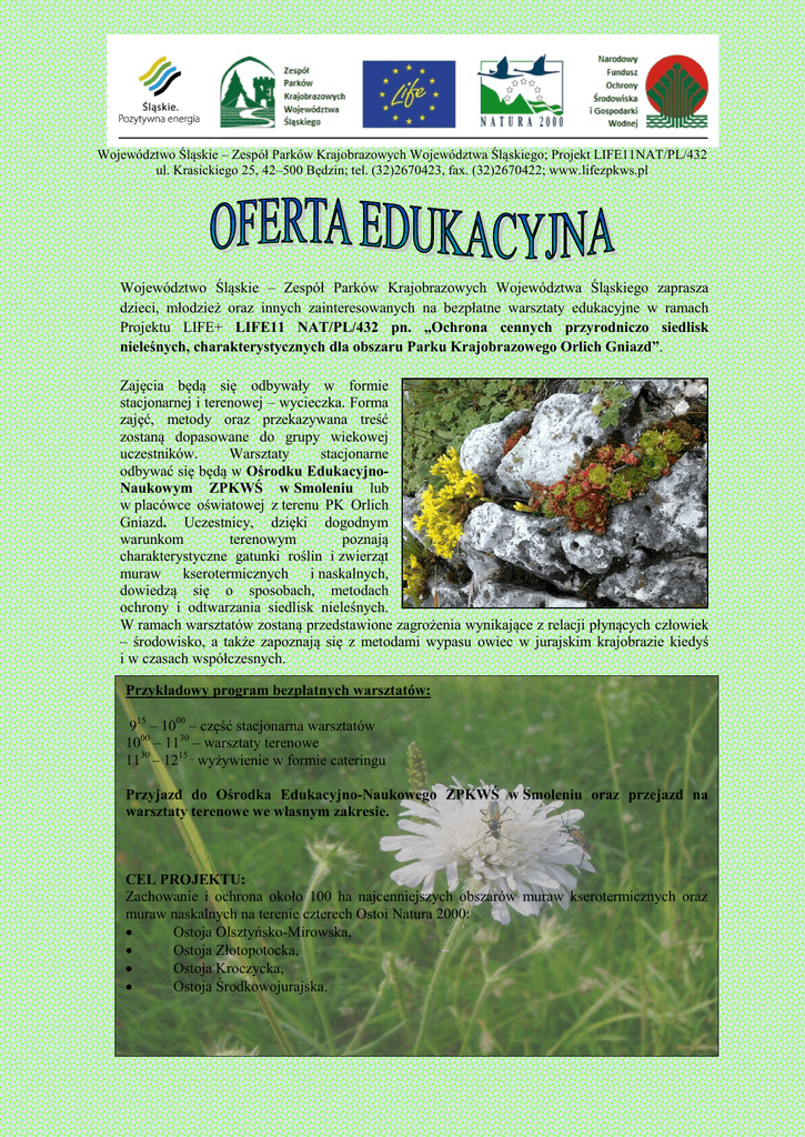 Województwo Śląskie – Zespół Parków Krajobrazowych Województwa Śląskiego; Projekt LIFE11NAT/PL/432 ul. Krasickiego 25, 42–500 Będzin; tel. (32)2670423, fax. (32)2670422; www.lifezpkws.pl Województwo Śląskie – Zespół Parków Krajobrazowych Województwa Śląskiego zaprasza dzieci, młodzież oraz innych zainteresowanych na bezpłatne warsztaty edukacyjne w ramach Projektu LIFE+ LIFE11 NAT/PL/432 pn. „Ochrona cennych przyrodniczo siedlisk nieleśnych, charakterystycznych dla obszaru Parku Krajobrazowego Orlich Gniazd”. Zajęcia będą się odbywały w formie stacjonarnej i terenowej – wycieczka. Forma zajęć, metody oraz przekazywana treść zostaną dopasowane do grupy wiekowej uczestników. Warsztaty stacjonarne odbywać się będą w Ośrodku EdukacyjnoNaukowym ZPKWŚ w Smoleniu lub w placówce oświatowej z terenu PK Orlich Gniazd. Uczestnicy, dzięki dogodnym warunkom terenowym poznają charakterystyczne gatunki roślin i zwierząt muraw kserotermicznych i naskalnych, dowiedzą się o sposobach, metodach ochrony i odtwarzania siedlisk nieleśnych. W ramach warsztatów zostaną przedstawione zagrożenia wynikające z relacji płynących człowiek – środowisko, a także zapoznają się z metodami wypasu owiec w jurajskim krajobrazie kiedyś i w czasach współczesnych. Przykładowy program bezpłatnych warsztatów: 915 – 1000 – część stacjonarna warsztatów 1000 – 1130 – warsztaty terenowe 1130 – 1215 _ wyżywienie w formie cateringu Przyjazd do Ośrodka Edukacyjno-Naukowego ZPKWŚ w Smoleniu oraz przejazd na warsztaty terenowe we własnym zakresie. CEL PROJEKTU: Zachowanie i ochrona około 100 ha najcenniejszych obszarów muraw kserotermicznych oraz muraw naskalnych na terenie czterech Ostoi Natura 2000: Ostoja Olsztyńsko-Mirowska, Ostoja Złotopotocka, Ostoja Kroczycka, Ostoja Środkowojurajska. GŁÓWNE DZIAŁANIA W RAMACH PROEJKTU: C.1 Usuwanie podrostów drzew i krzewów C.2 Usuwanie pniaków z powierzchni muraw C.3 Wprowadzenie wypasu zwierząt C.4 Zachowanie warunków siedliskowych warzuchy polskiej C.5 Usuwanie rdestowca sachalińskiego C.6 Czynna ochrona muraw naskalnych poprzez kierunkowanie ruchu wspinaczkowego C.8 Uprzątnięcie nielegalnych wysypisk śmieci z terenu muraw C.9 Czynna ochrona poprzez patrole prewencyjne C.10 Ukierunkowanie ruchu turystycznego FINANSOWANIE: • Instrument Finansowy LIFE+ (środki unijne) • Narodowy Fundusz Ochrony Środowiska i Gospodarki Wodnej • budżet Województwa Śląskiego przy wsparciu gmin biorących udział w Projekcie (Pilica, Olsztyn, Kroczyce, Niegowa, Zawiercie, Żarki, Wolbrom, Ogrodzieniec, Łazy) Województwo Śląskie - Zespół Parków Krajobrazowych Województwa Śląskiego – Biuro Terenowe w Smoleniu Tel. 32 672 42 84 Milena Ziętek