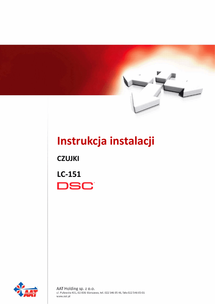 Instrukcja instalacji CZUJKI LC-151 SPIS TREŚCI 1. WSTĘP ............................................................................................................................................................................3 2. CHARAKTERYSTYKA ........................................................................................................................................................3 3. CZĘŚCI SKŁADOWE .........................................................................................................................................................3 4. CHARAKTERYSTYKI DETEKCJI .........................................................................................................................................4 5. WYBÓR MIEJSCA INSTALACJI .........................................................................................................................................4 6. MONTAŻ URZĄDZENIA ...................................................................................................................................................5 7. OPIS ZACISKÓW .............................................................................................................................................................6 7.1. PRZEKROJE PRZEWODÓW 8. USTAWIENIA I REGULACJE ..........................................................................................................................................7 .............................................................................................................................................7 8.1. USTAWIENIE POLA DETEKCJI ......................................................................................................................................7 8.2. REGULACJA CZUŁOŚCI .................................................................................................................................................7 8.3. DIODY LED ...................................................................................................................................................................8 9. DZIAŁANIE ......................................................................................................................................................................8 10. TEST INSTALACJI ............................................................................................................................................................8 11. AKCESORIA ...................................................................................................................................................................8 12. SPECYFIKACJA TECHNICZNA .........................................................................................................................................9 1. WSTĘP LC-151 to dualna czujka zewnętrzna wykorzystująca technologię detekcji podczerwieni i detekcji mikrofalowej. Przy zastosowaniu opcjonalnych soczewek czujka posiada także funkcje odporności na zwierzęta co powoduje iż jest obojętna na ptaki oraz małe zwierzęta. Czujka została specjalnie zaprojektowana do zastosowań w trudnych warunkach zewnętrznych zapewniając doskonałą skuteczność detekcji przy wyjątkowo niskim wskaźniku fałszywych alarmów. Pole detekcji czujki oraz czułość czujnika PIR jest regulowana za pomocą potencjometru, dzięki czemu działanie każdej czujki można dopasować odpowiednio do warunków środowiskowych występujących przy danej instalacji. 2. CHARAKTERYSTYKA • • • • • • • • • • • • • detekcja mikrofalowa oparta na efekcie Dopplera wyjścia przekaźnikowe N.O i N.C. wysokość instalacji od 1,8 do 2,4m odporność na zwierzęta o wadze do 15kg, lub do 36kg przy zastosowaniu soczewki LC-F1-15X regulowana czułość czujnika PIR wybór czułości czujnika mikrofalowego kompensacja temperatury cyfrowa obróbka sygnału sabotaż otwarcia i oderwania od ściany szczelna obudowa charakteryzująca się nowoczesnym designem maksymalny zasięg detekcji do 15m wysoka odporność na zakłócenia elektromagnetyczne i radiowe odporność na bezpośrednie działanie promieni słonecznych, wiatr do 30m/sek, śnieg i deszcz, oraz małe zwierzęta 3. CZĘŚCI SKŁADOWE LC-151 posiada wbudowany duży wskaźnik diodowy LED, dzięki któremu instalator podczas przeprowadzania testu instalacji, nawet z dużej odległości możne stwierdzić czy zostały naruszone strefy detekcji czujki. Za pomocą dostarczonego wraz z urządzeniem uchwytu montażowego istnieje możliwość instalacji czujki bezpośrednio na ścianie. Przy instalacjach wymagających pionowej lub poziomej regulacji pola detekcji czujki należy użyć opcjonalnego uchwytu LC-B1-15X (patrz rys. poniżej). Czujka LC-151 Opcjonalny uchwyt LC-B1-15X Czujka LC-151 posiada dwa czujniki czujnik PIR czujnik mikrofalowy Rysunek poniżej opisuje budowę czujki. • • Czujnik mikrofalowy Diody LED Włączenie/wyłączenie diody LED Przełącznik czułości mikrofali Regulacja czułości czujnika PIR Przełącznik sabotażowy Czujnik PIR Listwa zaciskowa AAT Holding sp. z o.o. Wszelkie prawa zastrzeżone. 3 4. CHARAKTERYSTYKI DETEKCJI Czujka LC-151 ma szerokokątną charakterystykę detekcji o kącie 90° i zasięgu pola detekcji do 15m (przy instalacji urządzenia na wysokości 2,4m nad powierzchnią ziemi). Charakterystyka detekcji przy zastosowaniu standardowych soczewek Widok z góry Widok z boku 10,5 m 2,4m 0 90° 15m 10,5 m Charakterystyka detekcji przy zastosowaniu opcjonalnej soczewki kurtynowej LC-L1-15X Widok z góry 14 m Widok z boku 2,4m 0 1m 20m 14 m Czujka wejdzie w stan alarmu jeżeli czujnik PIR i mikrofalowy zostaną naruszone jednocześnie. Jeżeli zostanie naruszony jedynie czujnik PIR lub czujnik mikrofalowy czujka nie wygeneruje alarmu. 5. WYBÓR MIEJSCA INSTALACJI Czujkę należy instalować na twardych solidnych powierzchniach, zwracając uwagę by pole detekcji czujki było sk