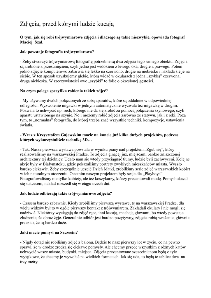 Zdjęcia, przed którymi ludzie kucają O tym, jak się robi trójwymiarowe zdjęcia i dlaczego są takie niezwykłe, opowiada fotograf Maciej Szal. Jak powstaje fotografia trójwymiarowa? - śeby stworzyć trójwymiarową fotografię potrzebne są dwa zdjęcia tego samego obiektu. Zdjęcia są zrobione z przesunięciem, czyli jedno jest widokiem z lewego oka, drugie z prawego. Potem jedno zdjęcie komputerowo zabarwia się lekko na czerwono, drugie na niebiesko i nakłada się je na siebie. W ten sposób uzyskujemy głębię, którą widać w okularach z jedną „szybką” czerwoną, drugą niebieska. W rzeczywistości owe „szybki” to folie o określonej gęstości. Na czym polega specyfika robienia takich zdjęć? - My uŜywamy dwóch połączonych ze sobą aparatów, które są oddalone w odpowiedniej odległości. Wyzwolenie migawki w jednym automatycznie wyzwala teŜ migawkę w drugim. Pozwala to uchwycić np. ruch, którego nie da się zrobić za pomocą połączenia szynowego, czyli aparatu ustawionego na szynie. No i moŜemy robić zdjęcia zarówno ze statywu, jak i z ręki. Poza tym, to „normalna” fotografia, do której trzeba znać wszystkie techniki, kompozycje, ustawienia światła. - Wraz z Krzysztofem Gajewskim macie na koncie juŜ kilka duŜych projektów, podczas których wykorzystaliście technikę 3D… - Tak. Nasza pierwsza wystawa powstała w wyniku pracy nad projektem „Zgub się”, który realizowaliśmy na warszawskiej Pradze. To zdjęcia ginącej juŜ, miejscami bardzo zniszczonej architektury tej dzielnicy. Udało nam się wtedy przyciągnąć tłumy, ludzie byli zachwyceni. Kolejne akcje były w Białymstoku, gdzie pokazaliśmy portrety zwykłych mieszkańców miasta. Wyszło bardzo ciekawie. śeby szczególnie uczcić Dzień Matki, zrobiliśmy serie zdjęć warszawskich kobiet w ich naturalnym otoczeniu. Ostatnim naszym projektem były sesje dla „Playboya”. Fotografowaliśmy nie tylko kobiety, ale teŜ koszykarzy, którzy prezentowali modę. Pomysł okazał się sukcesem, nakład rozszedł się w ciągu trzech dni. Jak ludzie odbierają takie trójwymiarowe zdjęcia? - Czasem bardzo zabawnie. Kiedy zrobiliśmy pierwszą wystawę, tę na warszawskiej Pradze, dla wielu widzów był to w ogóle pierwszy kontakt z trójwymiarem. Zakładali okulary i nie mogli się nadziwić. Niektórzy wyciągają do zdjęć ręce, inni kucają, machają głowami, bo wtedy powstaje złudzenie, Ŝe obraz Ŝyje. Generalnie odbiór jest bardzo pozytywny, zdjęcia robią wraŜenie, głównie przez to, Ŝe są bardzo duŜe. Jaki macie pomysł na Szczecin? - Nigdy dotąd nie robiliśmy zdjęć z balonu. Będzie to nasz pierwszy lot w Ŝyciu, co na pewno sprawi, Ŝe w drodze zrodzą się ciekawe pomysły. Ale chcemy przede wszystkim z róŜnych kątów uchwycić wasze miasto, budynki, miejsca. Zdjęcia prezentowane szczecinianom będą o tyle wyjątkowe, Ŝe chcemy je wywołać na wielkich formatach. Jak się uda, to będą to tablice dwa na trzy metry.