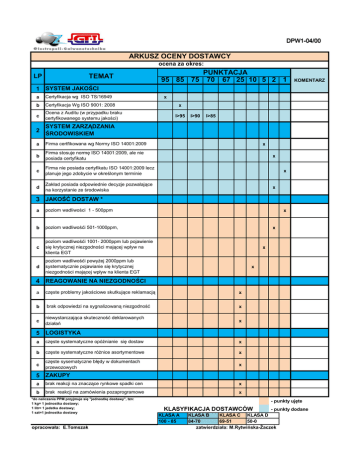 DPW1-04/00 ARKUSZ OCENY DOSTAWCY ocena za okres: TEMAT LP 95 85 75 PUNKTACJA 70 67 25 10 5 2 1 KOMENTARZ 1 SYSTEM JAKOŚCI a Certyfikacja wg ISO TS/16949 b Certyfikacja Wg ISO 9001: 2008 c Ocena z Auditu (w przypadku braku certyfikowanego systemu jakości) 2 SYSTEM ZARZĄDZANIA ŚRODOWISKIEM a Firma certfikowana wg Normy ISO 14001:2009 b Firma stosuje normę ISO 14001:2009, ale nie posiada certyfikatu c Firma nie posiada certyfikatu ISO 14001:2009 lecz planuje jego zdobycie w określonym terminie d Zakład posiada odpowiednie decyzje pozwalające na korzystanie ze środowiska x x I>95 I>90 I>85 x x x x 3 JAKOŚĆ DOSTAW * a poziom wadliwości 1 - 500ppm b poziom wadliwośći 501-1000ppm, c poziom wadliwośći 1001- 2000ppm lub pojawienie się krytycznej niezgodności mającej wpływ na klienta EGT d poziom wadliwośći powyżej 2000ppm lub systematycznie pojawianie się krytycznej niezgodności mającej wpływ na klienta EGT x x x x 4 REAGOWANIE NA NIEZGODNOŚCI a częste problemy jakościowe skutkujące reklamacją x b brak odpowiedzi na sygnalizowaną niezgodność x c niewystarczająca skuteczność deklarowanych działań x 5 LOGISTYKA a częste systematyczne opóźnianie się dostaw x b częste systematyczne różnice asortymentowe x c częste sysematyczne błędy w dokumentach przewozowych x 5 ZAKUPY a brak reakcji na znaczące rynkowe spadki cen x b brak reakcji na zamówienia pozaprogramowe x *do naliczania PPM przyjmuje się "jednostkę dostawy", tzn: 1 kg= 1 jednostka dostawy; 1 litr= 1 jedstka dostawy; 1 szt=1 jednostka dostawy opracowała: E.Tomszak - punkty ujęte KLASYFIKACJA DOSTAWCÓW KLASA A 100 - 85 - punkty dodane KLASA B KLASA C KLASA D 84-70 69-51 50-0 zatwierdziała: M.Rytwińska-Żaczek