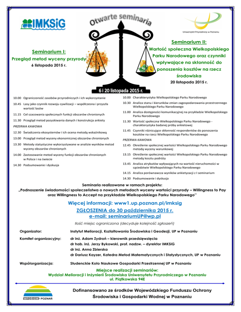 Seminarium II: Wartość społeczna Wielkopolskiego Seminarium I: Parku Narodowego oraz czynniki Przegląd metod wyceny przyrody wpływające na skłonność do 6 listopada 2015 r. ponoszenia kosztów na rzecz środowiska 20 listopada 2015 r. 10.00 Ograniczoność zasobów przyrodniczych i ich wykorzystanie 10.00 Charakterystyka Wielkopolskiego Parku Narodowego 10.45 Lasy jako czynnik rozwoju cywilizacji – współczesna i przyszła wartość lasów 10.30 Analiza stanu i kierunków zmian zagospodarowania przestrzennego Wielkopolskiego Parku Narodowego 11.15 Cel szacowania społecznych funkcji obszarów chronionych 11.00 Analiza dostępności komunikacyjnej na przykładzie Wielkopolskiego Parku Narodowego 11.30 Przegląd metod pozyskiwania danych i konstrukcja ankiety PRZERWA KAWOWA 11.30 Wartość społeczna Wielkopolskiego Parku Narodowego charakterystyka badanej próby ankietowej 12.30 Świadczenia ekosystemów i ich ocena metodą wskaźnikową 11.45 Czynniki różnicujące skłonność respondentów do ponoszenia kosztów na rzecz Wielkopolskiego Parku Narodowego 13.00 Przegląd metod wyceny ekonomicznej obszarów chronionych PRZERWA KAWOWA 13.30 Metody statystyczne wykorzystywane w analizie wyników metod wyceny obszarów chronionych 12.45 Określenie społecznej wartości Wielkopolskiego Parku Narodowego metodą wyceny warunkowej 14.00 Zastosowanie metod wyceny funkcji obszarów chronionych w Polsce i na świecie 13.15 Określenie społecznej wartości Wielkopolskiego Parku Narodowego metodą kosztu podróży 14.30 Podsumowanie i dyskusja 13.45 Analiza atrybutów wpływających na wartość nieruchomości w sąsiedztwie Wielkopolskiego Parku Narodowego 14.15 Analiza porównawcza wyników ankietyzacji z I seminarium 14.30 Podsumowanie i dyskusja Seminaria realizowane w ramach projektu: „Podnoszenie świadomości społeczeństwa o nowych metodach wyceny wartości przyrody – Willingness to Pay oraz Willingness to Accept na przykładzie Wielkopolskiego Parku Narodowego’’ Więcej informacji: www1.up.poznan.pl/imksig ZGŁOSZENIA do 30 października 2015 r. e-mail: [email protected] Ilość miejsc ograniczona (decyduje kolejność zgłoszeń) Organizator: Instytut Melioracji, Kształtowania Środowiska i Geodezji, UP w Poznaniu Komitet organizacyjny: dr inż. Adam Zydroń – kierownik przedsięwzięcia dr hab. inż. Jerzy Bykowski, prof. nadzw. – dyrektor IMKSiG dr inż. Anna Zbierska dr Dariusz Kayzer, Katedra Metod Matematycznych i Statystycznych, UP w Poznaniu Współorganizacja: Studenckie Koło Naukowe Gospodarki Przestrzennej UP w Poznaniu Miejsce realizacji seminariów: Wydział Melioracji i Inżynierii Środowiska Uniwersytetu Przyrodniczego w Poznaniu ul. Piątkowska 94E Dofinansowano ze środków Wojewódzkiego Funduszu Ochrony Środowiska i Gospodarki Wodnej w Poznaniu