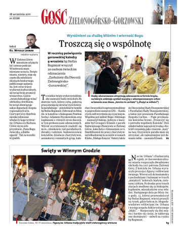 18 września 2011 nr /1 Wyróżnieni za służbę bliźnim i wierność Bogu Troszczą się o wspólnotę tekst Ks. WitOld Lesner W Zielonej Górze mieszkam od pięciu lat i zawsze podczas Winobrania mam mieszane uczucia. Święto miasta, niestety, staje się często dla młodzieży okazją do bezkarnego, publicznego upijania się. Jest coraz więcej wydarzeń kulturalnych, ale wciąż brak promocji winiarstwa. Goście „święta lubuskiego wina” odchodzą z kwitkiem, bo wciąż obowiązuje zakaz degustacji i kupna regionalnych win. Czary goryczy dopełnia niezdecydowanie włodarzy kogo wybrać: św. Urbana czy Bachusa. Ciśnie się na usta przysłowie „Panu Bogu świeczka, a diabłu ogarek”. Tak na wszelki wypadek. T o wielkie święto wykorzystaliśmy, aby zauważyć ludzi świeckich. By dostrzec tych, którzy cichą, pokorną pracą starają się ożywiać życie kościoła parafialnego – powiedział w homilii bp Stefan Regmunt. Clebrował on Mszę św. w katedrze z biskupami Pawłem Sochą i Adamem Dyczkowskim oraz kapłanami z różnych stron diecezji, w tym proboszczami odznaczonych. Wśród wyróżnionych znaleźli się m.in. członkowie rad parafialnych, doradcy rodzinni, budowniczowie kościołów, działacze charytatywni, animatorzy rozmaitych grup, kate- krzysztof król W rocznicę poświęcenia gorzowskiej katedry 9 września bp Stefan Regmunt wręczył 20 osobom świeckim odznaczenia „Zasłużony dla Diecezji Zielonogórsko-Gorzowskiej”. redaktor wydania Osoby uhonorowane otrzymują odznaczenie w formie krzyża, na którym widnieje symbol maryjny z wkomponowanym orłem w koronie oraz słowa „Servire in caritate” („Służyć w miłości”) checi (wszystkich zaprezentowaliśmy w poprzednim numerze GN). – Każda z tych osób wyróżnia się czym innym. Wspólna jest miłość Boga i bliźniego – zauważył biskup. Jednym z laureatów był Grzegorz Klimek z parafii Najświętszego Zbawiciela w Zielonej Górze, katecheta z Gimnazjum nr 6. Zmobilizował do pracy charytatywnej kilkudziesięciu uczniów w ramach Klubu „Małego Księcia”. Należy także Święty w Winnym Grodzie do Diecezjalnej Rady Duszpasterskiej i Parafialnej Rady Duszpasterskiej, a także jest prezesem Parafialnego Zespołu Caritas. – Piąte przykazanie kościelne brzmi: „Troszczyć się o potrzeby wspólnoty Kościoła”. Dziś młodzi ludzie najczęściej troskę o Kościół rozumieją jako rzucenie „kasy” na tacę. Oczywiście parafia musi się utrzymać, ale najważniejsze jest dawanie siebie – zauważa Klimek. kk „N kAtArzynA GAuzA ZielOna GÓra, 10–11 WrzeŚnia. Figurę św. Urbana tradycyjnie nieśli zielonogórscy winiarze kg 18 września 2011 gość niedzielny oc św. Urbana” z Eucharystią o godz. 20 i korowodem ulicami miasta rozpoczęła dwudniowe obchody ku czci patrona Zielonej Góry. Z kościoła św. Urbana wyruszyła procesja z figurą i relikwiami świętego. Wierni szli do konkatedry z pochodniami i balonami w trzech „miejskich” kolorach: białym, zielonym i żółtym. Po drodze przy trzech stacjach modlono się za biskupów, kapłanów, mieszkańców oraz władze. Następnego dnia po Mszy św. o godz. 12, której przewodniczył bp Stefan Regmunt, wierni przeszli na rynek, gdzie było m.in. błogosławieństwo relikwiami św. Urbana i występ zespołu folklorystycznego „Maki”. – Rozpoczęły się dni miasta i bardzo się cieszę, że nabierają one dostojności – mówił na rynku bp Regmunt. gość zielonogórsko-gorzowski Spotkanie z Muzami Imieniny Matki Bożej Anna Iwanowska Żagań. Strzelanie z łuku, warsztaty plastyczne, loteria pod fantowa, pokaz patronatem sprzętu wojskowe- „Gościa” go i dmuchane zjeżdżalnie dla dzieci – to kilka z wielu atrakcji „IV Parafialnego Spotkania z Muzami”, które odbyło się 11 września na placu przy dawnym szpitalu św. Doroty. Festyn, zorganizowany przez parafię Krzyża Świętego, to czas dobrej zabawy, ale także wsparcie renowacji zabytku. – Chcemy zebrać pieniądze na remont części muru, który przynależał do kościoła filialnego Krzyża Świętego – mówił ks. Grzegorz Polowczyk, miejscowy proboszcz. Podczas pikniku wystąpiły dzieci i młodzież z żagańskiej szkoły muzycznej, zespoły ludowe „Złote Łany” i „Jodełki” oraz Chór „Oktawa”. – Moja córka miała dziś występ, dlatego tu jestem. My bawimy się dobrze, ale dzieci, rewelacyj- Pomysłów na konkursy był sporo. Dużym powodzeniem cieszył się „rzut teściem i teściową” Brójce. Liturgiczne wspomnienie Imienia Maryi – taki tytuł ma miejscowa parafia – było okazją, by 11 września przygotować festyn. – Chcemy zintegrować naszą społeczność i zebrać fundusze na remont XII-wiecznego kościoła – mówi proboszcz ks. Paweł Bryk. W samo południe była Msza św., a po niej koncerty, gry i zabawy. Występował m.in. zespół cygański, były skoki w dmuchanych zamkach czy „wyścigi rumaków”. – To bieg z przeszkodami. Tata brał na barana dziecko i biegł do mety – śmieje się proboszcz. O 18 rozpoczęło się nabożeństwo maryjne, a po nim była zabawa taneczna. Przygotowano loterię, w której główną nagrodą była wycieczka luksusową limuzyną. – Już kawałek jechałam. Fajna jest. Z mężem, synem i jego rodziną wybierzemy się kiedyś do Zielonej Góry – cieszy się Maria Drzymała. wl Katarzyna Gauza II – Żeby się uwolnić trzeba znać „magiczne” słowa: „przepraszam” czy „proszę” – mówił kasztelan Janusz Gruszkowski z Bractwa Rycerskiego Ziemi Bobrzańsko-Nadodrzańskiej nie – uśmiecha się Anna Augustyn z Żagania. kg Jak minął rok w ruchu Muzyka z wyższej półki Katarzyna Gauza go świata, zawitał i do nas – dodał gospodarz miejsca. Koncert „Skarby renesansu” obejmował utwory m.in. takich XV- i XVI-wiecznych kompozytorów jak: Jacobus Clemans non Papa, Nicolas Gombert czy Orlando Gibbons. – Stile Antico