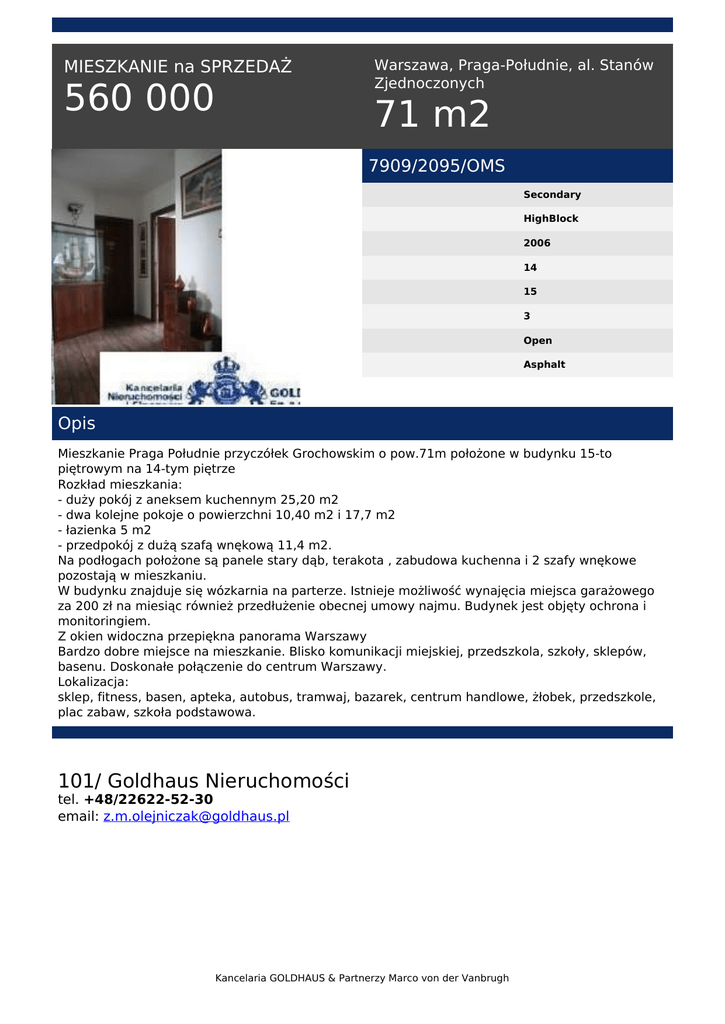 MIESZKANIE na SPRZEDAŻ 560 000 Warszawa, Praga-Południe, al. Stanów Zjednoczonych 71 m2 7909/2095/OMS Secondary HighBlock 2006 14 15 3 Open Asphalt Opis Mieszkanie Praga Południe przyczółek Grochowskim o pow.71m położone w budynku 15-to piętrowym na 14-tym piętrze Rozkład mieszkania: - duży pokój z aneksem kuchennym 25,20 m2 - dwa kolejne pokoje o powierzchni 10,40 m2 i 17,7 m2 - łazienka 5 m2 - przedpokój z dużą szafą wnękową 11,4 m2. Na podłogach położone są panele stary dąb, terakota , zabudowa kuchenna i 2 szafy wnękowe pozostają w mieszkaniu. W budynku znajduje się wózkarnia na parterze. Istnieje możliwość wynajęcia miejsca garażowego za 200 zł na miesiąc również przedłużenie obecnej umowy najmu. Budynek jest objęty ochrona i monitoringiem. Z okien widoczna przepiękna panorama Warszawy Bardzo dobre miejsce na mieszkanie. Blisko komunikacji miejskiej, przedszkola, szkoły, sklepów, basenu. Doskonałe połączenie do centrum Warszawy. Lokalizacja: sklep, fitness, basen, apteka, autobus, tramwaj, bazarek, centrum handlowe, żłobek, przedszkole, plac zabaw, szkoła podstawowa. 101/ Goldhaus Nieruchomości tel. +48/22622-52-30 email: [email protected] Kancelaria GOLDHAUS & Partnerzy Marco von der Vanbrugh Powered by TCPDF (www.tcpdf.org)