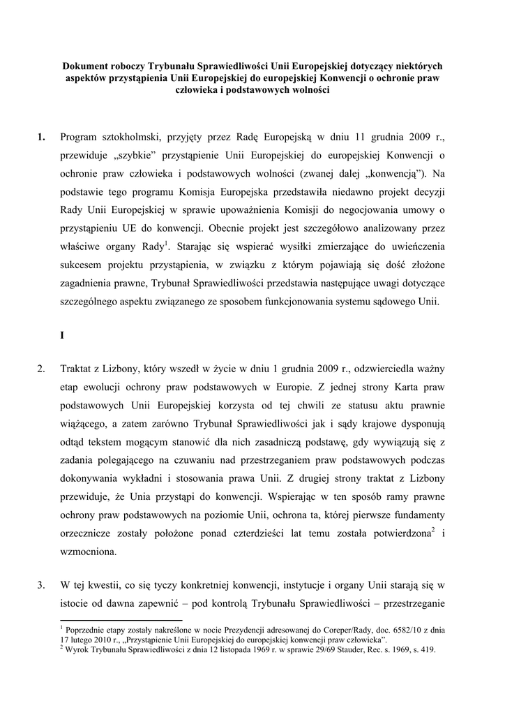 Dokument roboczy Trybunału Sprawiedliwości Unii Europejskiej dotyczący niektórych aspektów przystąpienia Unii Europejskiej do europejskiej Konwencji o ochronie praw człowieka i podstawowych wolności 1. Program sztokholmski, przyjęty przez Radę Europejską w dniu 11 grudnia 2009 r., przewiduje „szybkie” przystąpienie Unii Europejskiej do europejskiej Konwencji o ochronie praw człowieka i podstawowych wolności (zwanej dalej „konwencją”). Na podstawie tego programu Komisja Europejska przedstawiła niedawno projekt decyzji Rady Unii Europejskiej w sprawie upoważnienia Komisji do negocjowania umowy o przystąpieniu UE do konwencji. Obecnie projekt jest szczegółowo analizowany przez właściwe organy Rady1. Starając się wspierać wysiłki zmierzające do uwieńczenia sukcesem projektu przystąpienia, w związku z którym pojawiają się dość złożone zagadnienia prawne, Trybunał Sprawiedliwości przedstawia następujące uwagi dotyczące szczególnego aspektu związanego ze sposobem funkcjonowania systemu sądowego Unii. I 2. Traktat z Lizbony, który wszedł w życie w dniu 1 grudnia 2009 r., odzwierciedla ważny etap ewolucji ochrony praw podstawowych w Europie. Z jednej strony Karta praw podstawowych Unii Europejskiej korzysta od tej chwili ze statusu aktu prawnie wiążącego, a zatem zarówno Trybunał Sprawiedliwości jak i sądy krajowe dysponują odtąd tekstem mogącym stanowić dla nich zasadniczą podstawę, gdy wywiązują się z zadania polegającego na czuwaniu nad przestrzeganiem praw podstawowych podczas dokonywania wykładni i stosowania prawa Unii. Z drugiej strony traktat z Lizbony przewiduje, że Unia przystąpi do konwencji. Wspierając w ten sposób ramy prawne ochrony praw podstawowych na poziomie Unii, ochrona ta, której pierwsze fundamenty orzecznicze zostały położone ponad czterdzieści lat temu została potwierdzona2 i wzmocniona. 3. W tej kwestii, co się tyczy konkretniej konwencji, instytucje i organy Unii starają się w istocie od dawna zapewnić – pod kontrolą Trybunału Sprawiedliwości – przestrzeganie 1 Poprzednie etapy zostały nakreślone w nocie Prezydencji adresowanej do Coreper/Rady, doc. 6582/10 z dnia 17 lutego 2010 r., „Przystąpienie Unii Europejskiej do europejskiej konwencji praw człowieka”. 2 Wyrok Trybunału Sprawiedliwości z dnia 12 listopada 1969 r. w sprawie 29/69 Stauder, Rec. s. 1969, s. 419. praw człowieka gwarantowanych w konwencji, i to mimo braku wprost wyrażonego obowiązku. Trybunał Sprawiedliwości, o czym świadczy jego orzecznictwo, systematycznie stosuje konwencję, a w ostatnich latach coraz wyraźniej odnosi się w tym kontekście do orzecznictwa Europejskiego Trybunału Praw Człowieka. Spowodowało to uznanie przez ETPC, wobec istnienia równoważnej ochrony praw człowieka w prawie Unii, domniemania zgodności z konwencją w określonych okolicznościach (orzecznictwo Bosphorus)3. II 4. Przystąpienie Unii, jako organizacji integracji regionalnej, podlega szczególnym warunkom, innym niż przewidziane są w przypadku przystąpienia państwa. Zgodnie bowiem z art. 6 TUE przystąpienie „nie ma wpływu na kompetencje Unii określone w traktatach”4, a zgodnie z jednym z protokołów załączonych do traktatów i tym mającym tę samą moc co traktaty, umowa dotycząca przystąpienia „musi odzwierciedlać konieczność zachowania szczególnych cech Unii i prawa Unii”5. 5. Pośród szczególnych cech Unii i jej porządku prawnego znajduje się i ta, zgodnie z którą działanie Unii co do zasady wywołuje skutki wobec jednostek jedynie za pośrednictwem krajowych środków mających na celu jego wykonanie lub stosowanie. I tak, aby uzyskać ochronę swych praw podstawowych względem działania Unii, jednostki powinny zwykle zwracać się do organów krajowych, w szczególności do sądów państw członkowskich. Jeżeli w konkretnym wypadku jednostka nie będzie zadowolona z udzielonej jej ochrony, może – po wyczerpaniu środków odwoławczych istniejących w prawie krajowym – wnieść skargę przeciwko danemu państwu członkowskiemu do Europejskiego Trybunału Praw Człowieka. Czyniąc to, jednostki mogą pośrednio skarżyć działanie Unii poprzez kwestionowanie krajowych środków mających na celu jego wykonanie lub stosowanie. 6. W perspektywie przystąpienia Unii do konwencji ta cecha szczególna systemu sądowniczego Unii powinna być postrzegana w kontekście zasad regulujących 3 Wyrok ETPC w sprawie nr 45036/98 Bosphorus Hava Yolları Turizm ve Ticaret Anonim Şirketi (Bosphorus Airways) przeciwko Irlandii [GC], ETPC 2005-VI 4 Art. 6 ust. 2 TUE 5 Protokół (nr 8) dotyczący artykułu 6 ustęp 2 Traktatu o Unii Europejskiej w sprawie przystąpienia Unii do europejskiej Konwencji o ochronie praw człowieka i podstawowych wolności (zwany dalej „protokołem nr 8”) funkcjonowanie mechanizmów kontroli wprowadzonych konwencją, w szczególności w kontekście zasady subsydiarności. Zgodnie z tą zasadą zadaniem państw, które ratyfikowały konwencję, jest zapewnienie przestrzegania ustanowionych w niej praw na poziomie krajowym, a zadaniem Europejskiego Trybunału Praw Człowieka – ustalanie, czy państwa te rzeczywiście wywiązały się ze swoich zobowiązań. W pierwszej kolejności to do organów i sądów krajowych należy zatem zapobieganie lub, ewentualnie, zbadanie i ukaranie naruszeń Konwencji6. 7. Na podstawie zasady subsydiarności oraz w celu zapewnienia jej wdrożenia w ramach przygotowań do przystąpienia Unia powinna upewnić się, że – w odniesieniu do jej działania mogącego stać się przedmiotem skargi do Europejskiego Trybunału Praw Człowieka – kontrolę zewnętrzną ze strony organów Konwencji będzie mogła poprzedzać skuteczna kontrola wewnętrzna ze strony sądów państw członkowskich lub sądów Unii. III 8. Zadaniem Trybunału Sprawiedliwości, w ramach systemu sądowniczego Unii ustanowionego w traktatach, jest z
