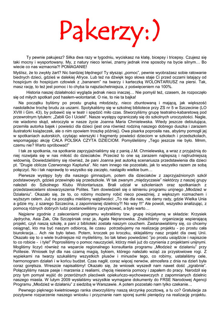 Pakerzy:) Ty pewnie pakujesz? Siłka dwa razy w tygodniu, wyciskasz na klatę, bicepsy i tricepsy. Czujesz się taki mocny i wysportowany. My, z natury nieco leniwi, znamy jednak inne sposoby na bycie silnym… Bo wiecie co nas wzmacnia?! POMAGANIE! Myślisz, że to zwykły żart? Nic bardziej błędnego! Ty słysząc „pomoc”, pewnie wyobrażasz sobie ratowanie biednych dzieci, gdzieś w dalekiej Afryce. Lub też na dźwięk tego słowa staje Ci przed oczami latający od hospicjum do hospicjum człowiek z „bananem” na twarzy i karteczką WOLONTARIUSZ na piersi. Tak, masz rację, to też jest pomoc i to chyba ta najszlachetniejsza, z poświęceniem na 100%. Historia naszej działalności wygląda jednak nieco inaczej… Nie pomyśl też, czasem, że rozpoczęło się od miłych spotkań pod hasłem-wolontariat. O nie, to nie ta bajka! Na początku byliśmy po prostu grupką młodzieży, nieco zbuntowaną i mającą, jak większość nastolatków trochę brudu za uszami. Spotykaliśmy się w szkolnej bibliotece przy ZS nr 5 w Szczecinie (LO XVIII i Gim. 43), by pobawić się w teatr i spędzić miło czas. Stworzyliśmy grupę teatralno-kabaretową pod przewrotnym tytułem: „Zabili Go I Uciekł”. Nasze występy ograniczały się do szkolnych uroczystości. Nagle, nie wiadomo skąd, wkroczyła w nasze życie Joanna Maria Chmielewska. Wtedy jeszcze debiutująca, przemiła autorka bajek i powieści dla dzieci (jest ona również rodziną naszego dobrego duszka i zarazem ilustratorki książeczek, ale o nim opowiem troszkę później). Owa pisarka poprosiła nas, abyśmy pomogli jej w spotkaniach autorskich, czytając wierszyki i fragmenty powieści dzieciom w szkołach i przedszkolach, wspomagając akcję CAŁA POLSKA CZYTA DZIECIOM. Pomyśleliśmy „Tego jeszcze nie było. Mmm, czemu nie? Warto spróbować!” I tak ze spotkania, na spotkanie zaprzyjaźnialiśmy się z panią J.M. Chmielewską, a wraz z przyjaźnią do niej rozwijała się w nas miłość do dzieciaków. Przecież to one są zarazem najlepszą i najtrudniejszą widownią. Dowiedzieliśmy się również, że pani Joanna jest autorką scenariusza przedstawienia dla dzieci pt. ”Drugie oblicze Czerwonego Kapturka”. Nic nam innego nie pozostało, jak to wszystko razem ze sobą połączyć. No i tak naprawdę to wszystko się zaczęło, nastąpiło wielkie bum… Pierwsze występy były dla naszego gimnazjum, potem dla dzieciaków z zaprzyjaźnionych szkół podstawowych, gdzieś przewinęło się przedszkole. W tak zwanym „międzyczasie” niektórzy z naszej grupy należeli do Szkolnego Klubu Wolontariusza. Brali udział w szkoleniach oraz spotkaniach z przedstawicielami stowarzyszenia Polites. Tam dowiedzieli się o istnieniu programu unijnego „Młodzież w Działaniu”. Okazało się, że to, co robimy możemy robić nieco poważniej, z większym rozmachem i wyższym celem. Już na początku mieliśmy wątpliwości: „To nie dla nas, nie damy rady, gdzie Wielka Unia a gdzie my, z szarego Szczecina, z zapomnianej dzielnicy?! No way !!!” Ale powoli, wszystko analizując, z pomocą różnych dobrych ludzi postanowiliśmy zaryzykować, a było warto… Najpierw zgodnie z zaleceniami programu wybraliśmy tzw. grupę inicjatywną w składzie: Krzysiek Jędrycha, Asia Żak, Ola Szczęśniak oraz ja, Agata Nejranowska. Znaleźliśmy organizację wspierającą projekt, czyli naszą szkołę, a pani z biblioteki została naszym couchem. Zastanawialiśmy się, co chcemy osiągnąć, kto ma być naszym odbiorcą, ile czasu potrzebujemy na realizację projektu - po prostu cała biurokracja… Ach nie było łatwo. Potem, kroczek po kroczku, sklejaliśmy nasz projekt dla owej Unii. Okazało się to o wiele trudniejsze niż myśleliśmy, bo tak łatwo powiedzieć ”po prostu usiądźcie i napiszcie to co robicie - i tyle!” Poprosiliśmy o pomoc nauczycieli, którzy mieli już do czynienia z projektami unijnymi. Mogliśmy liczyć również na wsparcie regionalnego konsultanta programu „Młodzież w działaniu” przy Politesie. Wniosek był dla nas czarną magią, bykiem, którego należało wziąć za przysłowiowe rogi. Z wypiekami na twarzy szukaliśmy wszystkich plusów i minusów tego, co robimy, ustalaliśmy cele, harmonogram działań i w końcu budżet. Czas naglił, coraz więcej nerwów, atmosfera z dnia na dzień była coraz gorętsza. Wreszcie napisaliśmy! Okazało się, że wniosek wyszedł nam nawet dość „zgrabnie”. Połączyliśmy nasze pasje i marzenia z realiami, chęcią niesienia pomocy i zapałem do pracy. Narodził się przy tym pomysł wyjść do przeróżnych placówek opiekuńczo-wychowawczych z zapomnianych dzielnic naszego miasta. W lutym 2009 wysłaliśmy wszystkie wymagane dokumenty do FRSE Narodowej Agencji Programu „Młodzież w działaniu” z siedzibą w Warszawie. A potem pozostało nam tylko czekanie… Pewnego pięknego kwietniowego ranka otworzyliśmy naszą skrzynkę pocztową, a tu co? Gratulacje za pozytywne rozparzenie naszego wniosku i przyznanie nam sporej sumki pieniędzy na realizację projektu. Po fanfarach i dzikich okrzykach radości przyszedł czas na poważne rozmowy i planowanie naszych działań. Z początkiem września 2009 roku, po wstępnych przygotowaniach, wystartował nasz projekt o bajkowym tytule: „W krainie książkowej wróżki”. I tak mamy marzec 2010. Projekt idzie pełną parą! Dołączyło do nas kilkanaście nowych osób. Mamy przepiękne stroje, oryginalne dekoracje, autorski scenariusz przedstawienia „Śnieżka i 7 dni” naszej koleżanki, zakładki, koszulki z bajkowym logo i własną mini książeczkę z poradami książkowej wróżki. Jesteśmy po warsztatach z profesjonalistami, próbach, występach i wielkich zakupach. Często dopadają nas wątpliwości typu - wyspać się, czy pracować nad projektem? Nie są nam obce również kłótnie, straty w ludziach, faktury, rachunki, listy do Agencji, ankiety, raporty, ograniczeni