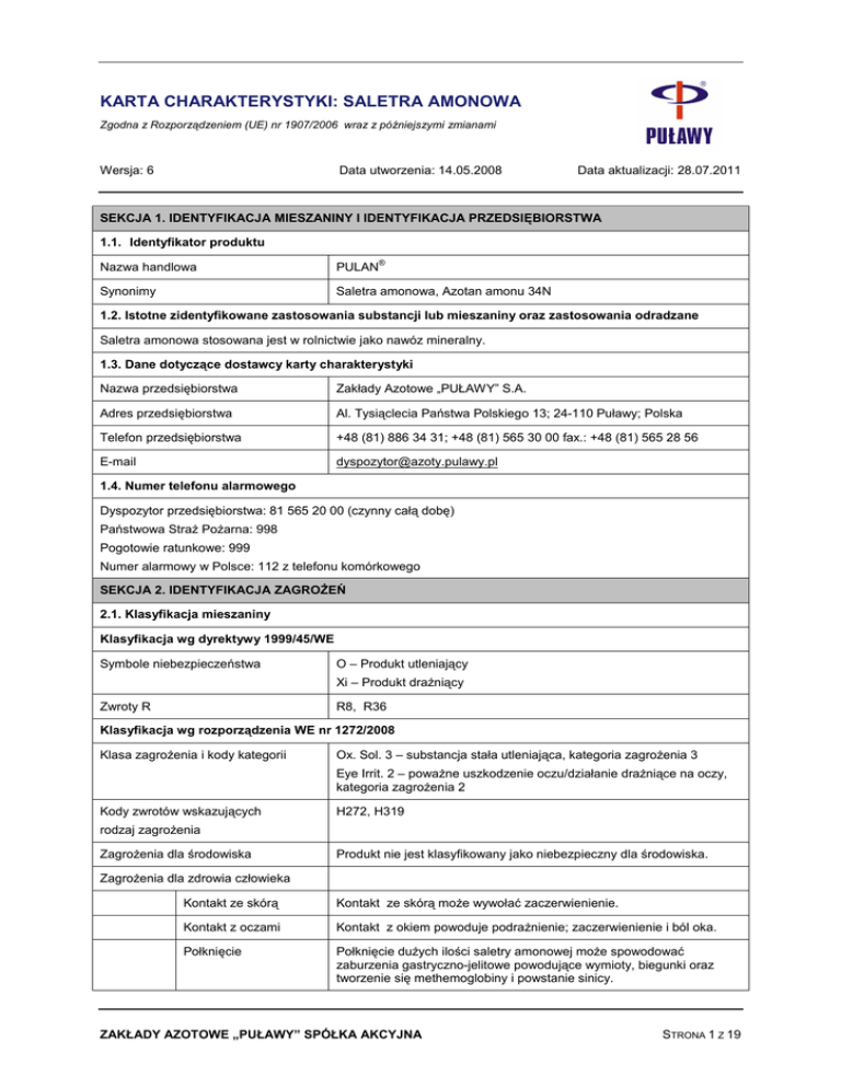 KARTA CHARAKTERYSTYKI: SALETRA AMONOWA Zgodna z Rozporządzeniem (UE) nr 1907/2006 wraz z późniejszymi zmianami Wersja: 6 Data utworzenia: 14.05.2008 Data aktualizacji: 28.07.2011 SEKCJA 1. IDENTYFIKACJA MIESZANINY I IDENTYFIKACJA PRZEDSIĘBIORSTWA 1.1. Identyfikator produktu ® Nazwa handlowa PULAN Synonimy Saletra amonowa, Azotan amonu 34N 1.2. Istotne zidentyfikowane zastosowania substancji lub mieszaniny oraz zastosowania odradzane Saletra amonowa stosowana jest w rolnictwie jako nawóz mineralny. 1.3. Dane dotyczące dostawcy karty charakterystyki Nazwa przedsiębiorstwa Zakłady Azotowe „PUŁAWY” S.A. Adres przedsiębiorstwa Al. Tysiąclecia Państwa Polskiego 13; 24-110 Puławy; Polska Telefon przedsiębiorstwa +48 (81) 886 34 31; +48 (81) 565 30 00 fax.: +48 (81) 565 28 56 E-mail [email protected] 1.4. Numer telefonu alarmowego Dyspozytor przedsiębiorstwa: 81 565 20 00 (czynny całą dobę) Państwowa Straż Pożarna: 998 Pogotowie ratunkowe: 999 Numer alarmowy w Polsce: 112 z telefonu komórkowego SEKCJA 2. IDENTYFIKACJA ZAGROŻEŃ 2.1. Klasyfikacja mieszaniny Klasyfikacja wg dyrektywy 1999/45/WE Symbole niebezpieczeństwa O – Produkt utleniający Xi – Produkt drażniący Zwroty R R8, R36 Klasyfikacja wg rozporządzenia WE nr 1272/2008 Klasa zagrożenia i kody kategorii Ox. Sol. 3 – substancja stała utleniająca, kategoria zagrożenia 3 Eye Irrit. 2 – poważne uszkodzenie oczu/działanie drażniące na oczy, kategoria zagrożenia 2 Kody zwrotów wskazujących H272, H319 rodzaj zagrożenia Zagrożenia dla środowiska Produkt nie jest klasyfikowany jako niebezpieczny dla środowiska. Zagrożenia dla zdrowia człowieka Kontakt ze skórą Kontakt ze skórą może wywołać zaczerwienienie. Kontakt z oczami Kontakt z okiem powoduje podrażnienie; zaczerwienienie i ból oka. Połknięcie Połknięcie dużych ilości saletry amonowej może spowodować zaburzenia gastryczno-jelitowe powodujące wymioty, biegunki oraz tworzenie się methemoglobiny i powstanie sinicy. ZAKŁADY AZOTOWE „PUŁAWY” SPÓŁKA AKCYJNA STRONA 1 Z 19 KARTA CHARAKTERYSTYKI: CHARAKTERYSTYKI SALETRA AMONOWA Zgodna z Rozporządzeniem dzeniem (UE) nr 1907/2006 wraz z późniejszymi zmianami Wersja: 6 Data utworzenia: 14.05.2008 Data aktualizacji: 28.07.2011 Wdychanie W postaci aerozolu lub pyłu o dużych stężeniach ężeniach może mo wywołać łzawienie oczu, kaszel, uczucie duszności. ści. Istnieje ryzyko wystąpienia wyst methemoglobinemii, arytmii serca, bole głowy, spadku ciśnienia ci krwi. Efekty długoterminowe W kilka godzin po zatruciu drogą pokarmową ą może moż wystąpić sinoniebieskie zabarwienie warg, paznokci, skóry wskutek methemoglobinemii. Zagrożenia związane z właściwościami ś ściami fizykochemicznymi Azotan amonowy jest produktem niepalnym, niemniej jednak wzmaga palność innych substancji. W temperaturach wyższych wyż niż temperatura topnienia (patrz pkt. 9.1.) czysty azotan amonu ulega rozkładowi. W zamkniętych przestrzeniach rozkład może że prowadzi prowadzić do wybuchu. Substancje wymienione w pkt.10.5 katalizują ą rozkład zwi zwiększając zagrożenie pożarowo-wybuchowe. Podczas pożaru żaru z udziałem udział azotanu amonu powstają toksyczne produkty rozkładu: NOx, NH3. 2.2. Elementy oznakowania Piktogram GHS03 Hasło ostrzegawcze Zwroty H GHS07 Uwaga H272: Może intensyfikować pożar; utleniacz H319: Działa drażniąco na oczy. Zwroty P P210: Przechowywać z dala od źródeł ródeł ciepła/iskrzenia/otwartego ognia/gorących powierzchni. – Palenie wzbronione. P221: Zastosować wszelkie środki ostrożności ż ści w celu uniknięcia unikni mieszania z innymi materiałami zapalnymi. P280: Stosować rękawice ochronne/odzież ochronn onną/ochronę oczu/ochronę twarzy. P305 + P351 + P338: W PRZYPADKU DOSTANIA SIĘ SI DO OCZU: Ostrożnie płukać wodą przez kilka minut. Wyjąć Wyj soczewki kontaktowe, jeżeli są i można na je łatwo usunąć usunąć. P337 + P313: W przypadku utrzymywania się ę działania dra drażniącego na oczy: Zasięgnąć porady/zgłosić się ę pod opiekę opiek lekarza. 2.3. Inne zagrożenia Saletra Amonowa nie spełnia kryteriów PBT ani vPvB. SEKCJA 3. SKŁAD/INFORMACJA O SKŁADNIKACH 3.1. Substancje Nie dotyczy 3.2. Mieszaniny Identyfikator produktu ® PULAN Klasyfikacja składników wg dyrektywy 67/548/EWG ZAKŁADY AZOTOWE „PUŁAWY” SPÓŁKA AKCYJNA STRONA 2 Z 19 KARTA CHARAKTERYSTYKI: SALETRA AMONOWA Zgodna z Rozporządzeniem (UE) nr 1907/2006 wraz z późniejszymi zmianami Wersja: 6 Data utworzenia: 14.05.2008 Data aktualizacji: 28.07.2011 Nazwa składnika Stężenie Nr WE Nr rejestracji Symbole zagrożenia Zwroty R Azotan (V) amonu ≥ 98% 229-347-8 01-2119490981-27-0025 O; Xi R8; R36 Azotan (V) magnezu ≤ 2% 233-826-7 01-2119491164-38-0008 O R8 Klasyfikacja składników wg Rozporządzenia (WE) 1272/2008 Nazwa składnika Stężenie Nr WE Nr rejestracji Azotan (V) amonu ≥ 98% 229-347-8 01-2119490981-27-0025 Azotan (V) magnezu ≤ 2% 233-826-7 01-2119491164-38-0008 Klasy zagrożenia i kody kategorii Zwroty H Oxid. Solid 3 H272 Eye Irrit. 2 H319 Oxid. Solid 3 H272 Eye Irrit. 2 H319 Pełne brzmienie zwrotów ryzyka (zwrotów R) oraz zwrotów wskazujących rodzaj zagrożenia (zwrotów H) znajduje się w punkcie 16. SEKCJA 4. ŚRODKI PIERWSZEJ POMOCY 4.1. Opis środków pierwszej pomocy Informacje ogólne Stosować odpowiednią wentylację miejscową i ogólną. Zaleca się wyposażenie miejsca pracy w prysznic oraz myjkę oczu. Inhalacja Usunąć poszkodowanego z miejsca zagrożenia zapewniając dostęp świeżego powietrza. W przypadku wystąpienia objawów zatrucia zapewnić pomoc medyczną. Połknięcie W przypadku spożycia, należy poszkodowanemu podać do picia dużą ilość wody. Nie wywoływać wymiotów. Małe dawki zazwyczaj nie wywołują objawów zatrucia. Spożycie większych ilości nawozu prowadzić może do zaburzeń żołądkowo trawiennych, spadku ciśnienia krwi oraz two