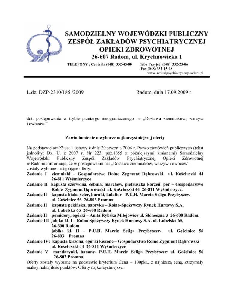 SAMODZIELNY WOJEWÓDZKI PUBLICZNY ZESPÓŁ ZAKŁADÓW PSYCHIATRYCZNEJ OPIEKI ZDROWOTNEJ 26-607 Radom, ul. Krychnowicka 1 TELEFONY : Centrala (048) 332-45-00 L.dz. DZP-2310/185 /2009 Izba Przyjęć (048) 332-23-06 Fax (048) 332-15-08 www.szpitalpsychiatryczny.radom.pl Radom, dnia 17.09.2009 r dot: postępowania w trybie przetargu nieograniczonego na „Dostawa ziemniaków, warzyw i owoców.” Zawiadomienie o wyborze najkorzystniejszej oferty Na podstawie art.92 ust 1 ustawy z dnia 29 stycznia 2004 r. Prawo zamówień publicznych (tekst jednolity: Dz. U. z 2007 r. Nr 223, poz.1655 z późniejszymi zmianami) Samodzielny Wojewódzki Publiczny Zespół Zakładów Psychiatrycznej Opieki Zdrowotnej w Radomiu informuje, że w postępowaniu na: „Dostawa ziemniaków, warzyw i owoców”: zostały wybrane następujące oferty: Zadanie I ziemniaki – Gospodarstwo Rolne Zygmunt Dąbrowski ul. Kościuszki 44 26-811 Wyśmierzyce Zadanie II kapusta czerwona, cebula, marchew, pietruszka korzeń, por – Gospodarstwo Rolne Zygmunt Dąbrowski ul. Kościuszki 44 26-811 Wyśmierzyce. Zadanie II kapusta biała, seler, buraki, kalafior - P.U.H. Marcin Seliga Przybyszew ul. Gościniec 56 26-803 Promna Zadanie II kapusta pekińska, papryka – Rolno-Spożywczy Rynek Hurtowy S.A. ul. Lubelska 65 26-600 Radom Zadanie II pomidory, ogórki – Anita Rybska Milejowice ul. Słoneczna 3 26-600 Radom. Zadanie III jabłka kl. I – Rolno Spożywczy Rynek Hurtowy S.A. ul. Lubelska 65, 26-600 Radom jabłka kl. II – P.U.H. Marcin Seliga Przybyszew ul. Gościniec 56 26-803 Promna Zadanie IV: kapusta kiszona, ogórki kiszone – Gospodarstwo Rolne Zygmunt Dąbrowski ul. Kościuszki 44 26-811 Wyśmierzyce Zadanie V mandarynki, banany- P.U.H. Marcin Seliga Przybyszew ul. Gościniec 56 26-803 Promna Oferty zostały wybrane na podstawie kryterium Cena – 100pkt., z najniższą ceną, otrzymały maksymalną ilość punktów. Oferty najkorzystniejsze. Wykonawcy, którzy wzięli udział w powyższym postępowaniu wraz z oceną złożonej oferty: Zadanie I ziemniakiRolno Spożywczy Rynek Hurtowy S.A. ul. Lubelska 65 26-600 Radom Kryterium Cena – 51,46 pkt. P.U.H. Marcin Seliga Przybyszew ul. Gościniec 56 26-803 Promna Kryterium Cena – 81,24 pkt. Zadanie II: Rolno Spożywczy Rynek Hurtowy S.A. ul. Lubelska 65 26-600 Radom: kapusta biała- kryterium Cena – 61,25 pkt, kapusta czerwona – kryterium Cena – 64,83 pkt, cebula- kryterium Cena – 95,19 pkt., marchew- kryterium Cena - 72,04 pkt., pietruszkakryterium Cena – 78,14 pkt., seler- kryterium Cena – 45,33 pkt., por – kryterium Cena -70,32 pkt., buraki – kryterium Cena – 70,00 pkt., pomidory – kryterium Cena – 61,75 pkt., kalafior – kryterium Cena – 81,00. Gospodarstwo Rolne Zygmunt Dąbrowski ul. Kościuszki 44 26-811 Wyśmierzyce: kapusta biała – kryterium Cena – 88,17 pkt., seler – kryterium Cena – 77,73 pkt., buraki – kryterium Cena – 88,17 pkt., P.U.H. Marcin Seliga Przybyszew ul. Gościniec 56 26-803 Promna: kapusta czerwona – kryterium Cena – 66,84 pkt., kapusta pekińska – kryterium Cena – 87,63 pkt., cebula – kryterium cena – 97,63 pkt., marchew – kryterium Cena – 83,12 pkt., pietruszka – kryterium Cena – 86,82 pkt., por – kryterium Cena – 72,50 pkt., pomidory – kryterium Cena – 63,65 pkt., ogórki – kryterium Cena – 55,70 pkt., papryka – kryterium Cena – 45,04 pkt., Zadanie III: Gospodarstwo Sadowniczo-Warzywnicze G.K. Dębscy ul. Piaseczyńska 57 05-555 Józefowice jabłka kl. I – kryterium Cena – 97,17 pkt., jabłka kl. II – kryterium Cena – 79,38 pkt., Rolno Spożywczy Rynek Hurtowy S.A. ul. Lubelska 65 26-600 Radom: jabłka kl. II- kryterium Cena – 82,86 pkt. P.U.H. Marcin Seliga Przybyszew ul. Gościniec 56 26-803 Promna: jabłka kl. I – kryterium Cena – 92,78 pkt., Zadanie IV: Rolno Spożywczy Rynek Hurtowy S.A. ul. Lubelska 65 26-600 Radom: kapusta kiszona – kryterium Cena – 45,57 pkt., ogórki kiszone – kryterium Cena – 48,35 pkt., P.U.H. Marcin Seliga Przybyszew ul. Gościniec 56 26-803 Promna: kapusta kiszona – kryterium Cena – 81,37 pkt., ogórki kiszone – kryterium Cena – 62,10 pkt., Zadanie V: Rolno Spożywczy Rynek Hurtowy S.A. ul. Lubelska 65 26-600 Radom: mandarynki - kryterium Cena – 84,90 pkt., banany – kryterium Cena – 74,80 pkt., Zawiadomienie o odrzuceniu oferty Na podstawie art. 89 ust. 1 pkt 2 ustawy z dnia 29 stycznia 2004 r . Prawo zamówień publicznych Samodzielny Wojewódzki Publiczny Zespół Zakładów Psychiatrycznej Opieki Zdrowotnej w Radomiu informuje, że oferta złożona przez: Gospodarstwo Sadownicze Nowak Ewa i Wojciech ul. Wierzbicka 29/1 26-600 Radom: została odrzucona. Uzasadnienie Zgodnie z art. 89 ust 1 pkt 2 ustawy Prawo zamówień publicznych oferta złożona przez Gospodarstwo Sadownicze Nowak Ewa i Wojciech ul. Wierzbicka 29/1 26-600 Radom została odrzucona z powodu braku podpisu oferty i zaparafowania wzoru umowy.