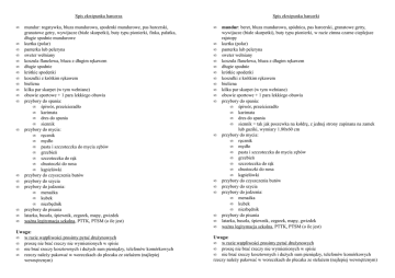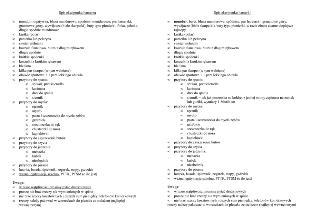 Spis ekwipunku harcerza • • • • • • • • • • • • • • • • • • • mundur: rogatywka, bluza mundurowa, spodenki mundurowe, pas harcerski, granatowe getry, wywijacze (białe skarpetki), buty typu pionierki, finka, pałatka, długie spodnie mundurowe kurtka (polar) panterka lub peleryna sweter wełniany koszula flanelowa, bluza z długim rękawem długie spodnie krótkie spodenki koszulki z krótkim rękawem bielizna kilka par skarpet (w tym wełniane) obuwie sportowe + 1 para lekkiego obuwia przybory do spania: • śpiwór, prześcieradło • karimata • dres do spania • siennik przybory do mycia: • ręcznik • mydło • pasta i szczoteczka do mycia zębów • grzebień • szczoteczka do rąk • chusteczki do nosa • kąpielówki przybory do czyszczenia butów przybory do szycia przybory do jedzenia: • menażka • kubek • niezbędnik przybory do pisania latarka, busola, śpiewnik, zegarek, mapy, gwizdek ważna legitymacja szkolna, PTTK, PTSM (o ile jest) Uwaga: • w razie wątpliwości prosimy pytać drużynowych • proszę nie brać rzeczy nie wymienionych w spisie • nie brać rzeczy kosztownych i dużych sum pieniędzy, telefonów komórkowych • rzeczy należy pakować w woreczkach do plecaka ze stelażem (najlepiej wewnętrznym) Spis ekwipunku harcerki • • • • • • • • • • • • • • • • • • • mundur: beret, bluza mundurowa, spódnica, pas harcerski, granatowe getry, wywijacze (białe skarpetki), buty typu pionierki, w razie zimna czarne cieplejsze rajstopy kurtka (polar) panterka lub peleryna sweter wełniany koszula flanelowa, bluza z długim rękawem długie spodnie krótkie spodenki koszulki z krótkim rękawem bielizna kilka par skarpet (w tym wełniane) obuwie sportowe + 1 para lekkiego obuwia przybory do spania: • śpiwór, prześcieradło • karimata • dres do spania • siennik = tak jak poszewka na kołdrę, z jednej strony zapinana na zamek lub guziki, wymiary 1.80x60 cm przybory do mycia: • ręcznik • mydło • pasta i szczoteczka do mycia zębów • grzebień • szczoteczka do rąk • chusteczki do nosa • kąpielówki przybory do czyszczenia butów przybory do szycia przybory do jedzenia: • menażka • kubek • niezbędnik przybory do pisania latarka, busola, śpiewnik, zegarek, mapy, gwizdek ważna legitymacja szkolna, PTTK, PTSM (o ile jest) Uwaga: • w razie wątpliwości prosimy pytać drużynowych • proszę nie brać rzeczy nie wymienionych w spisie • nie brać rzeczy kosztownych i dużych sum pieniędzy, telefonów komórkowych rzeczy należy pakować w woreczkach do plecaka ze stelażem (najlepiej wewnętrznym)