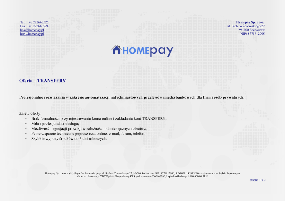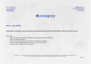 Tel.: +48 222668525 Fax: +48 222668524 [email protected] http://homepay.pl Homepay Sp. z o.o. ul. Stefana Żeromskiego 27 96-500 Sochaczew NIP: 8371812995 Oferta – TRANSFERY Profesjonalne rozwiązania w zakresie automatyzacji natychmiastowych przelewów międzybankowych dla firm i osób prywatnych. Zalety oferty: • Brak formalności przy rejestrowaniu konta online i zakładaniu kont TRANSFERY; • Miła i profesjonalna obsługa; • Możliwość negocjacji prowizji w zależności od miesięcznych obrotów; • Pełne wsparcie techniczne poprzez czat online, e-mail, forum, telefon; • Szybkie wypłaty środków do 3 dni roboczych; Homepay Sp. z o.o. z siedzibą w Sochaczewie przy ul. Stefana Żeromskiego 27, 96-500 Sochaczew, NIP: 8371812995, REGON: 145935280 zarejestrowana w Sądzie Rejonowym dla m. st. Warszawy, XIV Wydział Gospodarczy KRS pod numerem 0000406590, kapitał zakładowy: 1.000.000,00 PLN strona 1 z 2 Tel.: +48 222668525 Fax: +48 222668524 [email protected] http://homepay.pl Homepay Sp. z o.o. ul. Stefana Żeromskiego 27 96-500 Sochaczew NIP: 8371812995 Tabela opłat i prowizji Progi prowizji natychmiastowych przelewów międzybankowych przygotowane zostały w sposób optymalny i zapewniający równowagę rynku płatności natychmiastowych w Polsce. Zobacz jakie progi prowizji dla Ciebie przygotowaliśmy. Jeśli nie spełniają Twoich oczekiwań – skontaktuj się z nami i zapytaj o indywidualną ofertę! Obrót netto Prowizja dla Homepay 1 PLN - 25.000 PLN 1,50% 25.001 PLN - 50.000 PLN 1,25% 50.001 PLN + 1,00% Homepay Sp. z o.o. z siedzibą w Sochaczewie przy ul. Stefana Żeromskiego 27, 96-500 Sochaczew, NIP: 8371812995, REGON: 145935280 zarejestrowana w Sądzie Rejonowym dla m. st. Warszawy, XIV Wydział Gospodarczy KRS pod numerem 0000406590, kapitał zakładowy: 1.000.000,00 PLN strona 2 z 2