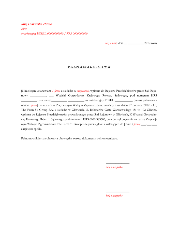 imię i nazwisko /firma adres nr ewidencyjny PESEL 00000000000 / KRS 0000000000 miejscowość, dnia __ __________ 2012 roku PEŁNOMOCNICTWO [Niniejszym ustanawiam / firma z siedzibą w miejscowość, wpisana do Rejestru Przedsiębiorców przez Sąd Rejonowy __________, ___ Wydział Gospodarczy Krajowego Rejestru Sądowego, pod numerem KRS __________ ustanawia] __________ __________, nr ewidencyjny PESEL ___________, [moim] pełnomocnikiem [firma] do udziału w Zwyczajnym Walnym Zgromadzeniu, zwołanym na dzień 27 czerwca 2012 roku, The Farm 51 Group S.A. z siedzibą w Gliwicach, ul. Bohaterów Getta Warszawskiego 15; 44-102 Gliwice, wpisana do Rejestru Przedsiębiorców prowadzonego przez Sąd Rejonowy w Gliwicach, X Wydział Gospodarczy Krajowego Rejestru Sądowego, pod numerem KRS 0000 383606, oraz do wykonywania na tymże Zwyczajnym Walnym Zgromadzeniu The Farm 51 Group S.A. prawa głosu z należących do [mnie / firma] ___.___.___ akcji tejże spółki. Pełnomocnik jest zwolniony z obowiązku zwrotu dokumentu pełnomocnictwa. _______________ imię i nazwisko _______________ imię i nazwisko