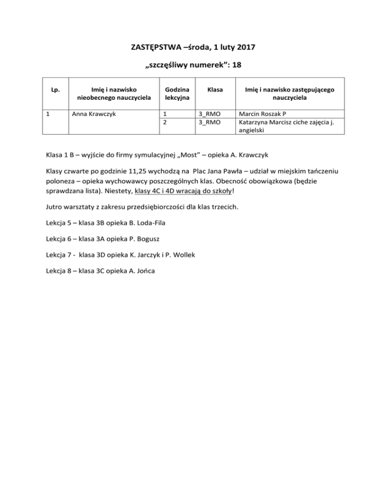 ZASTĘPSTWA –środa, 1 luty 2017 „szczęśliwy numerek”: 18 Lp. 1 Imię i nazwisko nieobecnego nauczyciela Anna Krawczyk Godzina lekcyjna 1 2 Klasa 3_RMO 3_RMO Imię i nazwisko zastępującego nauczyciela Marcin Roszak P Katarzyna Marcisz ciche zajęcia j. angielski Klasa 1 B – wyjście do firmy symulacyjnej „Most” – opieka A. Krawczyk Klasy czwarte po godzinie 11,25 wychodzą na Plac Jana Pawła – udział w miejskim tańczeniu poloneza – opieka wychowawcy poszczególnych klas. Obecność obowiązkowa (będzie sprawdzana lista). Niestety, klasy 4C i 4D wracają do szkoły! Jutro warsztaty z zakresu przedsiębiorczości dla klas trzecich. Lekcja 5 – klasa 3B opieka B. Loda-Fila Lekcja 6 – klasa 3A opieka P. Bogusz Lekcja 7 - klasa 3D opieka K. Jarczyk i P. Wollek Lekcja 8 – klasa 3C opieka A. Jońca