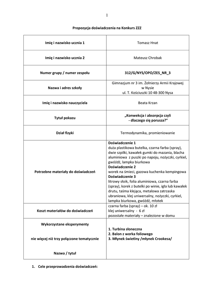 Propozycja doświadczenia na Konkurs ZZZ Imię i nazwisko ucznia 1