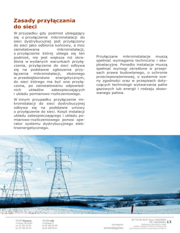 Zasady przyłączania do sieci W przypadku gdy podmiot ubiegający się o przyłączenie mikroinstalacji do sieci dystrybucyjnej jest przyłączony do sieci jako odbiorca końcowy, a moc zainstalowana mikroinstalacji, o przyłączenie której ubiega się ten podmiot, nie jest większa niż określona w wydanych warunkach przyłączenia, przyłączenie do sieci odbywa się na podstawie zgłoszenia przyłączenia mikroinstalacji, złożonego w przedsiębiorstwie energetycznym, do sieci którego ma być ona przyłączona, po zainstalowaniu odpowiednich układów zabezpieczających i układu pomiarowo-rozliczeniowego. Przyłączane mikroinstalacje muszą spełniać wymagania techniczne i eksploatacyjne. Ponadto instalacje muszą spełniać wymogi określone w przepisach prawa budowlanego, o ochronie przeciwporażeniowej, o systemie oceny zgodności oraz w przepisach dotyczących technologii wytwarzania paliw gazowych lub energii i rodzaju stosowanego paliwa. W innym przypadku przyłączenie mikroinstalacji do sieci dystrybucyjnej odbywa się na podstawie umowy o przyłączenie do sieci. Koszt instalacji układu zabezpieczającego i układu pomiarowo-rozliczeniowego ponosi operator systemu dystrybucyjnego elektroenergetycznego. 13 na podstawie zgłoszenia Procedura zgłoszenia ma zastosowanie do podmiotów spełniających łącznie następujące warunki: Przyłączenie dotyczy mikroinstalacji należącej do przyłączonego odbiorcy końcowego, Zainstalowana moc mikroinstalacji, która ma zostać przyłączona nie jest większa niż istniejąca moc określona dla tego odbiorcy końcowego. w trybie z wydaniem warunków przyłączenia Procedura ma zastosowanie do wszystkich pozostałych podmiotów nie spełniających wymagań do stosowania obok opisanego trybu przyłączenia na podstawie zgłoszenia. Poniżej procedury dla każdego z trybów. Właściciel mikroinstalacji winien informować operatora, do którego sieci jest przyłączone mikroźródło, o zmianie rodzaju mikroinstalacji oraz zainstalowanej mocy elektrycznej w mikroinstalacji, w terminie 14 dni od chwili zaistnienia tej zmiany. Dotyczy to zmiany tylko i wyłącznie w ramach przyznanej odbiorcy końcowemu mocy przyłączeniowej, określonej w wydanych mu warunkach przyłączenia. Według danych Urzędu Regulacji Energetyki na miesiąc marzec 2014 r. do sieci TAURON Dystrybucja S.A. przyłączono 18 mikroinstalacji, kolejne 90 ubiegało się o przyłączenie, z czego 50 to osoby fizyczne. PGE Dystrybucja przyłączyła 12 mikroinstalacji, w tym 10 od osób fizycznych, a na akceptację czekają 172 wnioski. Z kolei ENEA Operator uruchomiła 58 mikroinstalacji osób fizycznych i 19 firmowych. 14 Wykonanie mikroinstalacji we własnym zakresie przez podmiot przyłączany Zgłoszenie wykonanej instalacji do operatora celem przyłączenia Złożenie wniosku o określenie warunków przyłączenia Wydanie warunków przyłączenia. •Warunki przyłączenia określają m.in. szczegółowe wymagania dot. przyłączanej instalacji oraz przyłącza. Potwierdzenie przyjęcia zgłoszenia. •Operator potwierdza przyjęcie zgłoszenia w terminie 30 dni od otrzymania kompletnego zgłoszenia. W potwierdzeniu zgłoszenia wskazywany jest przewidywany termin przyłączenia. Zainstalowanie przez Operatora odpowiedniego układu zabezpieczającego i układu pomiaroworozliczeniowego. Zawarcie umowy o przyłączenie do sieci. Realizacja zobowiązań wynikających z umowy o przyłączenie do sieci, w tym wykonanie mikroinstalacji we własnym zakresie przez podmiot ubiegający się o przyłączenie oraz niezbędnej przebudowy sieci 15 Budowa instalacji fotowoltaicznych Konieczność uzyskania pozwolenia na budowę zależy od parametrów planowanej inwestycji, jak również od tego, w jaki sposób instalacje PV zostaną posadowione. Zgodnie z brzmieniem Prawa budowlanego, obowiązującego od 11 września 2013 r., pozwolenia na budowę ani zgłoszenia nie wymaga wykonywanie robót budowlanych polegających na montażu urządzeń fotowoltaicznych o zainstalowanej mocy elektrycznej do 40 kW. Nowe przepisy nie wskazują jednak, czy urządzenia PV wchodzące w skład farmy PV mogą być budowane bez pozwolenia na budowę, o ile każde z nich ma moc do 40 kW, czy ich łączna moc ma wynosić do 40 kW. Przepisy prawa nie definiują też ani urządzenia fotowoltaicznego ani kolektora słonecznego. Pomimo zmian wprowadzonych od 11 września 2013 r., jeśli inwestycja obejmuje, oprócz budowy urządzeń PV także niezbędną infrastrukturę, uzyskanie pozwolenia na budowę w praktyce i tak może okazać się konieczne. Odnosząc się natomiast do projektowanej ustawy o OZE, należy zaznaczyć, że utrzyma ona w Prawie budowlanym przepis stanowiący, że pozwolenie budowlane nie będzie wymagane, ale tylko w przypadku mikroinstalacji PV, czyli systemów o mocy nominalnej do 40 kW. Implementowanie takiego zapisu oznacza, że na budowę instalacji fotowoltaicznych większych niż 40 kW może być wymagane pozwolenie na budowę. 16 Planowanie przestrzenne Podstawowym tytułem planistycznym jest miejscowy plan zagospodarowania przestrzennego. Plan, jako prawo miejscowe, jest nadrzędny w stosunku do decyzji planistycznych o warunkach zagospodarowania przestrzennego oraz o lokalizacji celu publicznego. W przypadku, gdy teren jest objęty zapisami miejscowego planu zagospodarowania przestrzennego, planowana inwestycja PV musi spełniać wymogi tego planu, czyli może być realizowana jedynie na obszarze, na którym przewidziano działalność produkcyjną, a więc nie na terenach przeznaczonych pod usługi czy zabudowę mieszkaniową. Jeżeli teren inwestycyjny został przeznaczony na inne cele niż produkcyjne, inwestor może wystąpić o zmianę planu zagospodarowania przestrzennego w tym zakresie. Jeżeli na obszarze gminy przewiduje się wyznaczenie terenów, na których rozmieszczone będą urządzenia wytwarzające energię o mocy przekraczającej 100 kW, należy w gminn