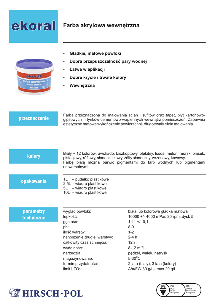 Farba akrylowa wewnêtrzna ? G³adkie, matowe pow³oki ? Dobra przepuszczalnoœæ pary wodnej ? £atwa w aplikacji ? Dobre krycie i trwa³e kolory ? Wewnêtrzna przeznaczenie kolory Farba przeznaczona do malowania œcian i sufitów oraz tapet, p³yt kartonowogipsowych i tynków cementowo-wapiennych wewn¹trz pomieszczeñ. Zapewnia estetyczne matowe wykoñczenie powierzchni i d³ugotrwa³y efekt malowania. Bia³y + 12 kolorów: awokado, biszkoptowy, b³êkitny, ³osoœ, melon, morski piasek, pistacjowy, ró¿owy, s³onecznikowy, ¿ó³ty s³oneczny, wrzosowy, kawowy. Farbê bia³¹ mo¿na barwiæ pigmentami do farb wodnych lub pigmentami uniwersalnymi. opakowania 1L – pude³ko plastikowe 2,5L – wiadro plastikowe 5L – wiadro plastikowe 10L – wiadro plastikowe parametry techniczne wygl¹d pow³oki: lepkoœæ: gêstoœæ: ph: iloœæ warstw: nanoszenie drugiej warstwy: ca³kowity czas schniêcia: wydajnoœæ: narzêdzia: magazynowanie: termin przydatnoœci: limit LZO: bia³a lub kolorowa g³adka matowa 10000 +/- 4000 mPas 20 rpm, dysk 5 1,41 +/- 0,1 8-9 1-2 2-4 h 12h 8-12 m2/l pêdzel, wa³ek, natrysk 5-30OC 2 lata (bia³y), 3 lata (kolory) A/a/FW 30 g/l – max 29 g/l przygotowanie pod³o¿a Pod³o¿e musi byæ czyste, suche i odt³uszczone, oczyszczone z py³u i luŸno z nim zwi¹zanych elementów. Nale¿y usun¹æ wszelkie zanieczyszczenia ograniczaj¹ce przyczepnoœæ farby do pod³o¿a za pomoc¹ odpowiednich preparatów. Do wype³nienia pêkniêæ i ubytków w pod³o¿u oraz wyrównania powierzchni nale¿y zastosowaæ odpowiedni¹ masê szpachlow¹. Upewniæ siê, czy wszystkie powierzchnie szpachlowane lub wczeœniej malowane farb¹ z po³yskiem zosta³y zmatowione. Sypkie i bardzo ch³onne pod³o¿a zagruntowaæ preparatem o w³asnoœciach wi¹¿¹cych pod³o¿a. Powierzchnie przygotowane do malowania powinny byæ g³adkie i o jednolitej ch³onnoœci. Przed przyst¹pieniem do malowania farbê nale¿y dok³adnie wymieszaæ, nie rozcieñczaæ wod¹. Rozcieñczenie spowoduje obni¿enie lub utratê parametrów technicznych farby. W zale¿noœci od ch³onnoœci pod³o¿a nale¿y na³o¿yæ 1 – 2 warstwy farby za pomoc¹ pêdzla, wa³ka lub metod¹ natrysku. Dla kolorów o szczególnie s³abej sile krycia mo¿e nast¹piæ koniecznoœæ na³o¿enia dodatkowych warstw. W temperaturze 23OC i przy wilgotnoœci wzglêdnej powietrza 50% farba schnie ok. 2 godziny. Miêdzy nak³adaniem kolejnych warstw nale¿y zachowaæ co najmniej 4-godzinny odstêp czasu. Nie usuwaæ razem z odpadami gospodarczymi, nie wylewaæ do kanalizacji. Odpady ka¿dorazowo powinny zostaæ zagospodarowane zgodnie z obowi¹zuj¹cymi przepisami krajowymi dotycz¹cymi odpadów. Szczegó³owe informacje zosta³y zawarte w Karcie charakterystyki wyrobu. œrodki bezpieczeñstwa Chroniæ oczy i skórê, w razie kontaktu natychmiast zmyæ wod¹. Przechowywaæ w miejscach niedostêpnych dla dzieci. Os³oniæ otoczenie malowanych powierzchni. Ewentualne zabrudzenia usuwaæ nie czekaj¹c na wyschniêcie. Szczegó³owe informacje zosta³y zawarte w Karcie charakterystyki wyrobu.