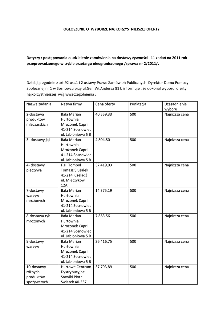 OGŁOSZENIE O WYBORZE NAJKORZYSTNIEJSZEJ OFERTY Dotyczy : postępowania o udzielenie zamówienia na dostawy żywności - 11 zadań na 2011 rok przeprowadzonego w trybie przetargu nieograniczonego /sprawa nr 2/2011/. Działając zgodnie z art.92 ust.1 i 2 ustawy Prawo Zamówień Publicznych Dyrektor Domu Pomocy Społecznej nr 1 w Sosnowcu przy ul.Gen.Wł.Andersa 81 b informuje , że dokonał wyboru oferty najkorzystniejszej w/g wyszczególnienia : Nazwa zadania Nazwa firmy Cena oferty Punktacja 2-dostawa produktów mleczarskich Bała Marian Hurtownia Mrożonek Capri 41-214 Sosnowiec ul. Jabłoniowa 5 B Bała Marian Hurtownia Mrożonek Capri 41-214 Sosnowiec ul. Jabłoniowa 5 B F.H Tompol Tomasz Służałek 41-214 Czeladź ul. Mieczyków 12A Bała Marian Hurtownia Mrożonek Capri 41-214 Sosnowiec ul. Jabłoniowa 5 B Bała Marian Hurtownia Mrożonek Capri 41-214 Sosnowiec ul. Jabłoniowa 5 B Bała Marian Hurtownia Mrożonek Capri 41-214 Sosnowiec ul. Jabłoniowa 5 B Hurtowe Centrum Dystrybucyjne Stawiki Piotr Światek 40-337 40 559,33 500 Uzasadnienie wyboru Najniższa cena 4 804,80 500 Najniższa cena 37 419,03 500 Najniższa cena 14 375,19 500 Najniższa cena 7 863,56 500 Najniższa cena 26 416,75 500 Najniższa cena 37 793,89 500 Najniższa cena 3- dostawy jaj 4- dostawy pieczywa 7-dostawy warzyw mrożonych 8-dostawa ryb mrożonych 9-dostawy warzyw 10-dostawy różnych produktów spożywczych 11- dostawa ziemniaków Katowice ul. Sosnowiecka 17 Bała Marian Hurtownia Mrożonek Capri 41-214 Sosnowiec ul. Jabłoniowa 5 B 14 794,50 500 Pozostałe oferty złożone w postępowaniu niepodlegające odrzuceniu : Nazwa zadania 2-dostawa produktów mleczarskich Nazwa firmy Cena oferty Hurtowe Centrum Dystrybucyjne Stawiki Piotr Światek 40-337 Katowice ul. Sosnowiecka 17 42 010,33 Punktacja 482,75 2-dostawa produktów mleczarskich Hurtowe Centrum Nabiału mgr inż. Włodzimierz Natkaniec 40-833 Katowice ul. Dulęby 5 Hurtowe Centrum Nabiału mgr inż. Włodzimierz Natkaniec 40-833 Katowice ul. Dulęby 5 Bała Marian Hurtownia Mrożonek Capri 41-214 Sosnowiec ul. Jabłoniowa 5 B FHU Kaprys Surmański Wiesław 41-940 PiekaryŚląskie ul.Bytomska 86 Bała Marian Hurtownia 53 710,36 377,60 5544 433,30 38 050,87 491,70 28 289,87 466,90 40 600,05 465,45 3- dostawy jaj 4- dostawy pieczywa 9-dostawy warzyw 10-różne produkty Najniższa cena spożywcze 11- dostawa ziemniaków 11- dostawa ziemniaków 11- dostawa ziemniaków Mrożonek Capri 41-214 Sosnowiec ul. Jabłoniowa 5 B 15 288 FHU Kaprys Surmański Wiesław 41-940 Piekary Śląskie Gospodarstwo Rolne Dziubek 32-353 Trzyciąż Hurtowe Centrum Dystrybucyjne Stawiki Piotr Świątek 40-337 Katowice ul. Sosnowiecka 17 483,85 15 800,40 468,15 19 173 385,80 Działając zgodnie z art.93 ust.1 pkt 1 ustawy Prawo Zamówień Publicznych Dyrektor Domu Pomocy Społecznej nr 1 w Sosnowcu przy ul.Gen.Wł.Andersa 81 b informuje , że unieważnia postępowanie na zadania : Nazwa zadania 1- dostawa mięsa 5- dostawa drobiu Nazwa Firmy Krak Mięs Jarosław Naruszewicz 31-752 Kraków ul. Makuszyńskiego 2 A Zakład Przetwórstwa Drobiu Marica 43-300 Bielsko - Biała ul. Straconki 20 Uzasadnienie odrzucenia błędny podatek VAT na dzień złożenia oferty : oferta złożona 29.12.2010 stawka podatku VAT 5% obowiązujący 3% oferta odrzucona : błąd w obliczeniu ceny odrzucono na podstawie art.89 ust.1 pkt 6 ustawy PZP błędny podatek VAT na dzień złożenia oferty : oferta złożona 16.12.2010 stawka podatku VAT 5% obowiązujący 3% oferta odrzucona : Postępowanie unieważnione nie złożono żadnej oferty niepodlegającej odrzuceniu nie złożono żadnej oferty niepodlegającej odrzuceniu 6- dostawa wędlin Krak Mięs Jarosław Naruszewicz 31-752 Kraków ul. Makuszyńskiego 2 A błąd w obliczeniu ceny odrzucono na podstawie art.89 ust.1 pkt 6 ustawy PZP błędny podatek VAT na dzień złożenia oferty : oferta złożona 29.12.2010 stawka podatku VAT 5% obowiązujący 3% oferta odrzucona : błąd w obliczeniu ceny odrzucono na podstawie art.89 ust.1 pkt 6 ustawy PZP nie złożono żadnej oferty niepodlegającej odrzuceniu Pozostałe oferty odrzucone : Piekarnia Witold Lipianin 49-351 Przylesie 32 ferta złożona na część 4 - dostawy pieczywa cena oferty : 23 577,27 zł Oferta odrzucona na podstawie art.89 ust.1 pkt.4 tj. zawiera rażąco niską cenę w stosunku do przedmiotu zamówienia tj. Podana cena jest nierealistyczna w porównaniu do cen rynkowych podobnych zamówień. Cena wynikająca z oferty jest niższa o 40 % niż wartość przedmiotu zamówienia, a złożone wyjaśnienia są niewystarczające i nie dają podstawy do uznania iż Wykonawca wywiąże sie z przedmiotu zamówienia. Sosnowiec dnia 17.01.2011 r. Podpisał mgr Elżbieta Matuszczyk
