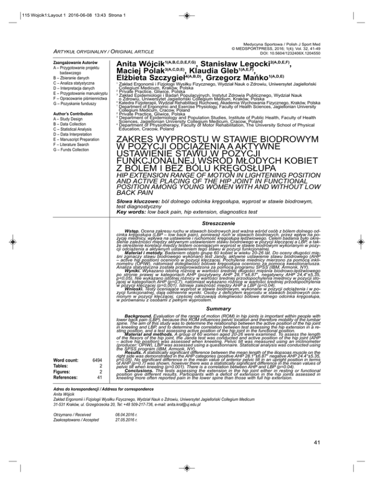 115 Wojcik1:Layout 1 2016-06-08 13:43 Strona 1 Medycyna Sportowa / Polish J Sport Med © MEDSPORTPRESS, 2016; 1(4); Vol. 32, 41-49 DOI: 10.5604/1232406X.1204550 ARTYKUŁ ORYGINALNY / ORIGINAL ARTICLE Zaangażowanie Autorów A – Przygotowanie projektu badawczego B – Zbieranie danych C – Analiza statystyczna D – Interpretacja danych E – Przygotowanie manuskryptu F – Opracowanie piśmiennictwa G – Pozyskanie funduszy Author’s Contribution A – Study Design B – Data Collection C – Statistical Analysis D – Data Interpretation E – Manuscript Preparation F – Literature Search G – Funds Collection Anita Wójcik1(A,B,C,D,E,F,G), Stanisław Legocki2(A,D,E,F), Maciej Polak3(A,C,D,E), Klaudia Gleb1(A,E,F), Elżbieta Szczygieł4(A,B,D), Grzegorz Mańko1(A,D,E) 1 Zakład Ergonomii i Fizjologii Wysiłku Fizycznego, Wydział Nauk o Zdrowiu, Uniwersytet Jagielloński Collegium Medicum, Kraków, Polska Private Practice, Gliwice, Polska 3 Zakład Epidemiologii i Badań Populacyjnych, Instytut Zdrowia Publicznego, Wydział Nauk o Zdrowiu, Uniwersytet Jagielloński Collegium Medium, Kraków, Polska 4 Katedra Fizjoterapii, Wydział Rehabilitacji Ruchowej, Akademia Wychowania Fizycznego, Kraków, Polska 1 Department of Ergonomic and Exercise Physiology, Faculty of Health Sciences, Jagiellonian University Collegium Medicum, Cracow, Poland 2 Private Practice, Gliwice, Polska 3 Department of Epidemiology and Population Studies, Institute of Public Health, Faculty of Health Sciences, Jagiellonian University Collegium Medicum, Cracow, Poland 4 Department of Physiotherapy, Faculty of Motor Rehabilitation, The University School of Physical Education, Cracow, Poland 2 ZAKRES WYPROSTU W STAWIE BIODROWYM W POZYCJI ODCIĄŻENIA A AKTYWNE USTAWIENIE STAWU W POZYCJI FUNKCJONALNEJ WŚRÓD MŁODYCH KOBIET Z BÓLEM I BEZ BÓLU KRĘGOSŁUPA HIP EXTENSION RANGE OF MOTION IN LIGHTENING POSITION AND ACTIVE PLACING OF THE HIP JOINT IN FUNCTIONAL POSITION AMONG YOUNG WOMEN WITH AND WITHOUT LOW BACK PAIN Słowa kluczowe: ból dolnego odcinka kręgosłupa, wyprost w stawie biodrowym, test diagnostyczny Key words: low back pain, hip extension, diagnostics test Streszczenie Wstęp. Ocena zakresu ruchu w stawach biodrowych jest ważna wśród osób z bólem dolnego odcinka kręgosłupa (LBP – low back pain), ponieważ ruch w stawach biodrowych, przez wpływ na pozycję miednicy, wpływa na ustawienie i ruchomość kręgosłupa lędźwiowego. Celem badania było określenie zależności między aktywnym ustawieniem stawu biodrowego w pozycji klęczącej a LBP, a także określenie korelacji między testem oceniającym wyprost w stawie biodrowym wykonanym w pozycji odciążenia a aktywnym ustawieniem tego stawu w pozycji funkcjonalnej. Materiał i metody. Badaniem objęto grupę 60 kobiet w wieku 20-26 lat. Do oceny długości mięśni zginaczy stawu biodrowego wykonano test Jandy, aktywne ustawienie stawu biodrowego (AHP – active hip position) oceniono w pozycji klęczącej. Pochylenie miednicy mierzono za pomocą inklinometru (OPIW), natomiast dolegliwości bólowe kręgosłupa oceniono za pomocą kwestionariusza. Analiza statystyczna została przeprowadzona za pomocą programu SPSS (IBM, Armonk, NY). Wyniki. Wykazano istotną różnicę w wartości średniej długości mięśnia biodrowo-lędźwiowego po stronie prawej w kategoriach AHP (pozytywny AHP 28,1°±6,87°, negatywny AHP 24,4°±5,35, p<0,05). Nie wykazano istotnej różnicy w wartości średniej przodopochylenia miednicy w pozycji stojącej w kategoriach AHP (p=0,7), natomiast wykazano różnicę w wartości średniej przodopochylenia w pozycji klęczącej (p=0,001). Istnieje zależność między AHP a LBP (p=0,04). Wnioski. Testy oceniające wyprost w stawie biodrowym, wykonane w pozycji odciążenia i w pozycji funkcjonalnej, dają odmienne wyniki. Osoby z deficytem wyprostu w stawach biodrowych ocenionym w pozycji klęczącej, częściej odczuwają dolegliwości bólowe dolnego odcinka kręgosłupa, w porównaniu z osobami z pełnym wyprostem. Summary Word count: Tables: Figures: References: 6494 2 2 41 Background. Evaluation of the range of motion (ROM) in hip joints is important within people with lower back pain (LBP), because this ROM influences pelvic location and therefore mobility of the lumbar spine. The aim of this study was to determine the relationship between the active position of the hip joint in kneeling and LBP, and to determine the correlation between test assessing the hip extension in a resting position, and a test assessing active position of the hip joint in the functional position. Material and methods. A group of 60 women aged 20-26 were examined. To assess the length of the flexors of the hip joint, the Janda test was conducted and active position of the hip joint (AHP – active hip position) was assessed when kneeling. Pelvic tilt was measured using an inclinometer (producer: OPIW), LBP was assessed using a questionnaire. Statistical analysis was conducted using the SPSS program (IBM, Armonk, NY). Results. A statistically significant difference between the mean length of the iliopsoas muscle on the right side was demonstrated in the AHP categories (positive AHP 28.1°±6.87° negative AHP 24.4°±5.35, p<0.05). No significant difference in the mean value of anterior pelvic tilt in an upright position in terms of AHP (p=0.7) was shown, however there was a statistically significant difference in the mean values of pelvic tilt when kneeling (p=0.001). There is a correlation between AHP and LBP (p=0.04). Conclusions. The tests assessing the extension in the hip joint either in resting or functional position give different results. Participants with a deficit of extension in the hip joints assessed in kneeling more often reported pain in the lower spine than those with full hip extension. Adres do korespondencji / Address for correspondence Anita Wójcik Zakład Ergonomii i Fizjologii Wysiłku Fizycznego, Wydział Nauk