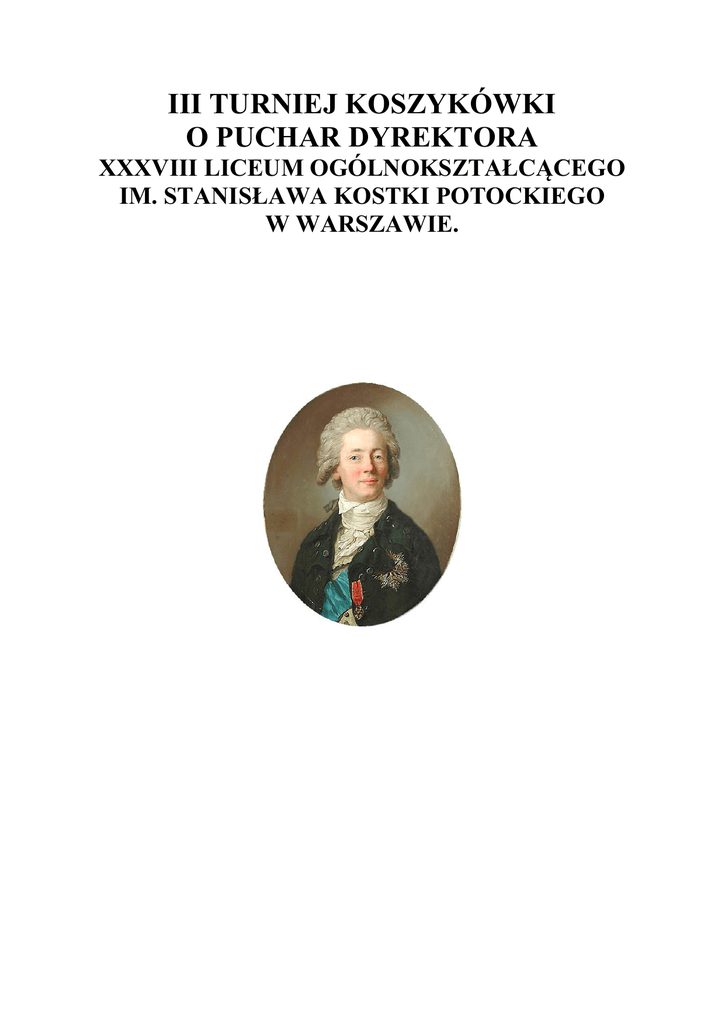 III TURNIEJ KOSZYKÓWKI O PUCHAR DYREKTORA XXXVIII LICEUM OGÓLNOKSZTAŁCĄCEGO IM. STANISŁAWA KOSTKI POTOCKIEGO W WARSZAWIE. § 1. ORGANIZATOR XXXVIII Liceum Ogólnokształcące im. Stanisława Kostki Potockiego w Warszawie , ul. Wiertnicza 26 , 02-952 Warszawa § 2. CELE TURNIEJU 1. Propagowanie sportu. 2. Aktywne spędzanie czasu przez młodzież. 3. Umożliwienie rywalizacji sportowej uczniom. 4. Propagowanie idei fair-play. § 3. TERMIN I MIEJSCE 1. Termin – 21 kwietnia 2015 r 2. Oficjalne rozpoczęcie zawodów godzina 9:45. 3. Miejsce – Hala sportowa Zespołu Szkół nr 79. ul. Wiertnicza 26 § 4. UCZESTNICTWO Skład drużyny 8 osób ( 5 w polu + 3 rezerwa). W jednym zespole mogą grać uczniowie tylko z tej samej klasy. W skład drużyny wchodzić mogą chłopcy i dziewczęta. § 5. ZASADY GRY , SYSTEM ROZGRYWEK Zasady gry: Obowiązują zasady gry FIBA (Międzynarodowa Federacja Piłki Koszykowej), bez 24 sek. Zasady punktowania : Zwycięstwo – 2 pkt Remis – 1 pkt Przegrana – 0 pkt System rozgrywek zostanie ustalony po zamknięciu zgłoszeń. O awansie decyduje ilość zdobytych punktów. W wypadku , gdy dwa zespoły mają taką samą liczbę punktów decydują tzw. „Małe punkty” §6. NAGRODY - Najlepsze 3 drużyny otrzymują pamiątkowe medale. - Najlepsza drużyna otrzymuje puchar. - Najlepszy zawodnik turnieju (MVP) otrzymuje statuetkę oraz upominek. § 7. OBOWIAZKI ORGANIZATORA Do obowiązków organizatora turnieju należy: Przygotowanie i przeprowadzenie turnieju zgodnie z regulaminem. Wyznaczenie sędziów. Zapewnienie opieki medycznej. Zapewnienie nagród.