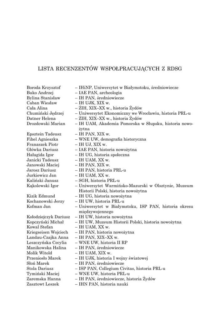LISTA RECENZENTÓW WSPOŁPRACUJĄCYCH Z RDSG Boroda Krzysztof Buko Andrzej Bylina Stanisław Caban Wiesław Cała Alina Chumiński Jędrzej Datner Helena Drozdowski Marian – – – – – – – – Epsztein Tadeusz Fihel Agnieszka Franaszek Piotr Główka Dariusz Hałagida Igor Janicki Tadeusz Janowski Maciej Jarosz Dariusz Jurkiewicz Jan Kaliński Janusz Kąkolewski Igor – – – – – – – – – – – Kizik Edmund Kochanowski Jerzy Kofman Jan – – – Kołodziejczyk Dariusz Kopczyński Michał Kowal Stefan Kriegseisen Wojciech Landau-Czajka Anna Leszczyńska Cecylia Manikowska Halina Molik Witold Przeniosło Marek Słoń Marek Stola Dariusz Tymiński Maciej Zaremska Hanna Zasztowt Leszek – – – – – – – – – – – – – – IHiNP, Uniwersytet w Białymstoku, średniowiecze IAE PAN, archeologia IH PAN, średniowiecze IH UJK, XIX w. ŻIH, XIX–XX w., historia Żydów Uniwersytet Ekonomiczny we Wrocławiu, historia PRL-u ŻIH, XIX–XX w., historia Żydów IH UAM, Akademia Pomorska w Słupsku, historia nowożytna IH PAN, XIX w. WNE UW, demografia historyczna IH UJ, XIX w. IAE PAN, historia nowożytna IH UG, historia społeczna IH UAM, XX w. IH PAN, XIX w. IH PAN, historia PRL-u IH UAM, XX w. SGH, historia PRL-u Uniwersytet Warmińsko-Mazurski w Olsztynie, Muzeum Historii Polski, historia nowożytna IH UG, historia nowożytna IH UW, historia PRL-u Uniwersytet w Białymstoku, ISP PAN, historia okresu międzywojennego IH UW, historia nowożytna IH UW, Muzeum Historii Polski, historia nowożytna IH UAM, XX w. IH PAN, historia nowożytna IH PAN, XIX–XX w. WNE UW, historia II RP IH PAN, średniowiecze IH UAM, XIX w. IH UJK, historia I wojny światowej IH PAN, średniowiecze ISP PAN, Collegium Civitas, historia PRL-u WNE UW, historia PRL-u IH PAN, średniowiecze, historia Żydów IHN PAN, historia nauki