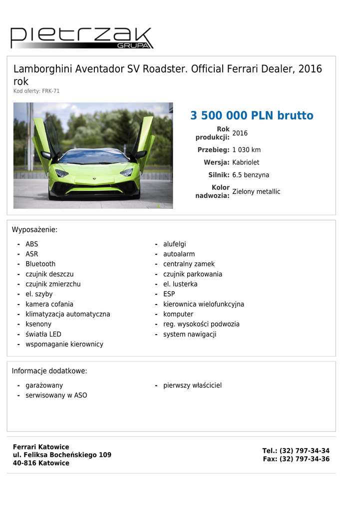 Lamborghini Aventador SV Roadster. Official Ferrari Dealer, 2016 rok Kod oferty: FRK-71 3 500 000 PLN brutto Rok 2016 produkcji: Przebieg: 1 030 km Wersja: Kabriolet Silnik: 6.5 benzyna Kolor Zielony metallic nadwozia: Wyposażenie: - ABS ASR Bluetooth czujnik deszczu czujnik zmierzchu el. szyby kamera cofania klimatyzacja automatyczna ksenony światła LED wspomaganie kierownicy - alufelgi autoalarm centralny zamek czujnik parkowania el. lusterka ESP kierownica wielofunkcyjna komputer reg. wysokości podwozia system nawigacji Informacje dodatkowe: - garażowany - serwisowany w ASO Ferrari Katowice ul. Feliksa Bocheńskiego 109 40-816 Katowice - pierwszy właściciel Tel.: (32) 797-34-34 Fax: (32) 797-34-36