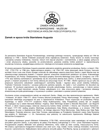 ZAMEK KRÓLEWSKI W WARSZAWIE - MUZEUM REZYDENCJA KRÓLÓW I RZECZYPOSPOLITEJ Zamek w epoce króla Stanisława Augusta Za panowania Stanisława Augusta Poniatowskiego, ostatniego polskiego monarchy, sprawującego władzę od 1764 do abdykacji w 1795 r. Zamek Królewski przeżywał okres największej świetności. Kwoty łożone ze skarbu koronnego i prywatnej szkatuły królewskiej, mecenat, którym król otaczał artystów i rzemieślników, a także poglądy polityczne i smak artystyczny władcy, pozwoliły na przekształcenie „prastarej siedziby królów polskich” w reprezentacyjną rezydencję monarszą, uwzględniającą estetyczne i ideologiczne koncepcje oświecenia europejskiego. W okresie panowania Stanisława Augusta powstało jedenaście projektów generalnej przebudowy Zamku: w latach 17641767, 1776-1779 i w 1788 roku. Najwcześniejsze projekty z lat 1764-1767, które opracowali Jakub Fontana, francuski architekt Victor Louis oraz Efraim Szreger zmierzały do całkowitego zatarcia starej bryły Zamku z epoki Wazów oraz do urbanistycznego powiązania budowli z miastem poprzez stworzenie dziedzińców paradnych od strony Krakowskiego Przedmieścia, ulic Piwnej i Świętojańskiej. Późniejsze projekty Dominika Merliniego (oraz jeden E. Szregera) z lat 17761779, były bardziej zachowawcze: sprowadzały się do utrzymania dawnej bryły Zamku, a układ przestrzenny, wiążący gmach z miastem przybierał w nich formę zbliżoną do antycznego forum. W 1788 r. Merlini ograniczył się już tylko do propozycji wyburzenia zabudowań zasłaniających zachodnią fasadę i regulacji placu przed siedzibą królewską. Trudności finansowe monarchy i sytuacja polityczna państwa sprawiły, że żaden z tych projektów nie doczekał się realizacji. W rezultacie poprzestano na odbudowie skrzydła południowego Zamku, uszkodzonego w trakcie pożaru 12 marca 1767 (pod kierunkiem Jakuba Fontany odbudowano m.in. dwa zniszczone piętra i wzniesiono elewację dziedzińcową skrzydła południowego z trzyosiowym ryzalitem i podziałami w postaci jońskich pilastrów). Gruntowne zmiany przeprowadzono jednak we wnętrzach Zamku. Objęły one dwa reprezentacyjne apartamenty: Wielki i Królewski. W latach 1768-1771 Jakub Fontana dokonał przebudowy Pokoju Marmurowego. W następnym roku pod kierunkiem Merliniego przystąpiono do prac w Apartamencie Królewskim. Prace rozpoczęto od przebudowy Pokoju Sypialnego, w latach 1774-1777 urządzono Pokój Audiencjonalny, Salę Prospektową (zwaną tak ze względu na znajdujące się tu widoki Bernarda Belotta) i Kaplicę. Obok Merliniego działali tu Marcello Bacciarelli i Jan Bogumił Plersch, a także rozpoczynający wówczas artystyczną karierę młody architekt z Drezna Jan Chrystian Kamsetzer. W latach 1777-1781 według projektu Merliniego przebudowano Salę Wielką (Asamblową), a w okresie 1783-1786 przystąpiono do prac w Apartamencie Wielkim, do którego włączono Pokój Marmurowy, Salę Wielką oraz Salę Rady Nieustającej. Powstała wówczas nowa Sala Tronowa, poprzedzający ją Przedpokój Senatorski zwany Salą Rycerską (wg projektu D. Merliniego i J. Ch. Kamsetzera) oraz położony na zakończeniu Apartamentu Wielkiego Gabinet Monarchów Europejskich. Od podstaw zbudowano gmach Biblioteki Królewskiej (1778-1782), wykorzystując teren sąsiadujący od wschodu ze skrzydłem gotyckim Zamku, a przynależny do pałacu Pod Blachą (zakupionego w 1776 r. przez Stanisława Augusta). Przygotowanie projektu Biblioteki król powierzył Merliniemu, który nadał jej dość surową, klasycystyczną formę. We wnętrzu zgromadzono księgozbiór królewski oraz zbiór rycin, map, medali, monet, kolekcję minerałów, instrumenty fizyczne i astronomiczne. Nadbudowano także północne skrzydło pałacu Pod Blachą, łącząc je przejściami z głównym pomieszczeniem Biblioteki. Zlokalizowano tam gabinety, będące miejscem pracy uczonych, m.in. Gabinet Medali pomieszczeniem Biblioteki. Zlokalizowano tam gabinety, będące miejscem pracy uczonych, m.in. Gabinet Medali i Starożytności. Choć realizacja ambitnych projektów przebudowy Zamku i jego otoczenia z pierwszych lat panowania nie powiodła się, przekształcenia wnętrz zamkowych dokonane przez Stanisława Augusta nadały im wysokiej klasy formę artystyczną, tak iż śmiało mogły one konkurować z najważniejszymi ośrodkami władzy królewskiej w Europie, utrzymując jednocześnie ich specyfikę, wyrażającą się w afirmacji polskiej tradycji republikańskiej. oprac.: A. Sołtys Zamek Królewski w Warszawie - Muzeum. Rezydencja Królów i Rzeczypospolitej www.zamek-krolewski.pl